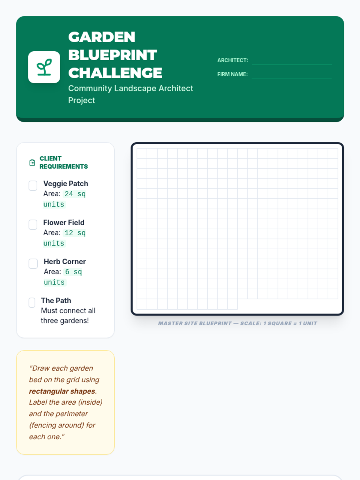 A project-based 3rd Grade math unit where students act as landscape architects to master perimeter and area. Through 5 lessons, students progress from measuring physical boundaries to designing a complex community garden blueprint, distinguishing between linear distance and 2-dimensional space.
