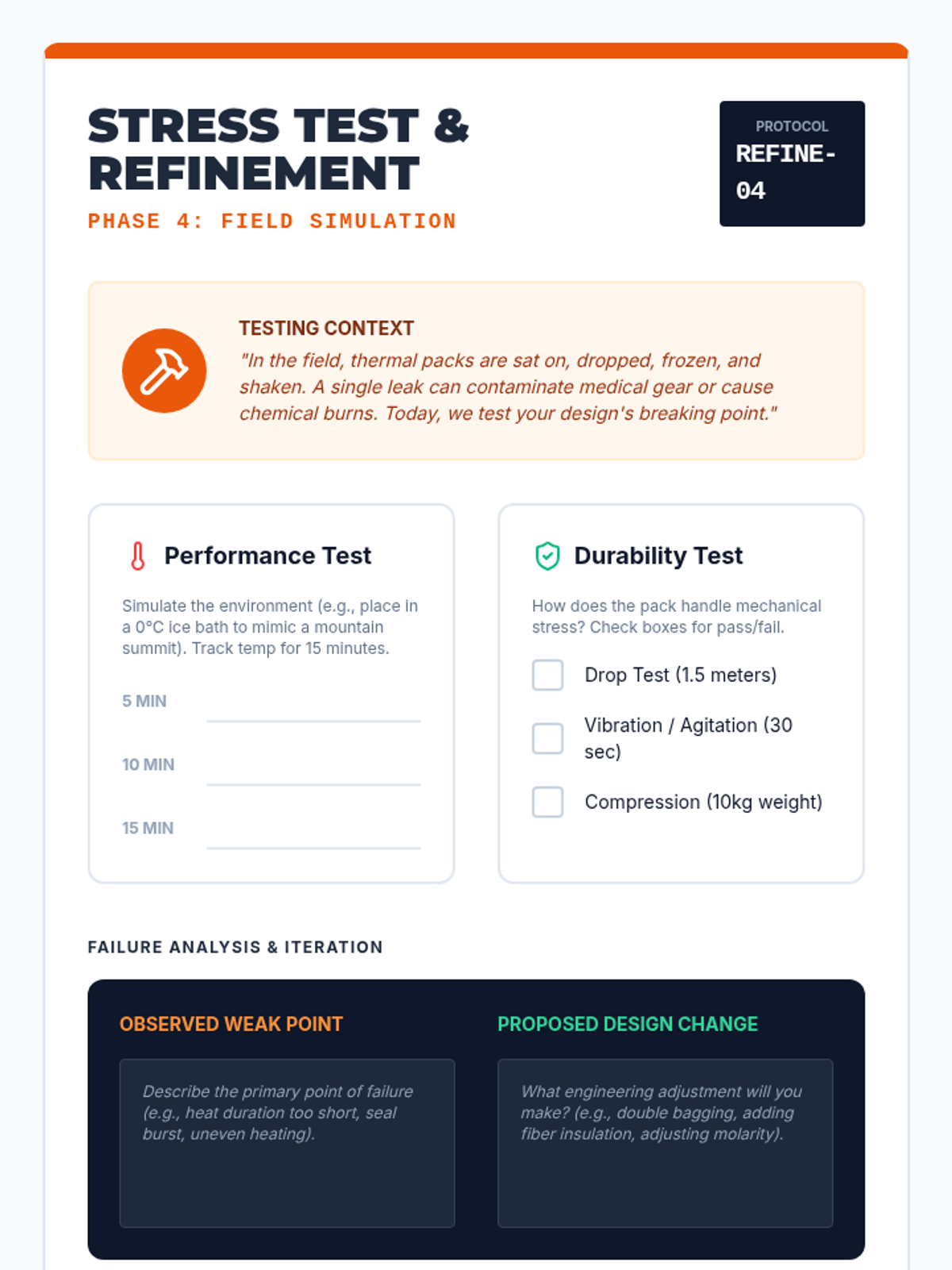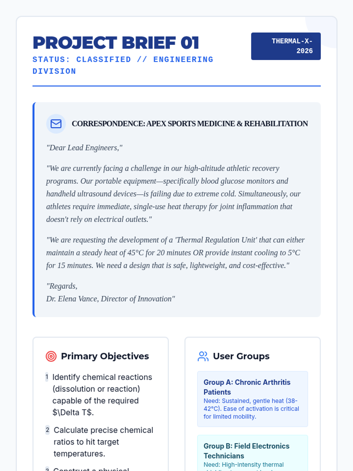 A 12th-grade project-based chemistry sequence where students design, prototype, and pitch a chemical thermal regulation device. They apply thermodynamics, enthalpy calculations, and safety analysis to meet specific user needs.