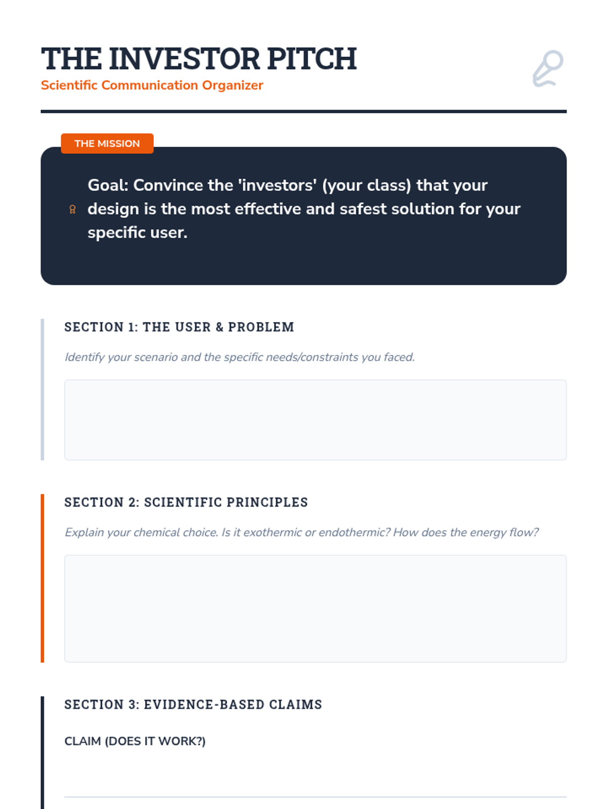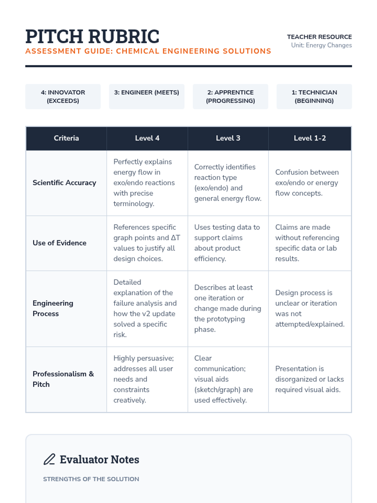 A project-based unit where 7th-grade students act as chemical engineers to design, prototype, and test chemical thermal packs. They explore exothermic and endothermic reactions through the engineering design process, culminating in a product pitch.