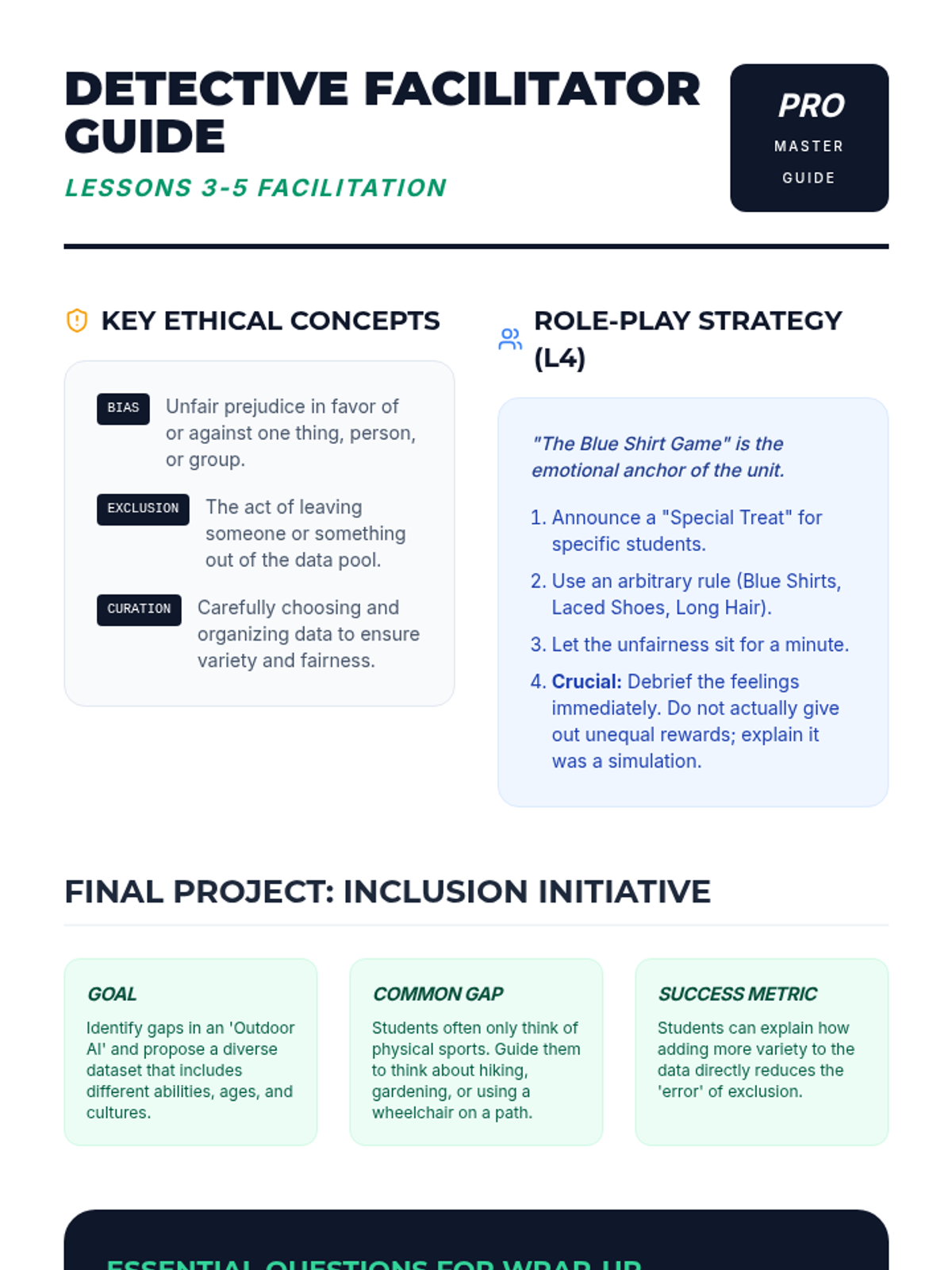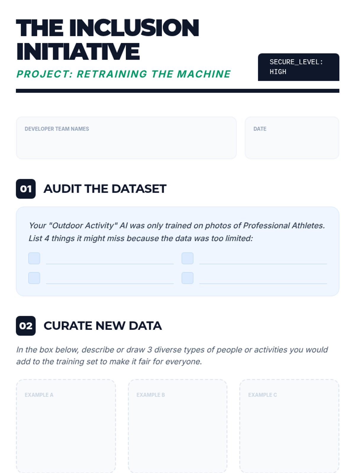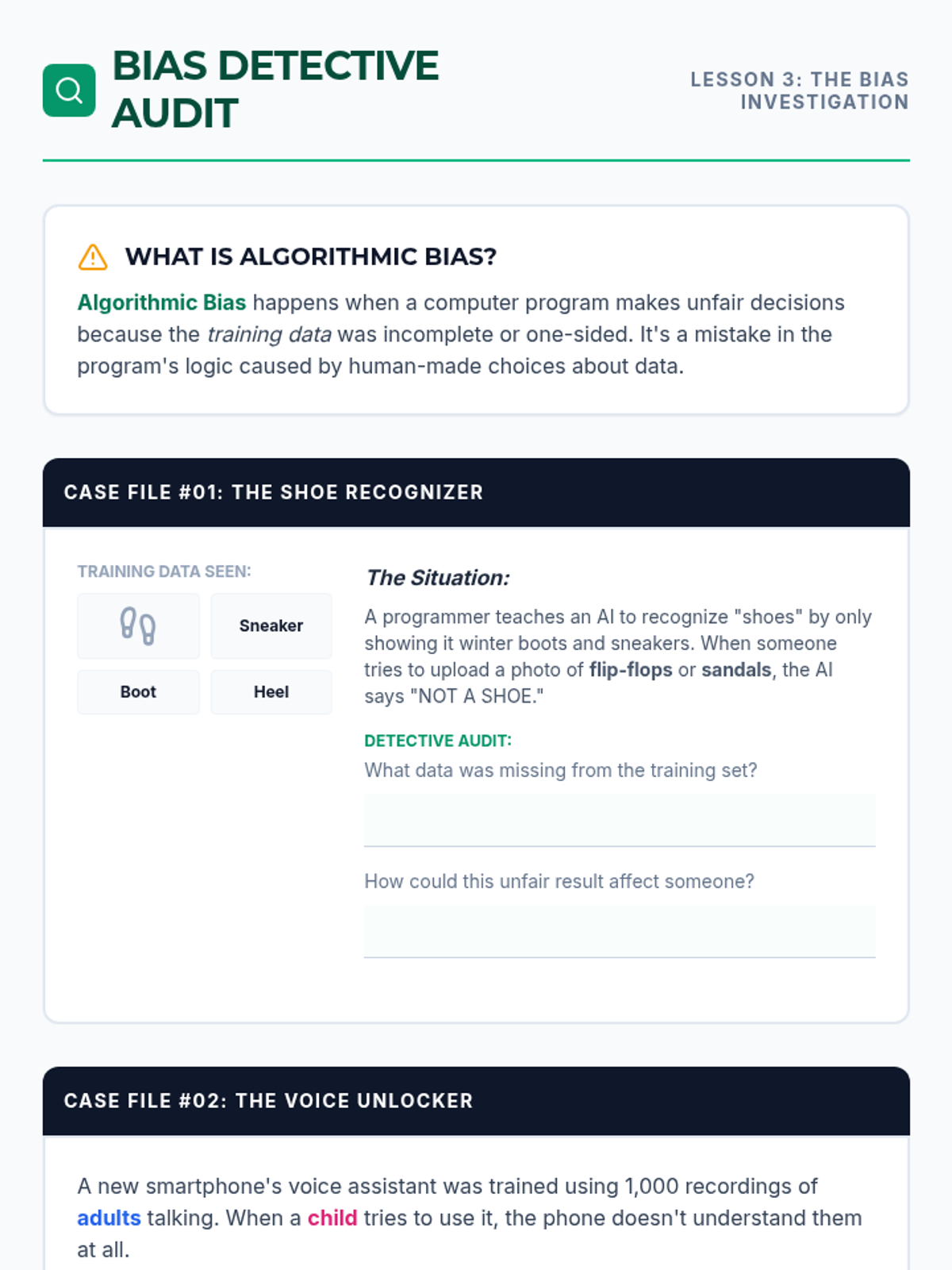 Students explore the fundamentals of algorithms, training data, and algorithmic bias. Through simulations and hands-on activities, they learn to identify unfair patterns and retrain AI models to be more inclusive and equitable.