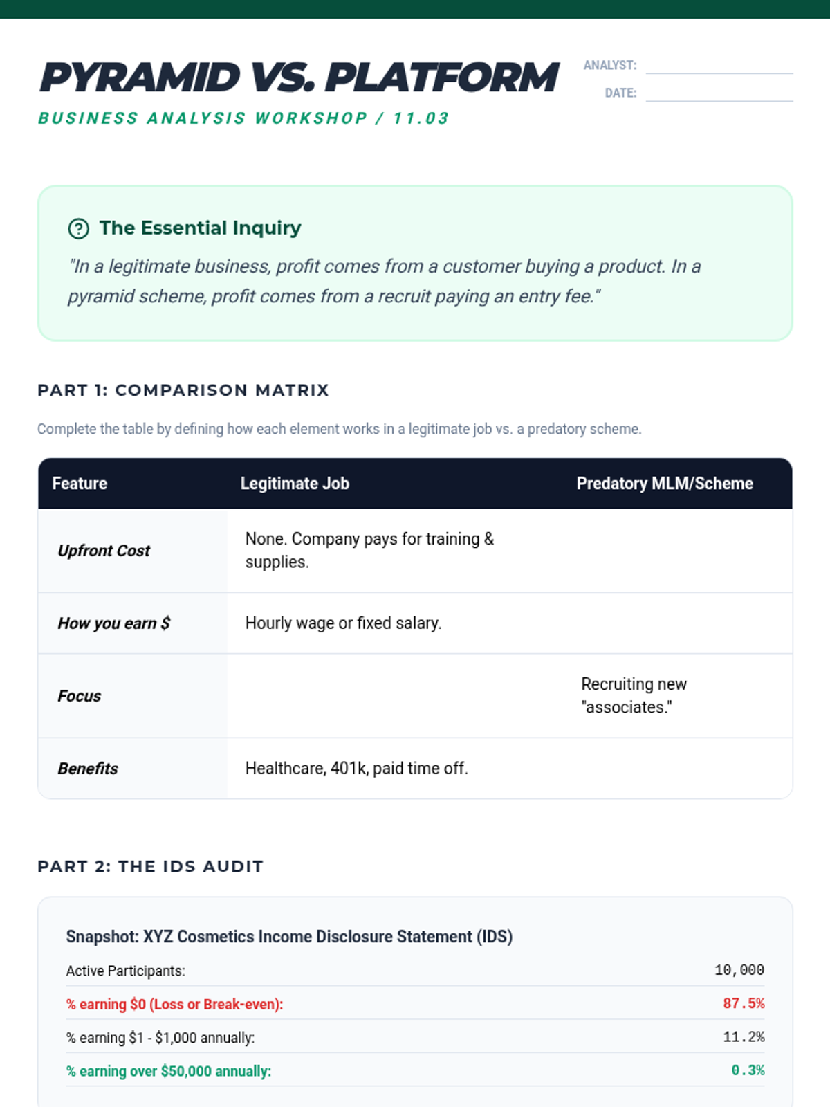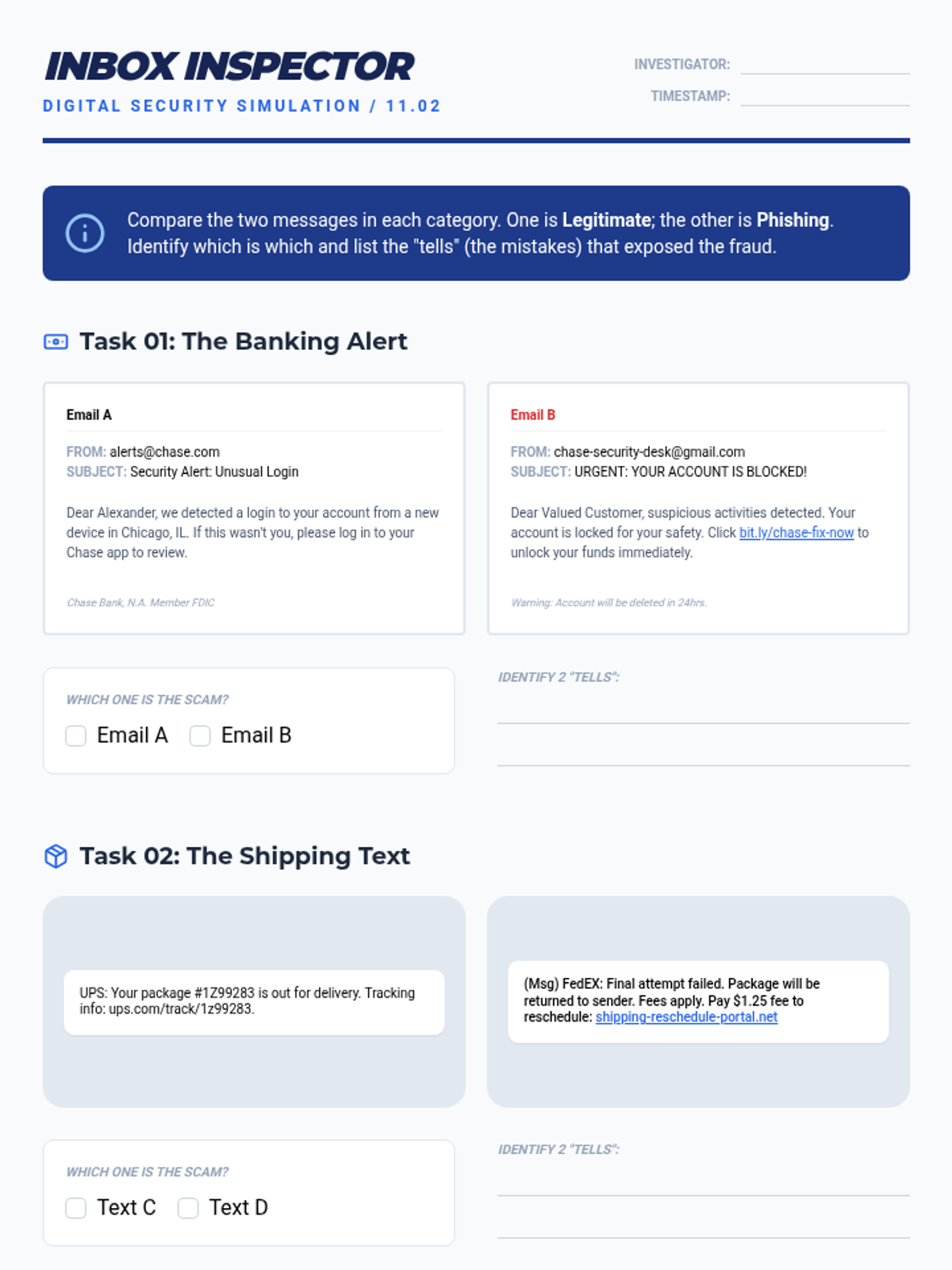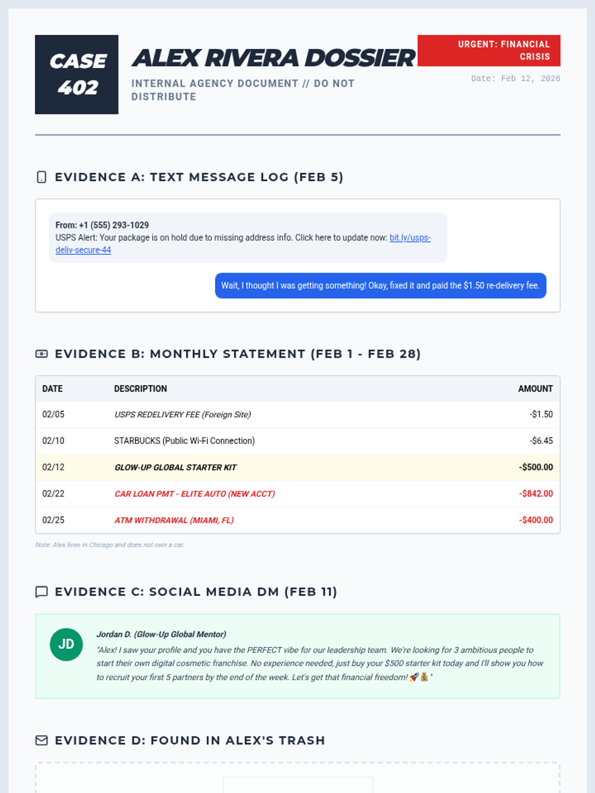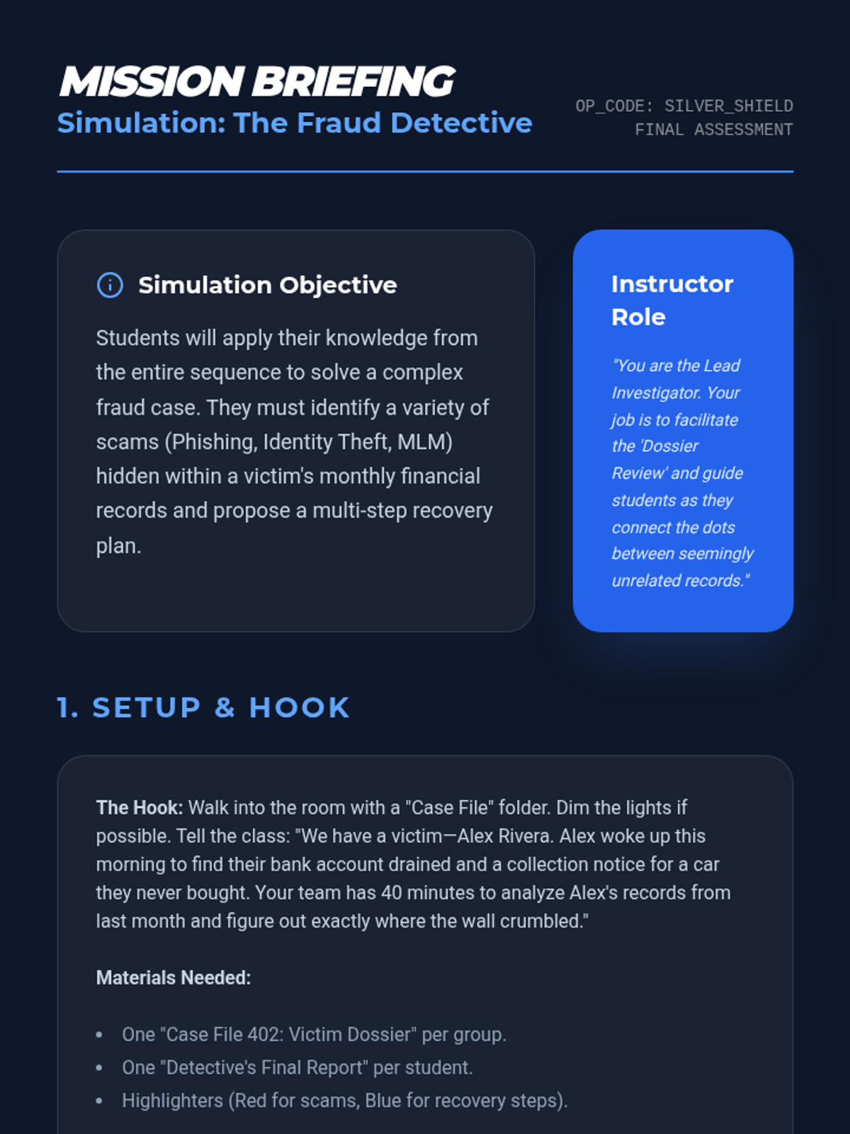 This sequence equips 11th-grade students with the skepticism and technical knowledge to identify scams and financial fraud. Students move from recognizing general red flags to analyzing specific schemes targeting young adults, culminating in a gamified fraud investigation simulation.