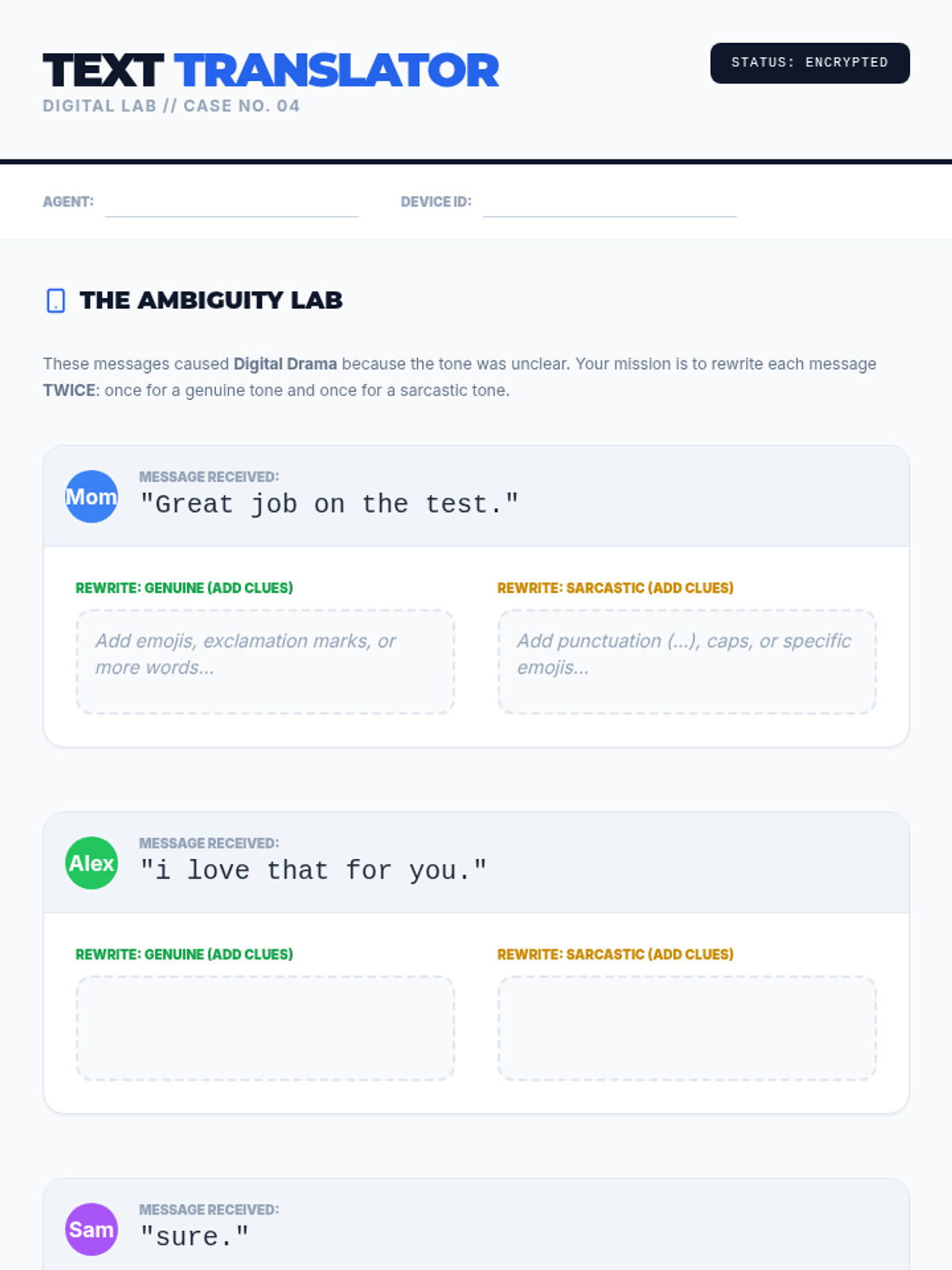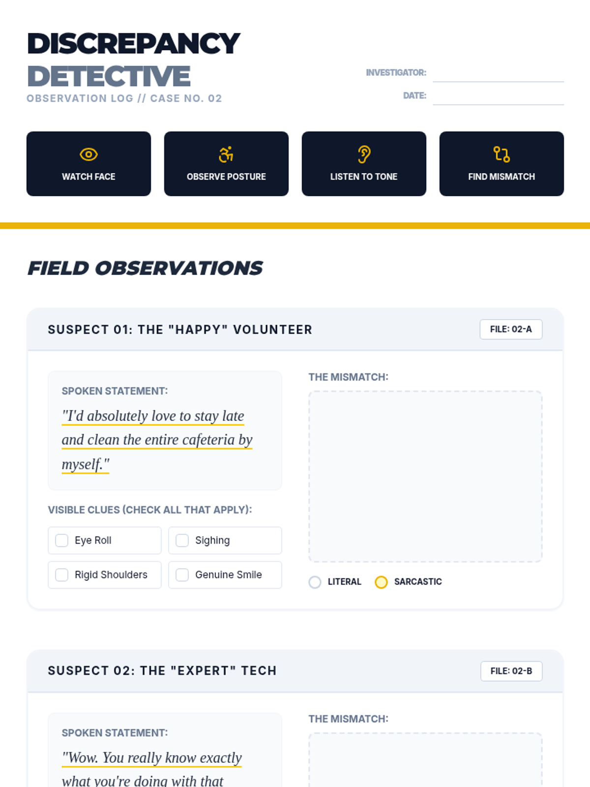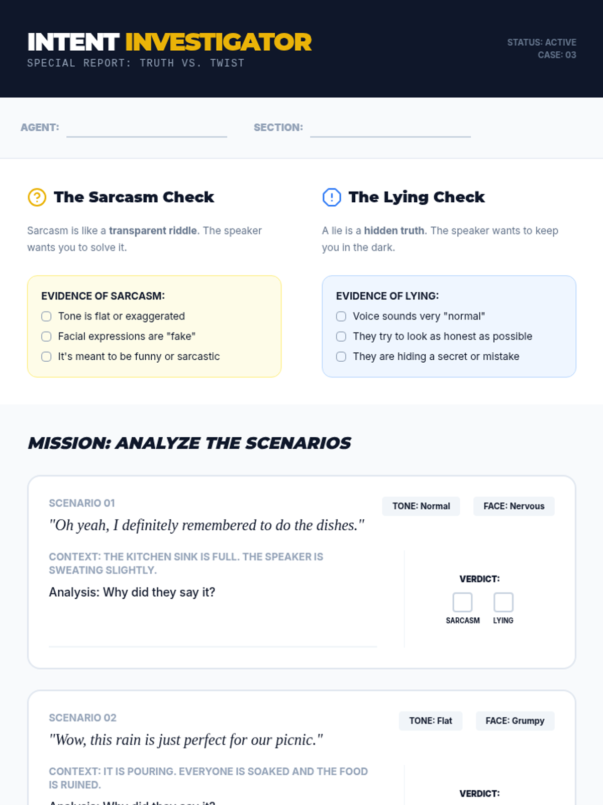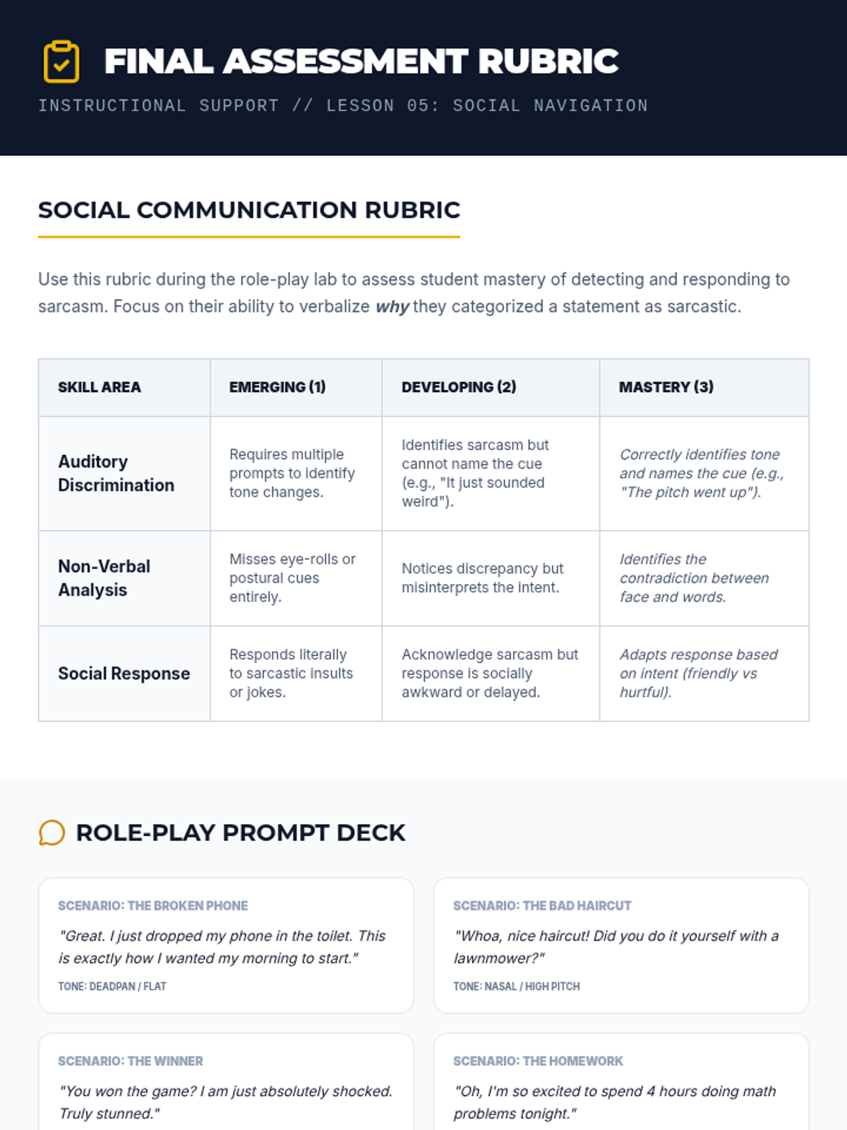 A specialized sequence for 10th-grade social communication students focused on detecting sarcasm and vocal nuance through paralinguistic cues and context analysis.