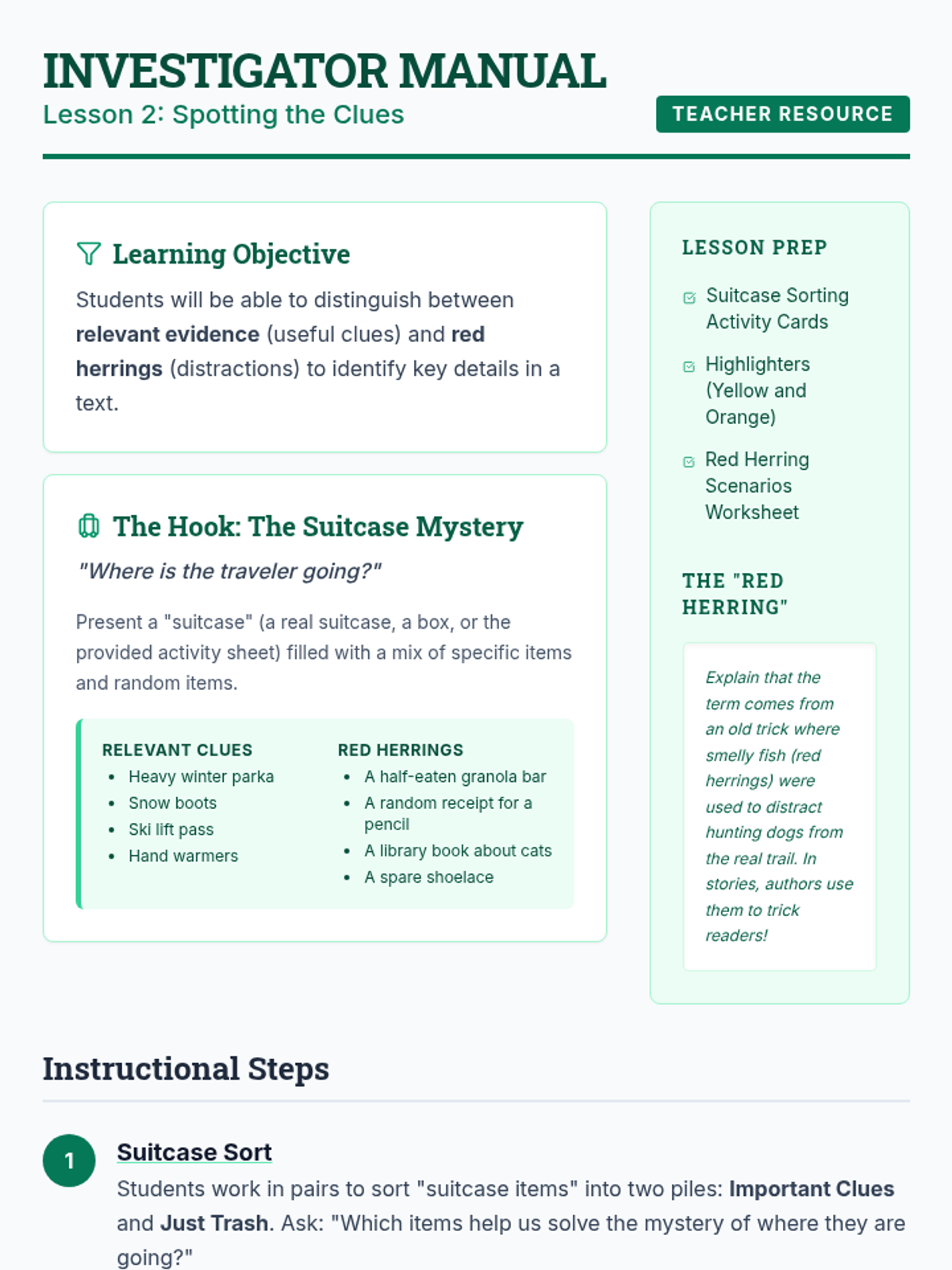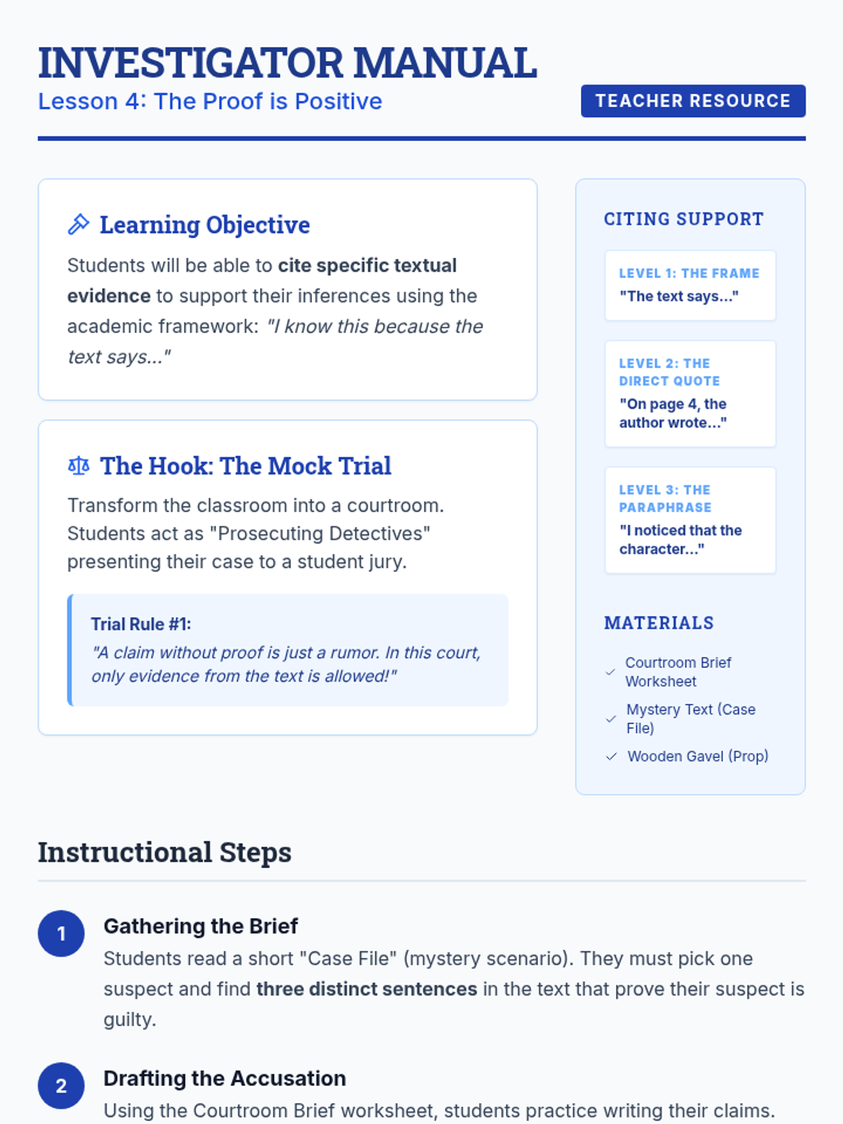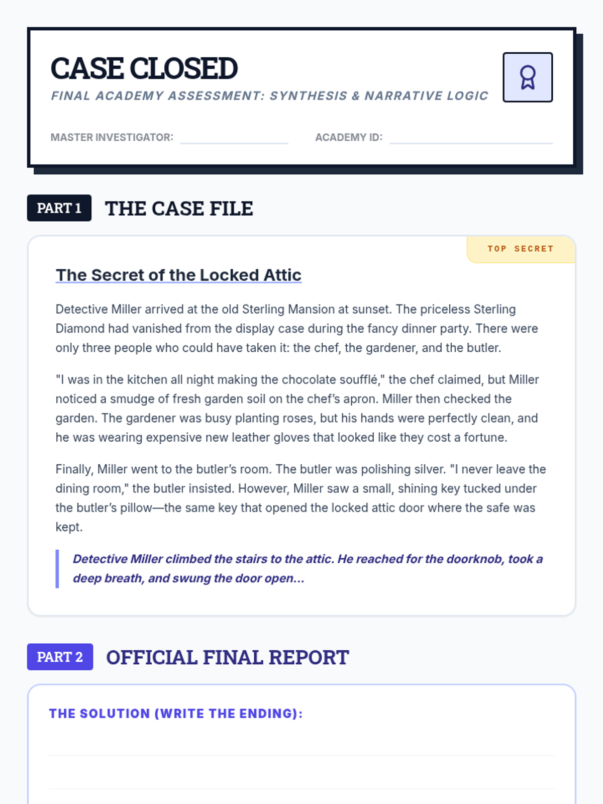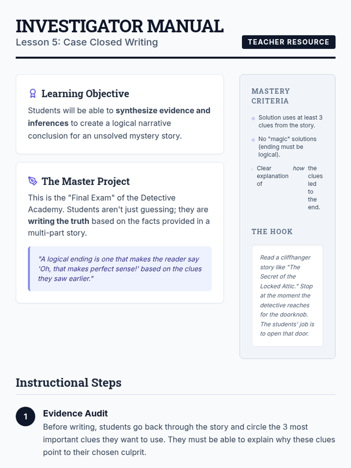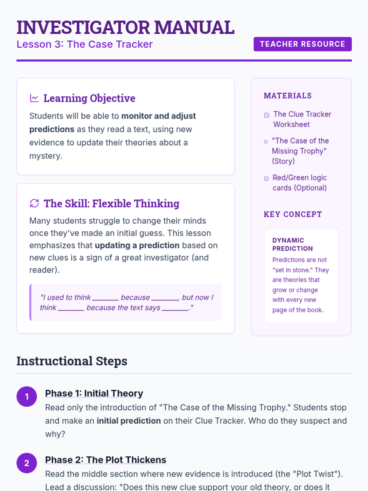 A 4th-grade sequence framed as a 'Detective Academy' where students learn to make predictions and inferences through deductive reasoning and evidence analysis. Students progress from basic observation to citing textual evidence and writing logical story conclusions.