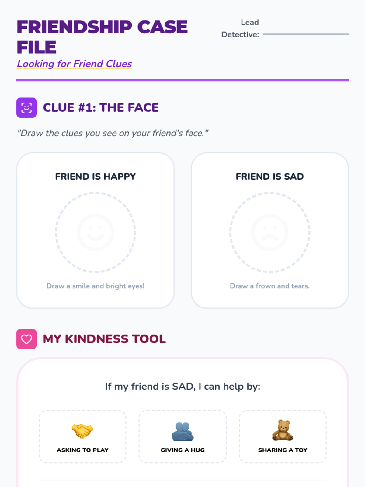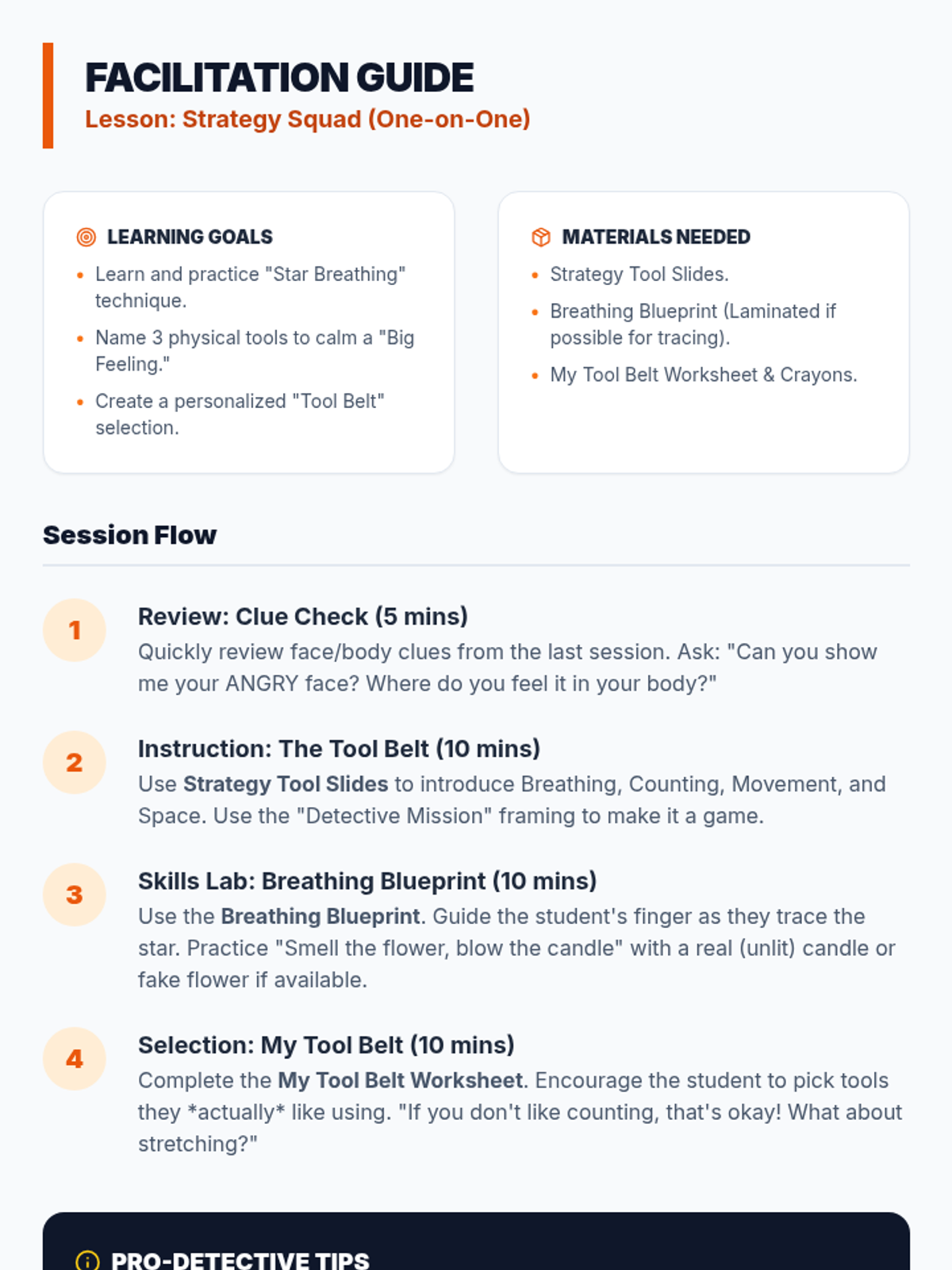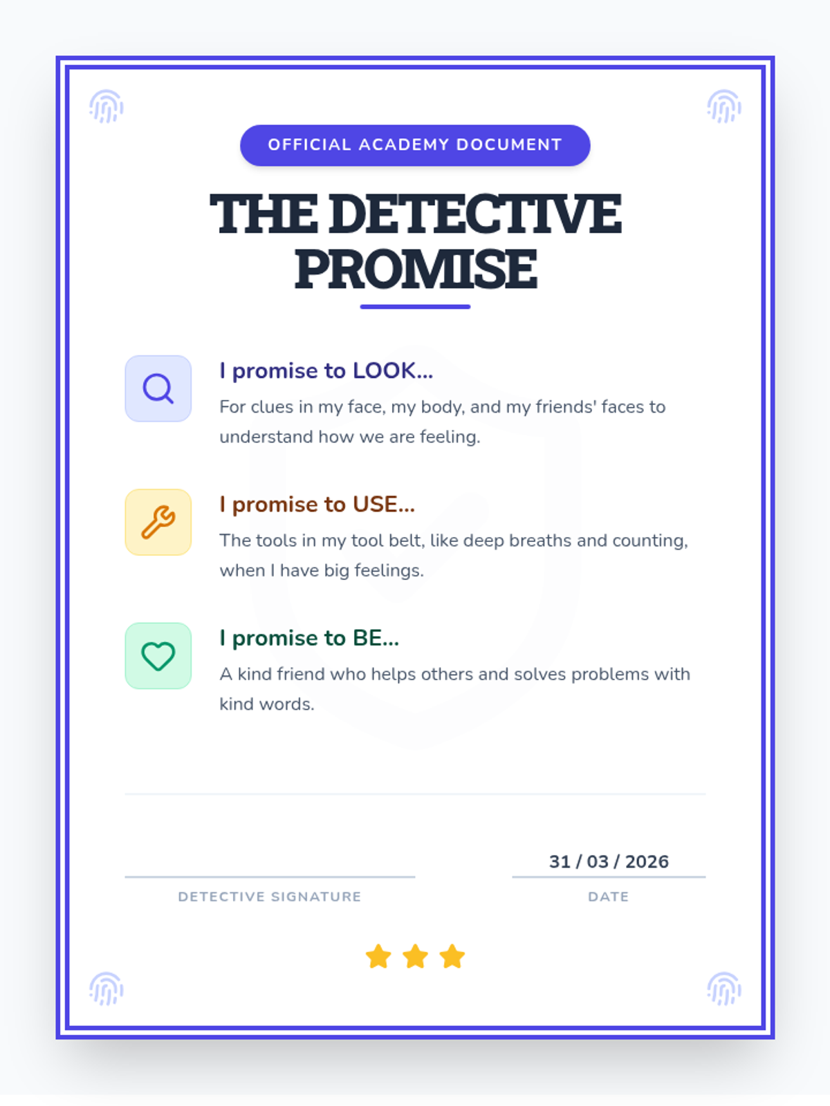 A multi-lesson counseling program for young learners that uses a detective theme to build emotional literacy, self-regulation, and conflict resolution skills through visual and interactive activities.