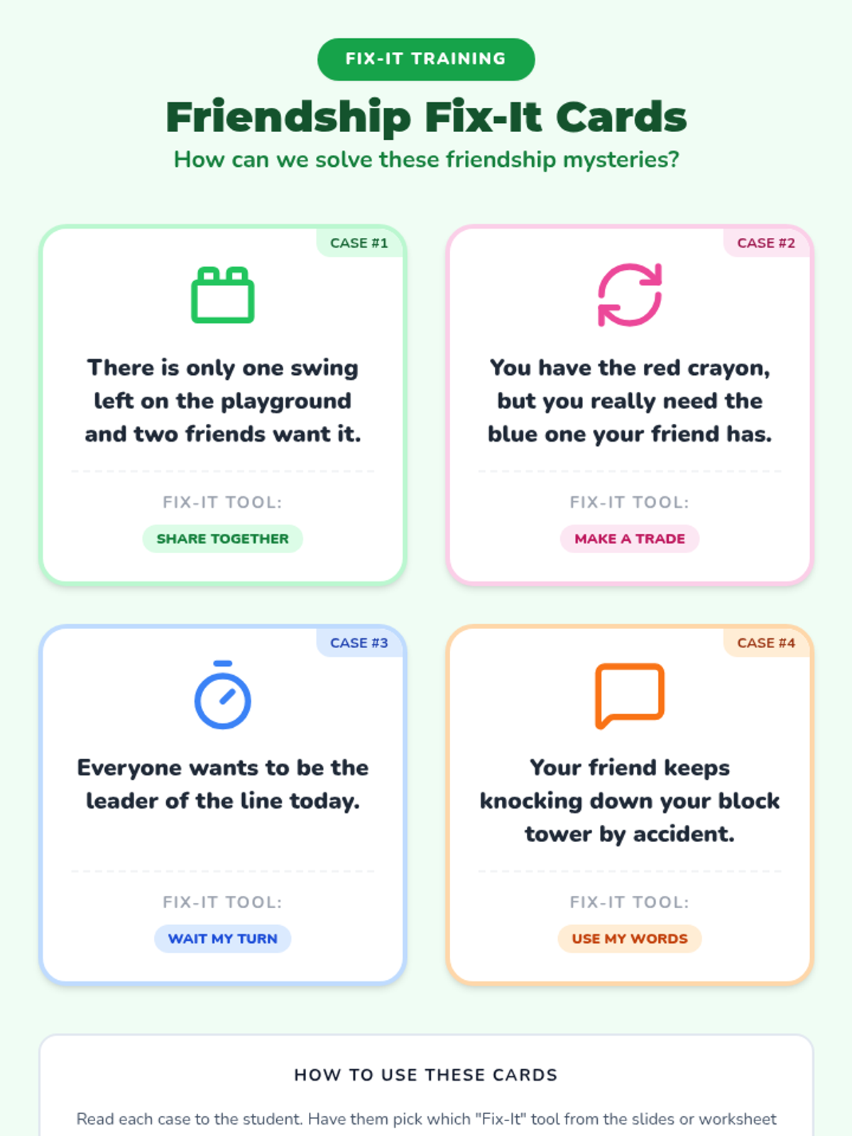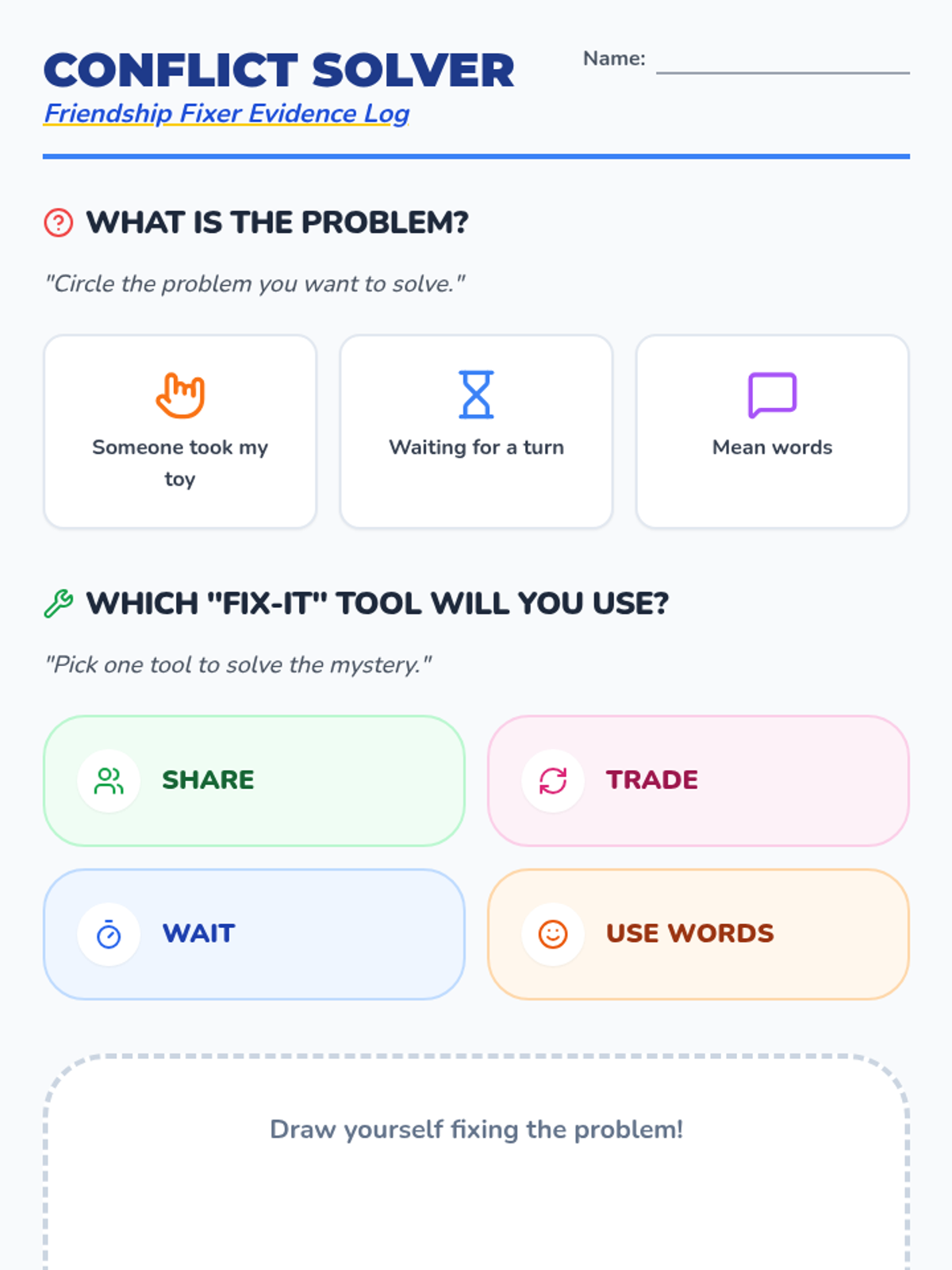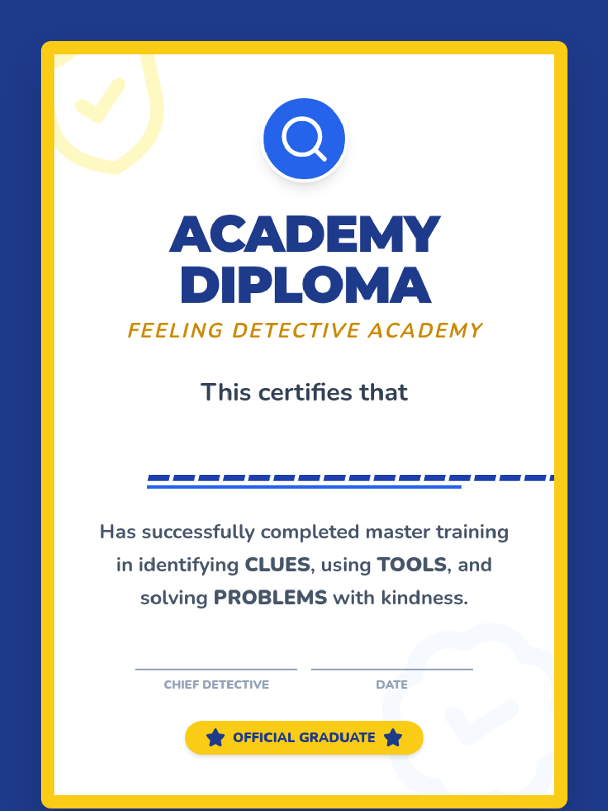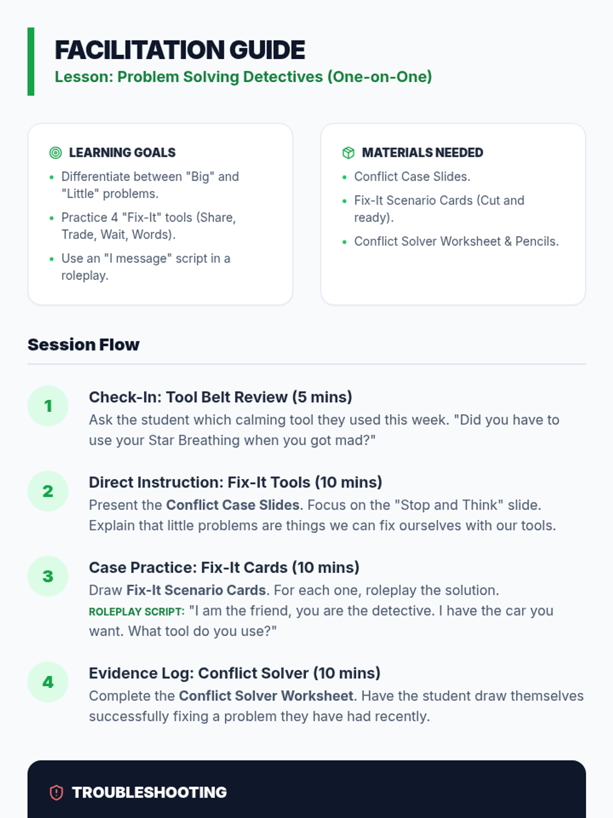 A multi-lesson counseling program for young learners that uses a detective theme to build emotional literacy, self-regulation, and conflict resolution skills through visual and interactive activities.