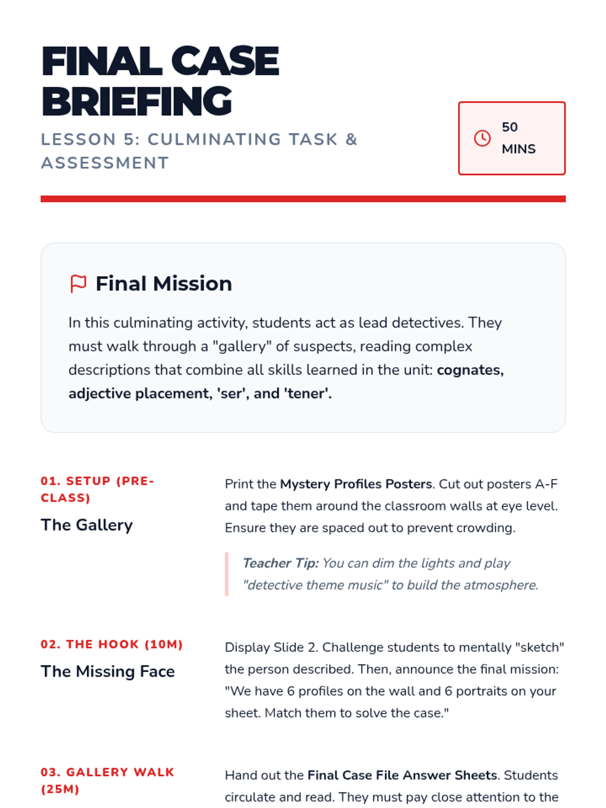 A 5-lesson sequence for 6th Grade French beginners focusing on listening comprehension through TPR, commands, spatial descriptions, and directional movement. Students act as 'Language Agents' on various missions to decode and execute instructions in French.
