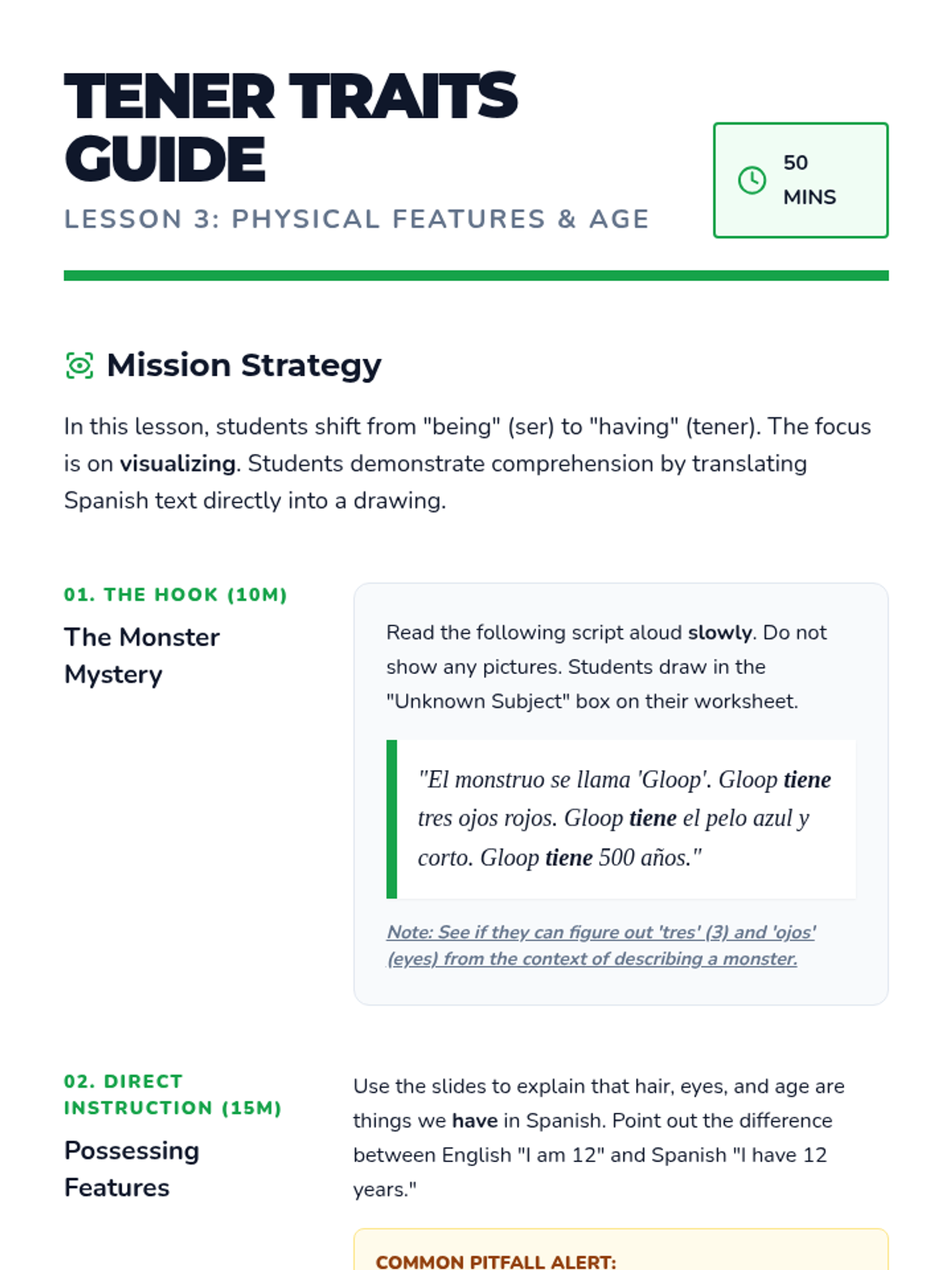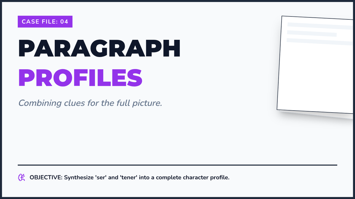 A beginner Spanish reading sequence for 6th graders focused on identifying physical and personality traits. Students learn to use cognates and the high-frequency verbs 'ser' and 'tener' to construct mental images of fictional characters.