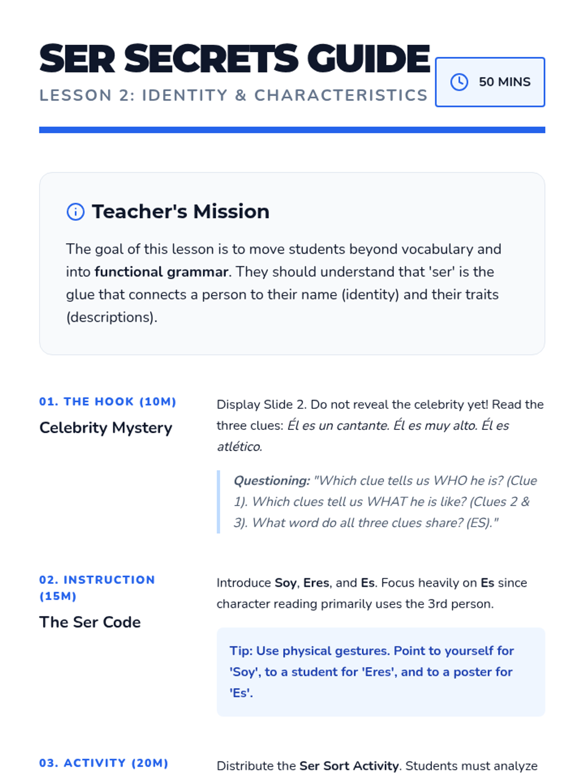 A project-based unit where 6th-grade students learn to articulate their identity, origin, age, and personality in Spanish using 'Ser', 'Tener', and 'Estar'. The sequence culminates in a multimedia 'All About Me' presentation.