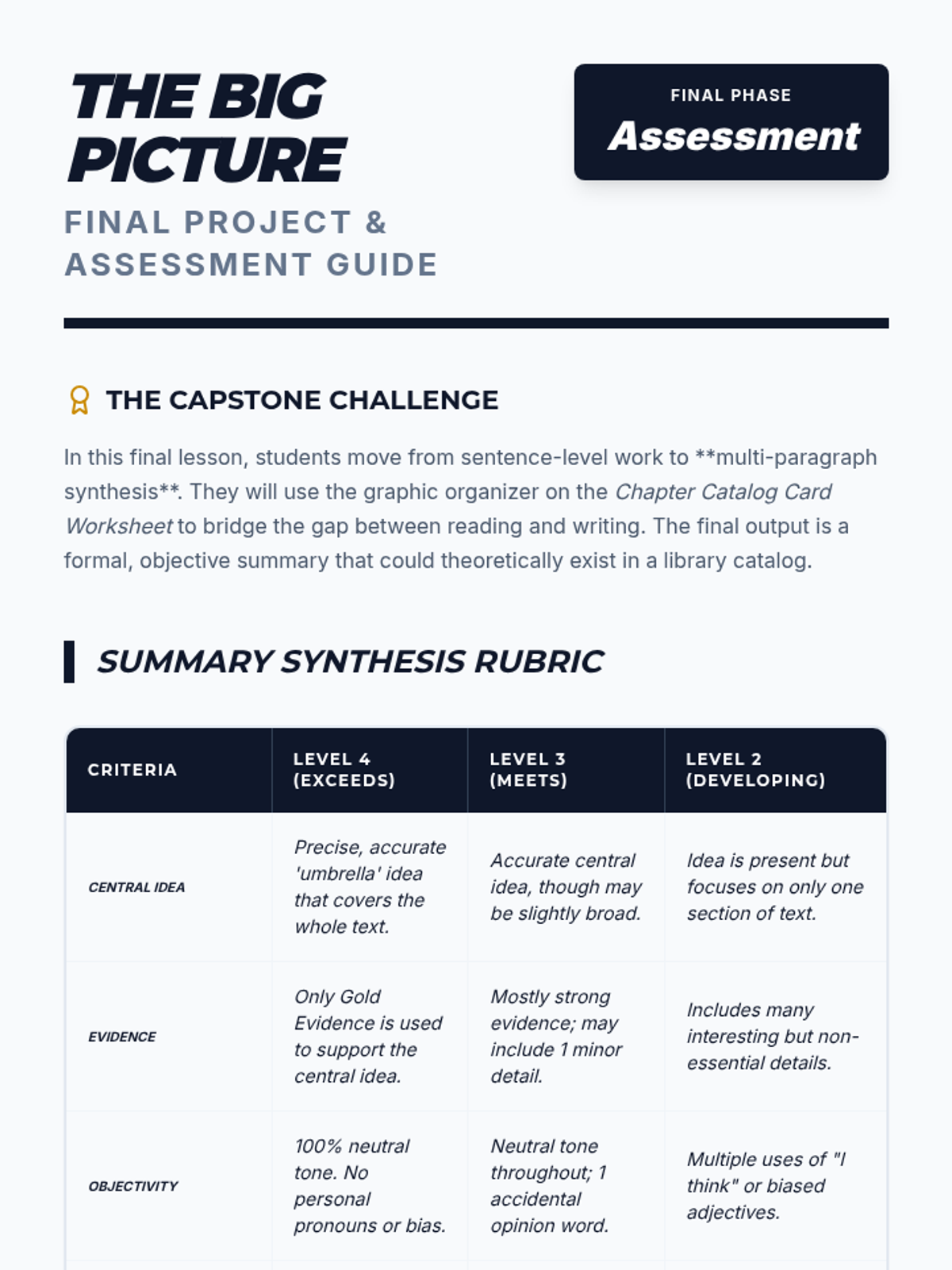 A comprehensive 6th-grade workshop sequence focusing on distinguishing topics from central ideas, evaluating supporting evidence, and writing objective, paraphrased summaries of nonfiction texts.