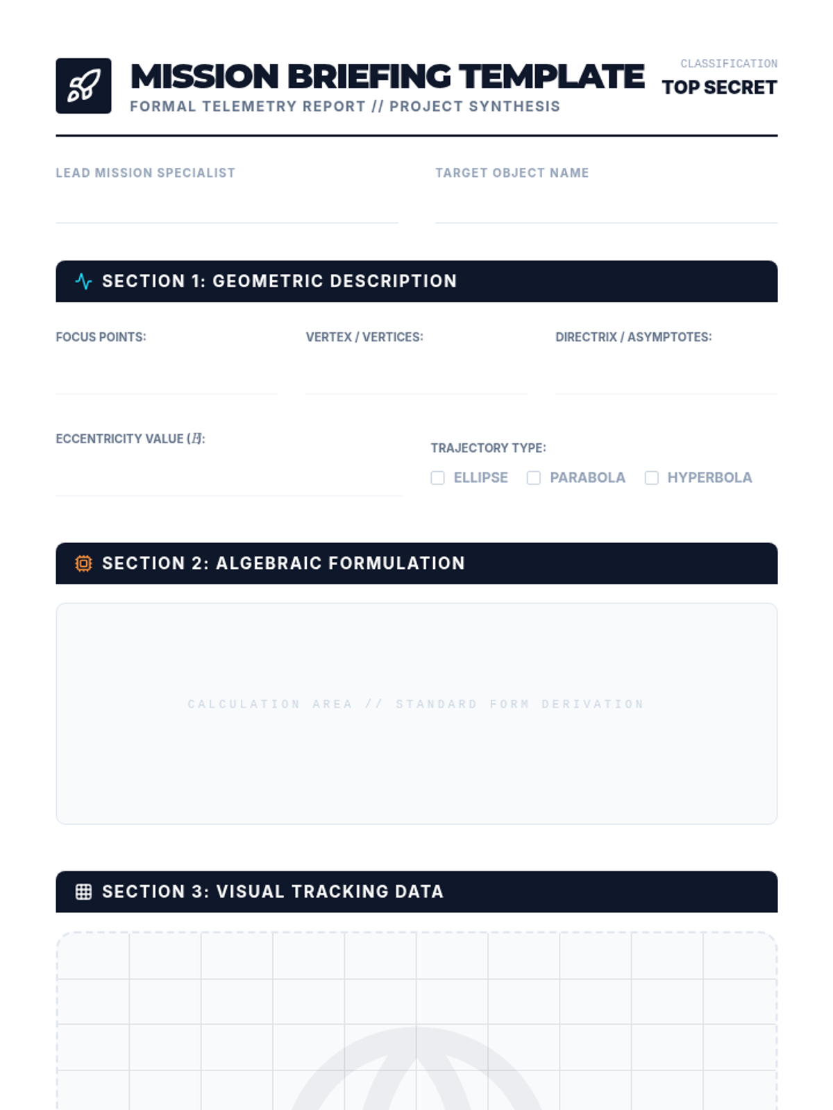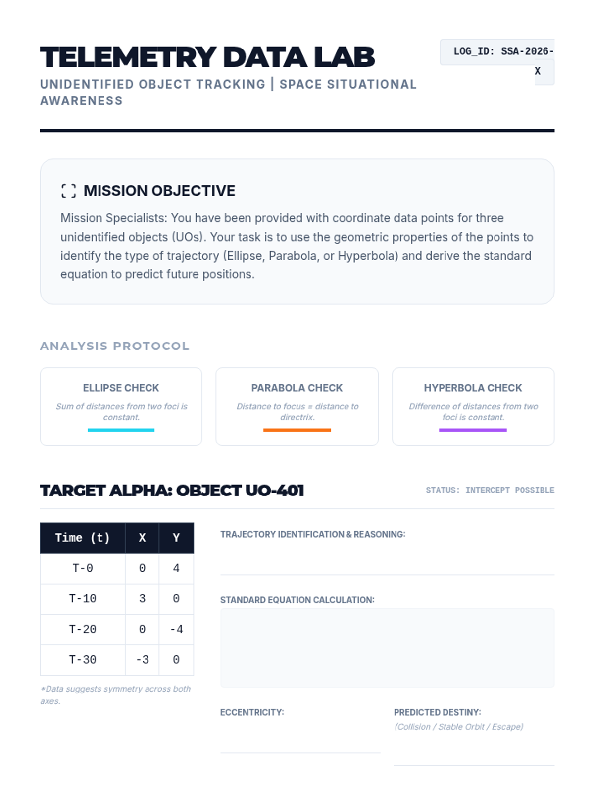 An advanced 12th-grade geometry sequence exploring conic sections through the lens of orbital mechanics. Students act as mission specialists analyzing elliptical orbits, parabolic escape trajectories, and hyperbolic gravity assists to determine the paths of celestial bodies.