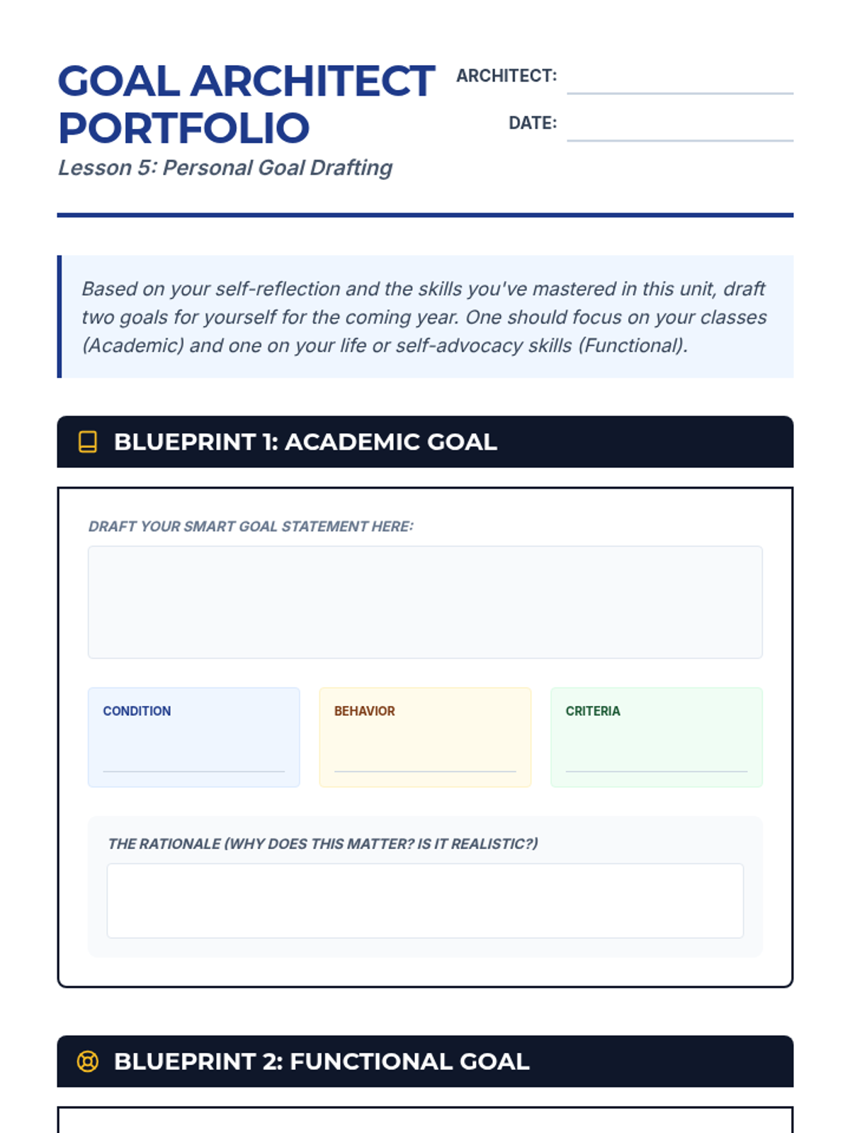 A 5-lesson sequence for 9th-grade students to master the creation, analysis, and monitoring of SMART goals within the context of their IEPs. Students transition from understanding criteria to actively proposing their own educational targets.