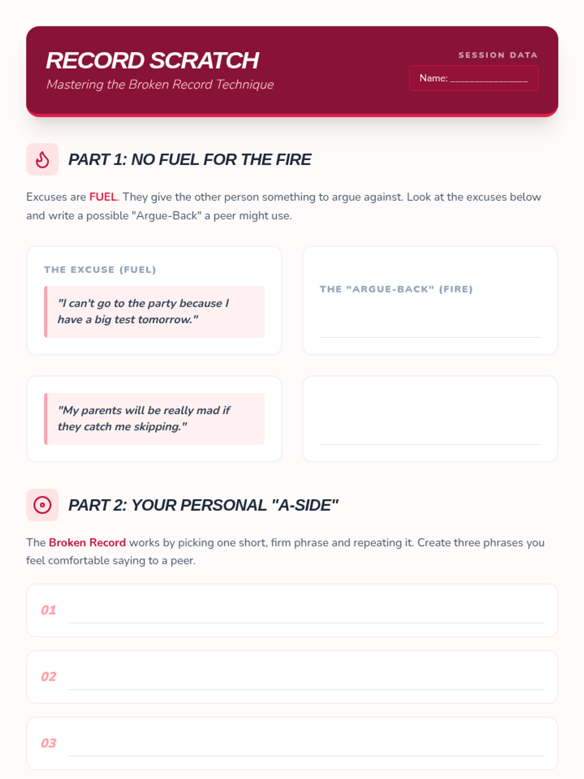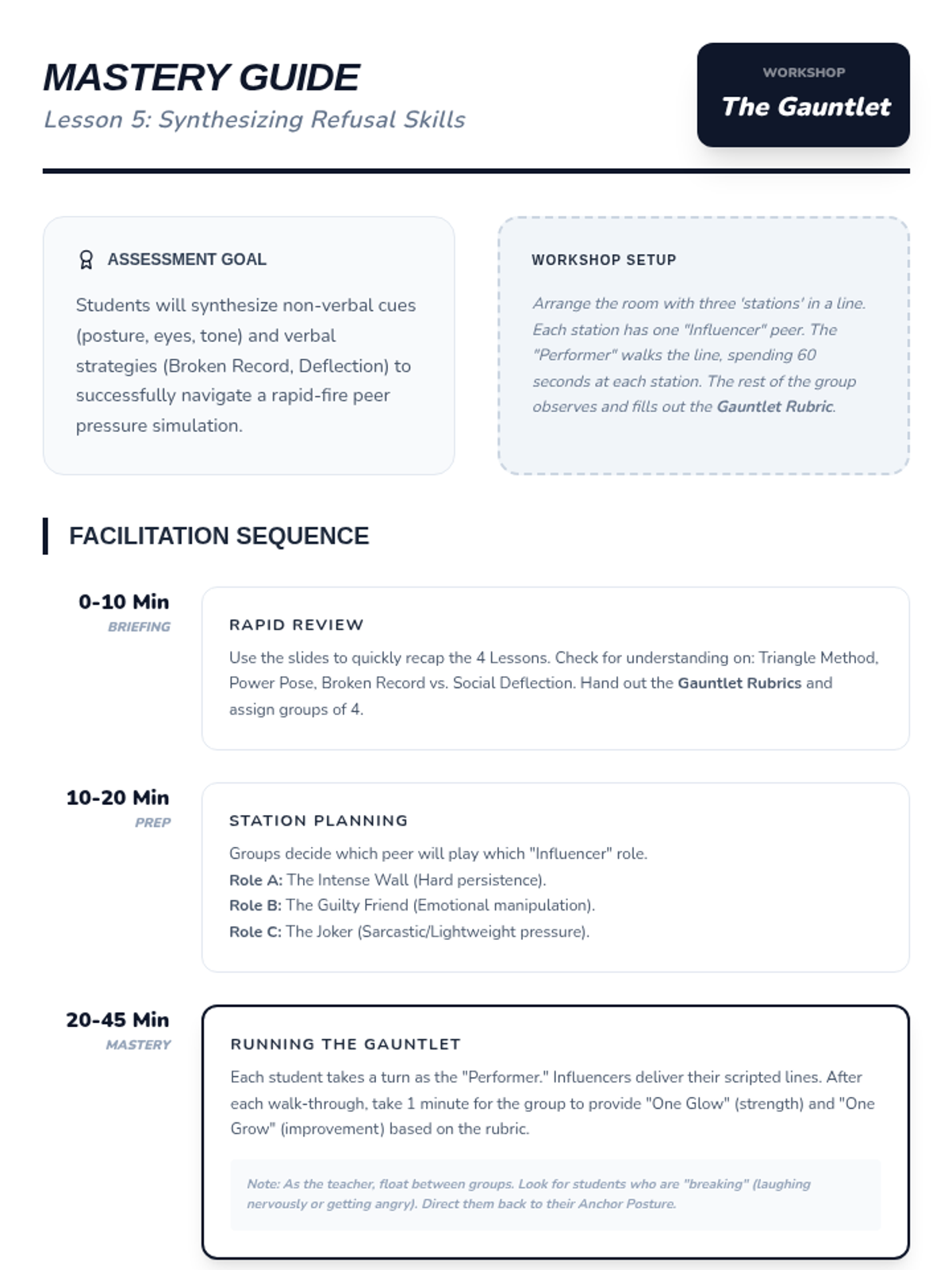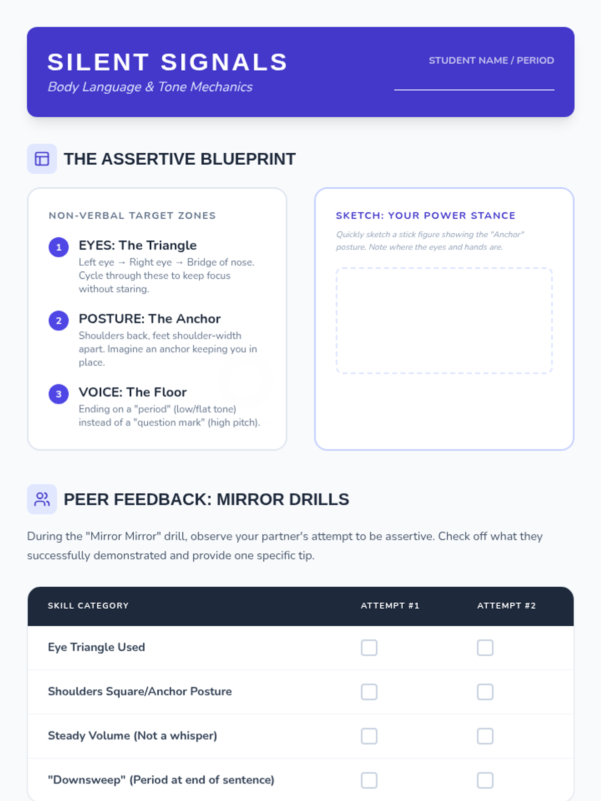 A comprehensive workshop-style sequence for 7th-grade students focusing on the mechanics of assertive communication. Students learn to differentiate between passive, aggressive, and assertive styles, master non-verbal cues, and practice specific refusal techniques like the 'broken record' and social deflection to navigate peer pressure effectively.
