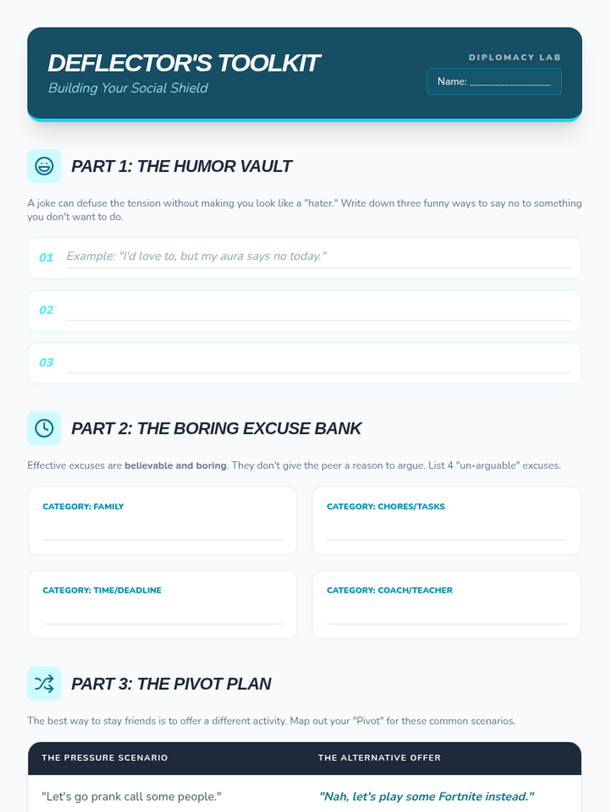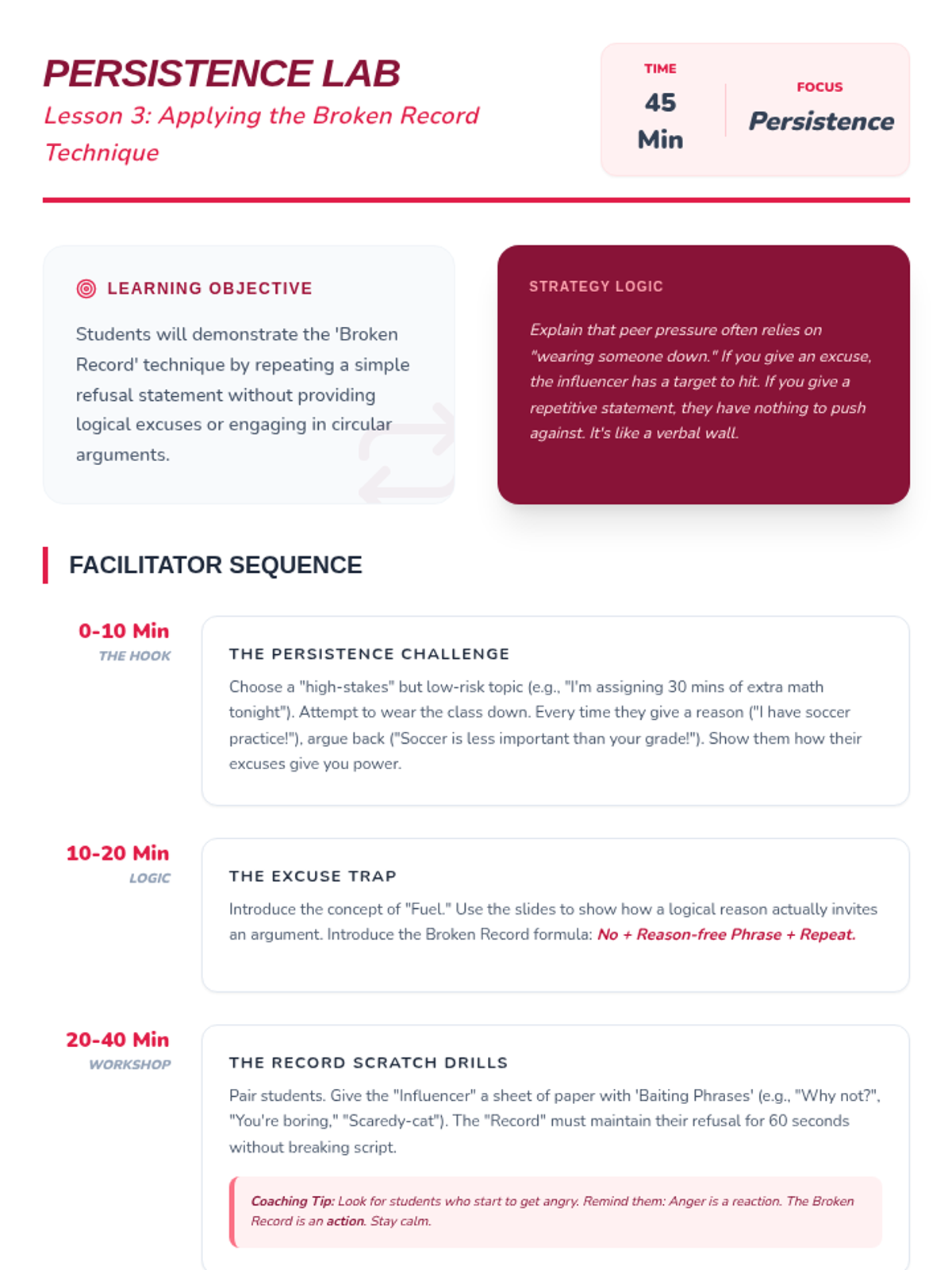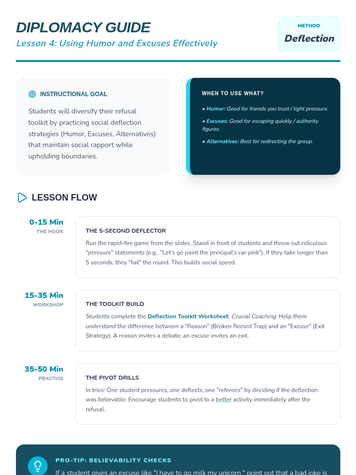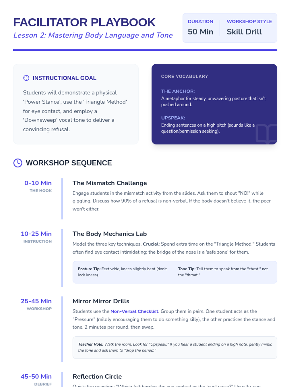 A comprehensive workshop-style sequence for 7th-grade students focusing on the mechanics of assertive communication. Students learn to differentiate between passive, aggressive, and assertive styles, master non-verbal cues, and practice specific refusal techniques like the 'broken record' and social deflection to navigate peer pressure effectively.