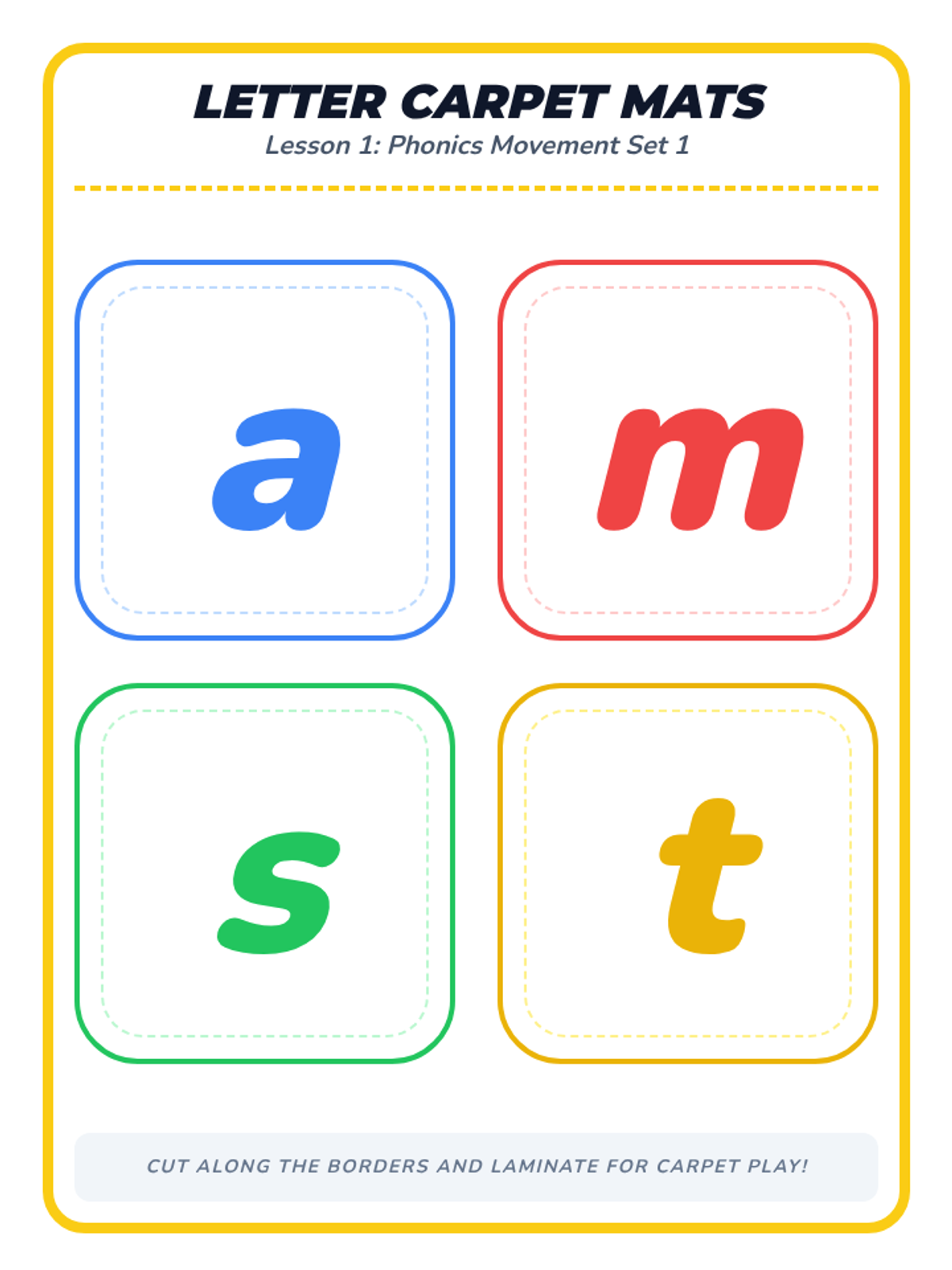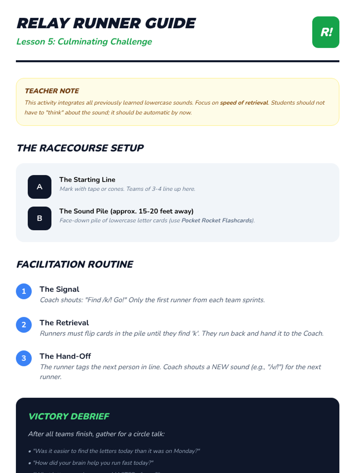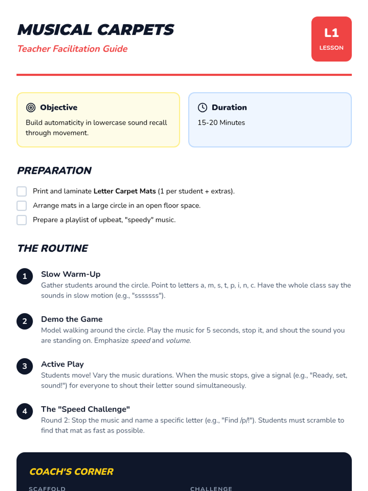 A Kindergarten phonics sequence focused on building rapid, automatic lowercase letter-sound recognition through high-energy, game-based learning activities like musical mats, flashcard races, and relays.