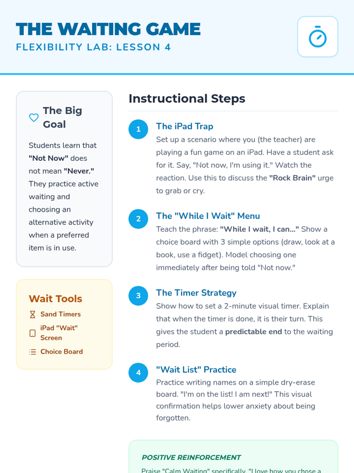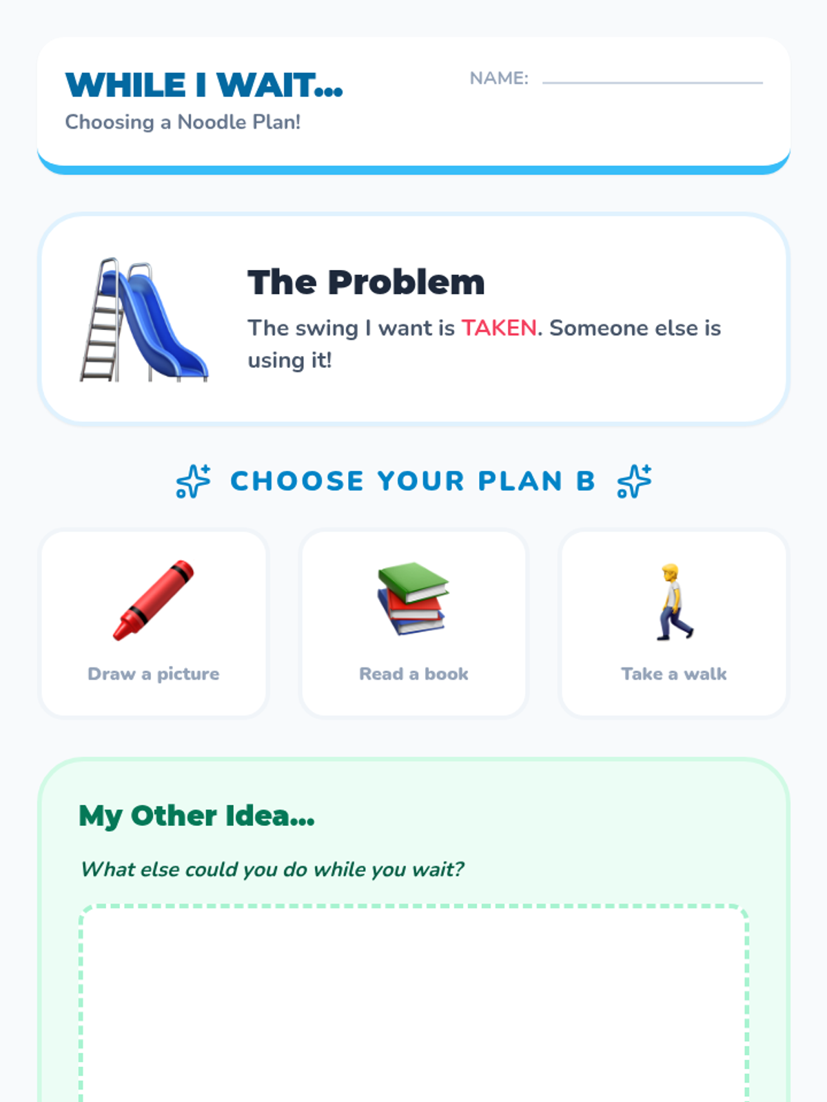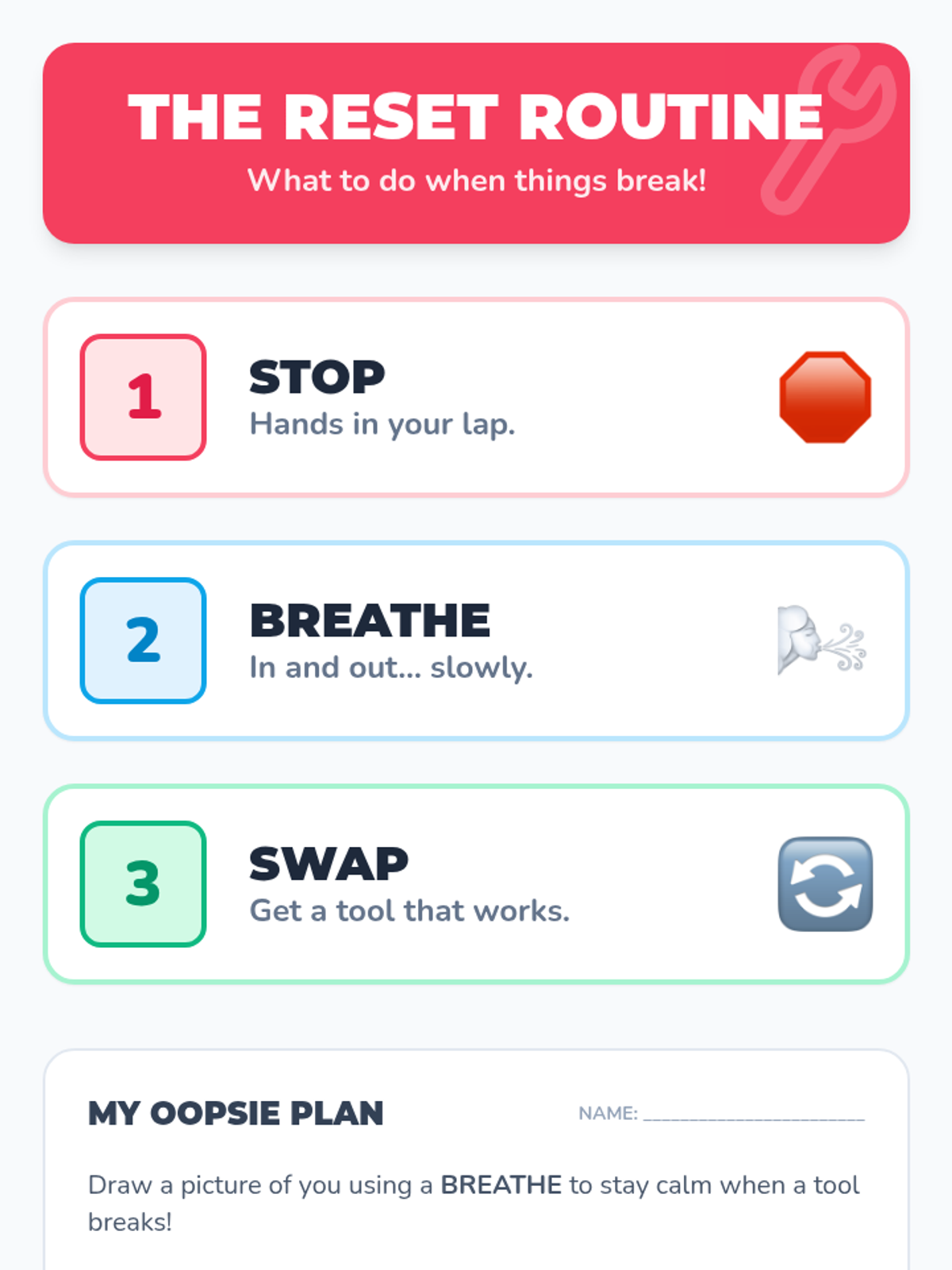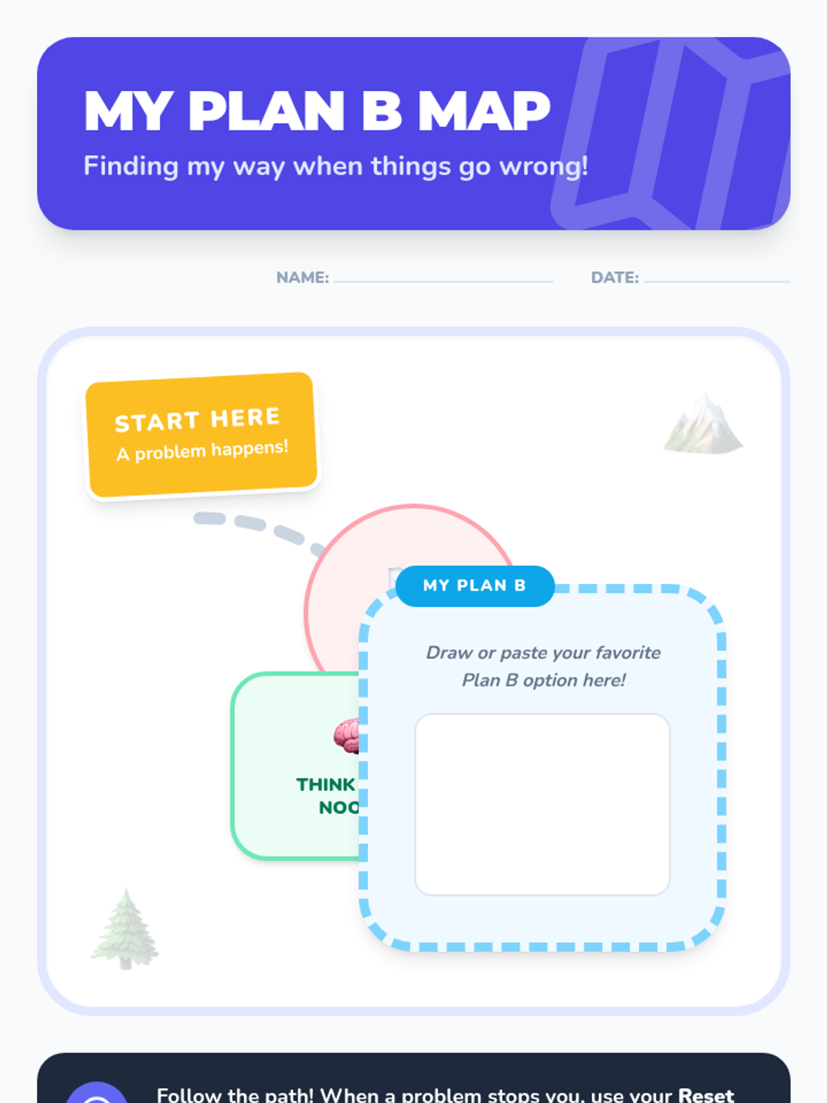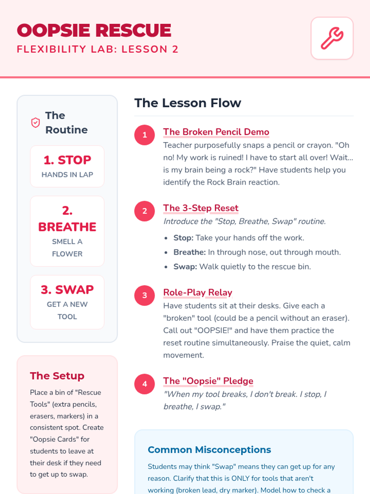 A 5-lesson unit for 1st-grade students focusing on cognitive flexibility. Students learn to navigate obstacles, tool breakage, schedule changes, and unavailability using the 'Rock Brain' vs. 'Noodle Brain' metaphor and the 'Plan B' framework.
