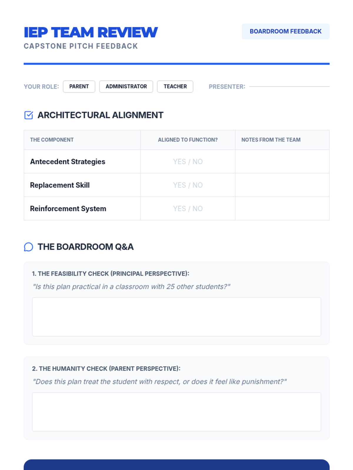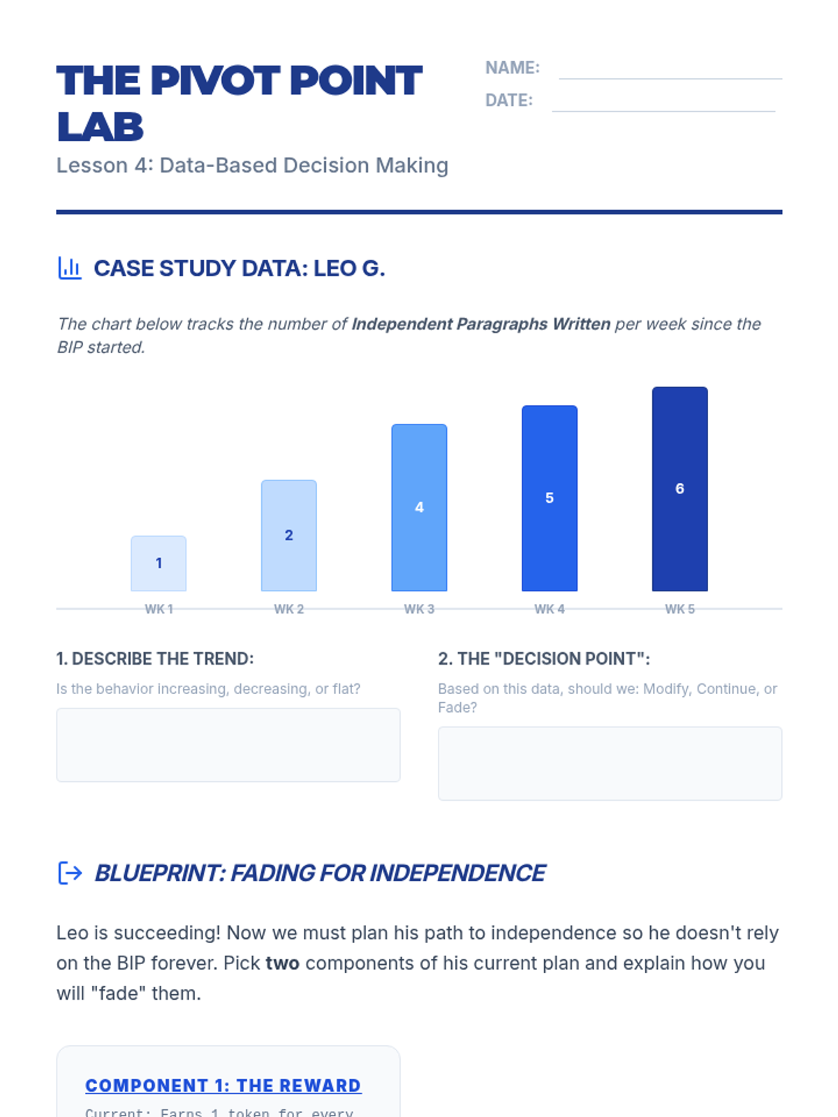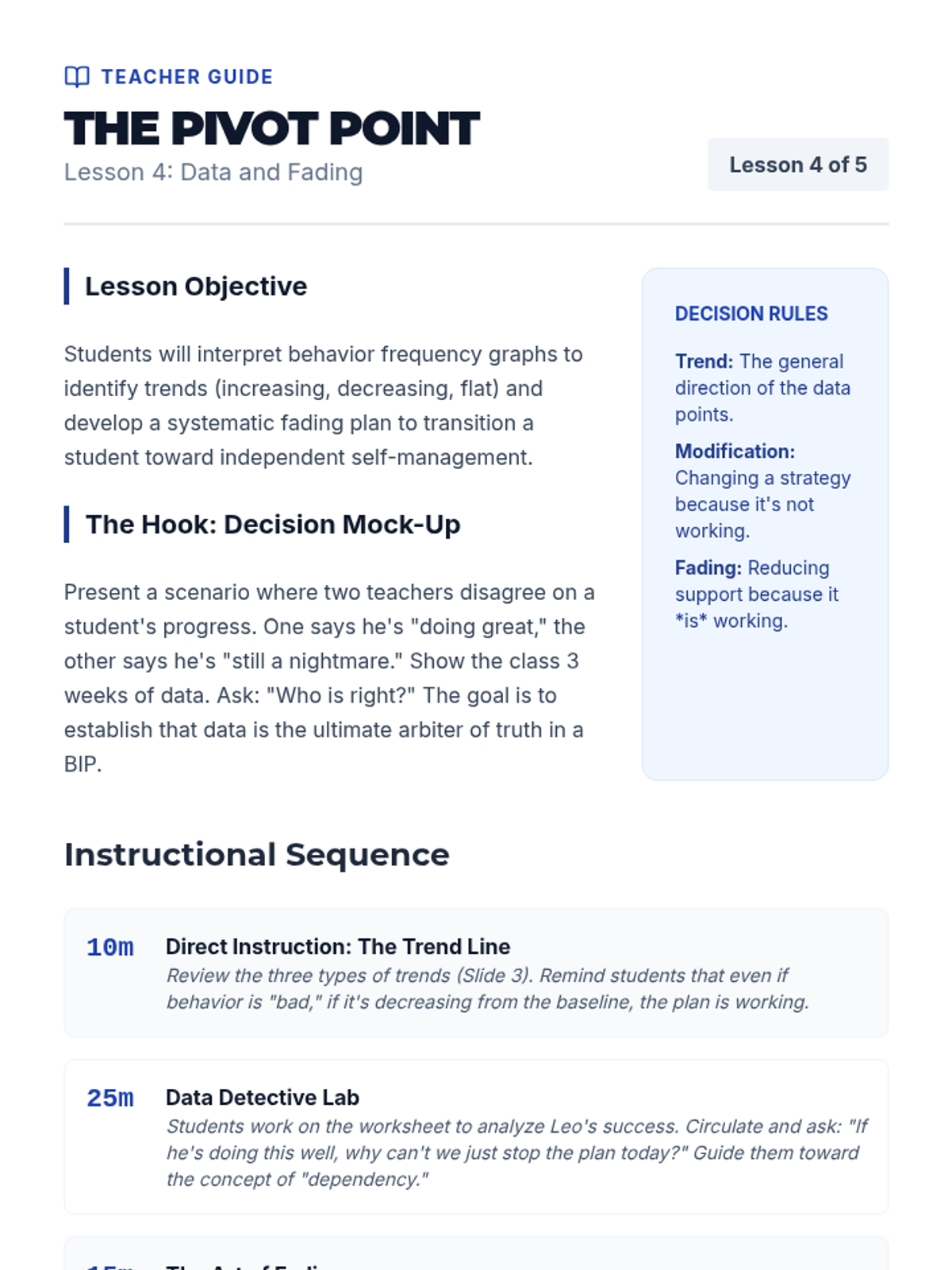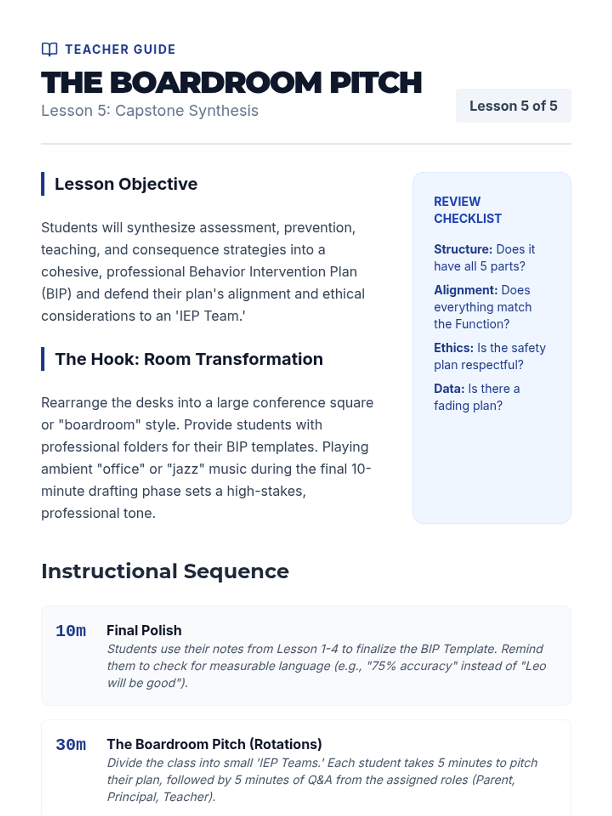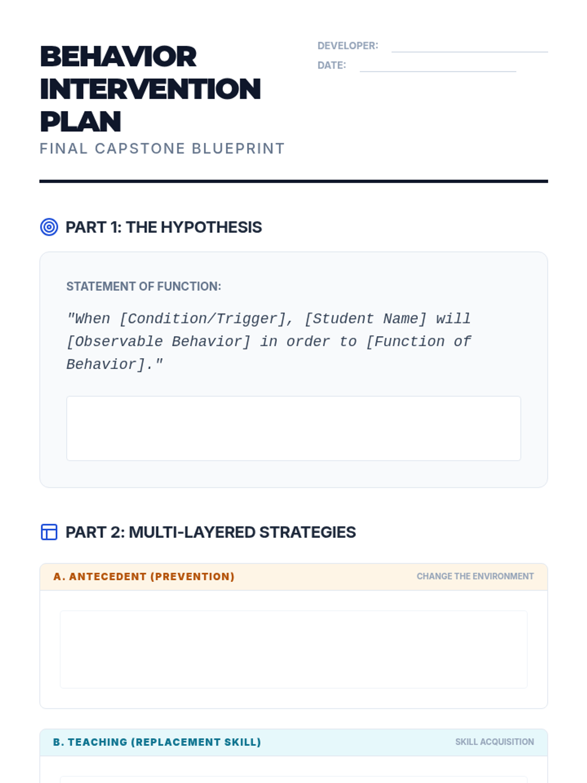 A capstone sequence for 11th-grade students to synthesize assessment, prevention, and teaching strategies into a comprehensive Behavior Intervention Plan (BIP). Students learn about reinforcement systems, crisis management, and data-based decision-making to create sustainable and ethical behavioral supports.