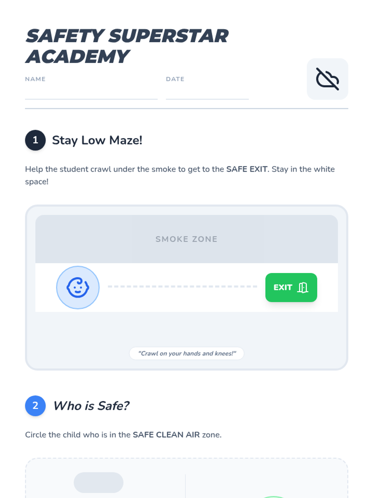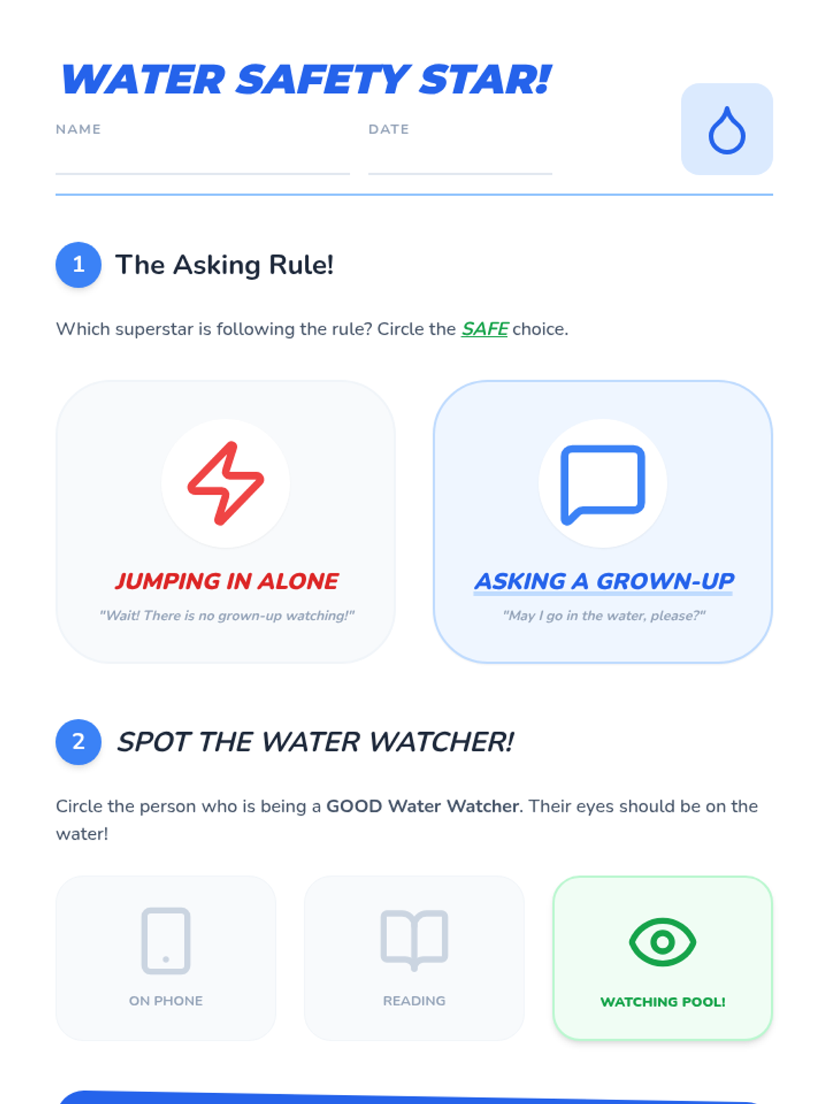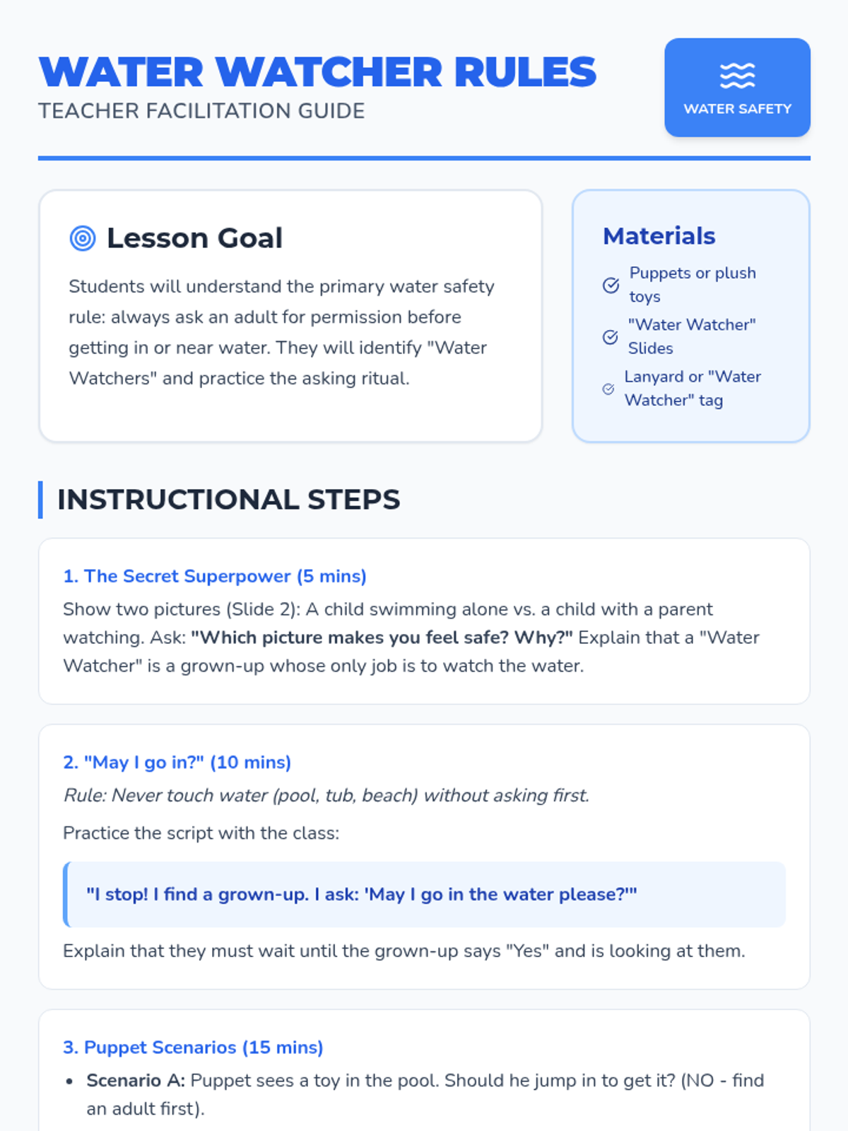 A comprehensive safety awareness sequence for Kindergarteners, covering essential fire evacuation procedures and fundamental water safety rules through interactive play and simulation.