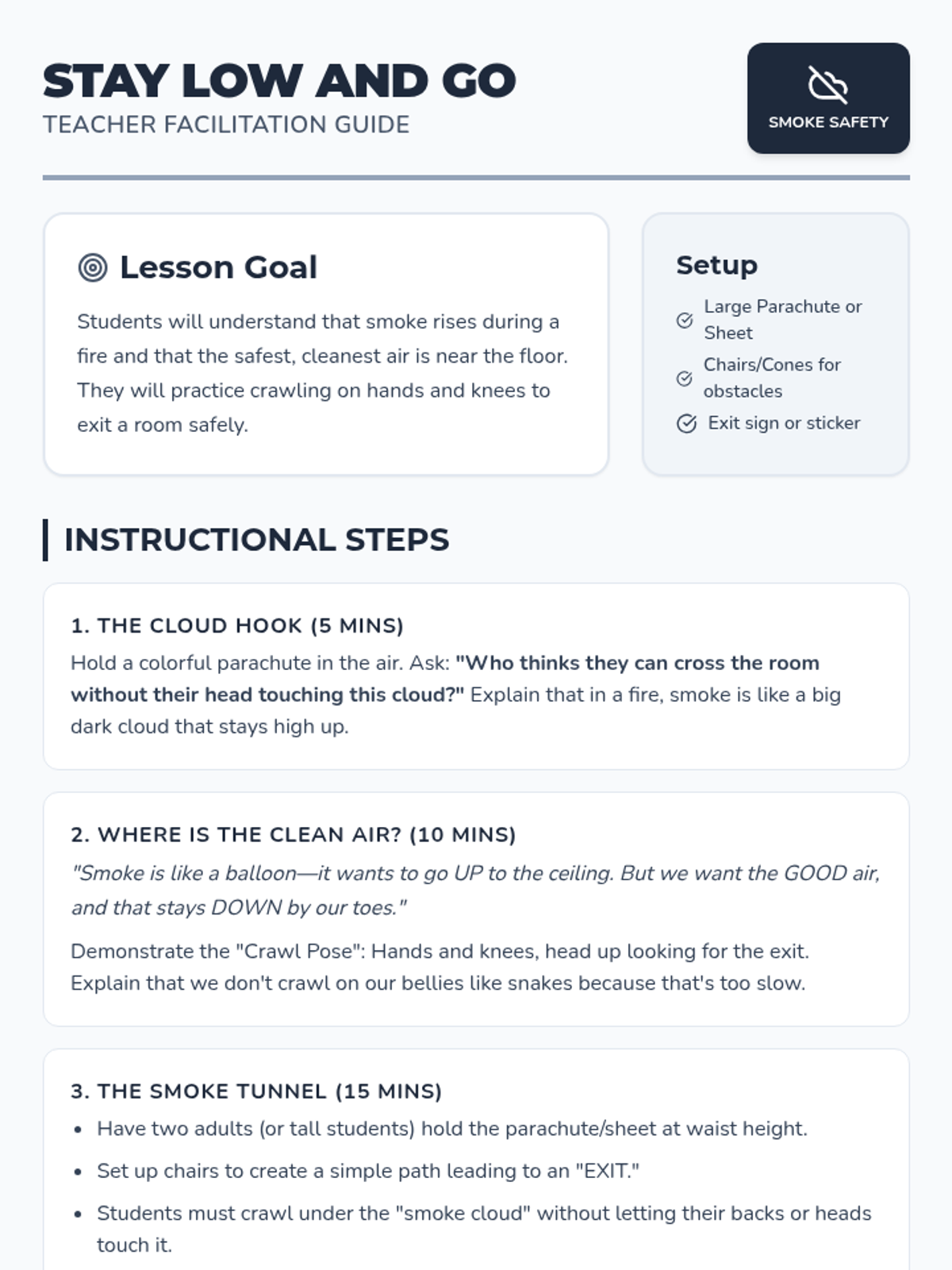 A comprehensive fire safety sequence for Pre-K students focusing on movement-based reactions, overcoming fear of emergency gear, and mastering evacuation procedures through play and simulation.