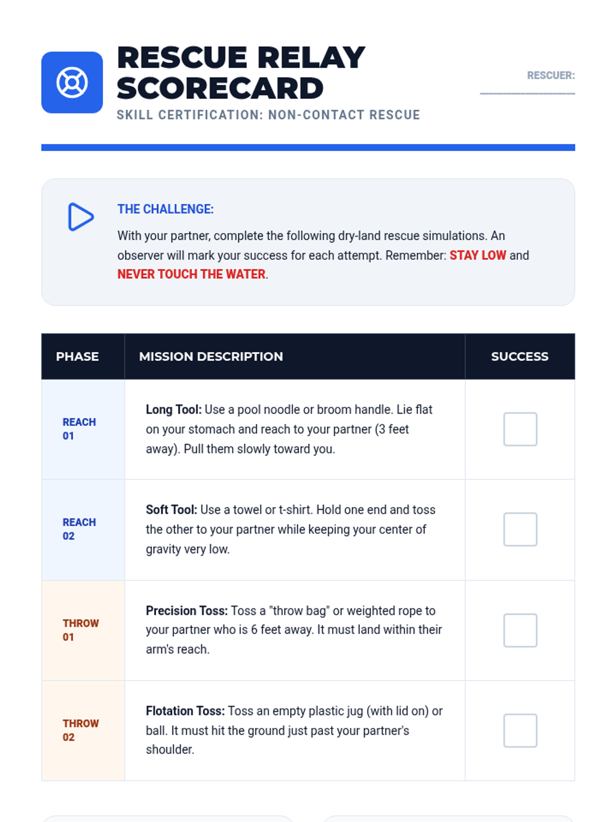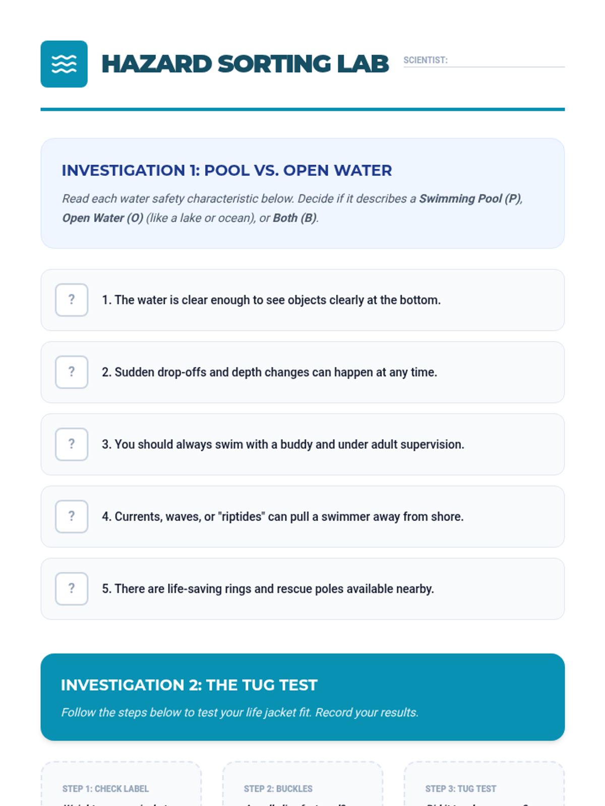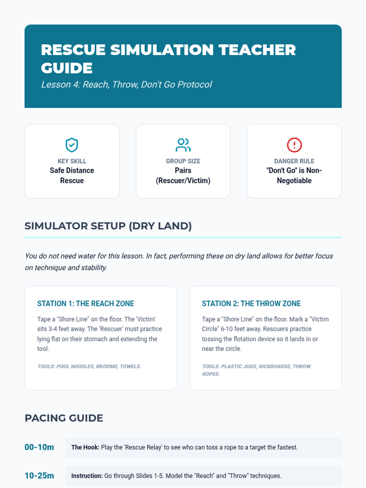 A comprehensive safety sequence for 4th graders covering fire prevention, escape planning, water hazard recognition, and non-contact rescue protocols. Students move from identifying household risks to practicing life-saving physical techniques and creating a family safety manual.