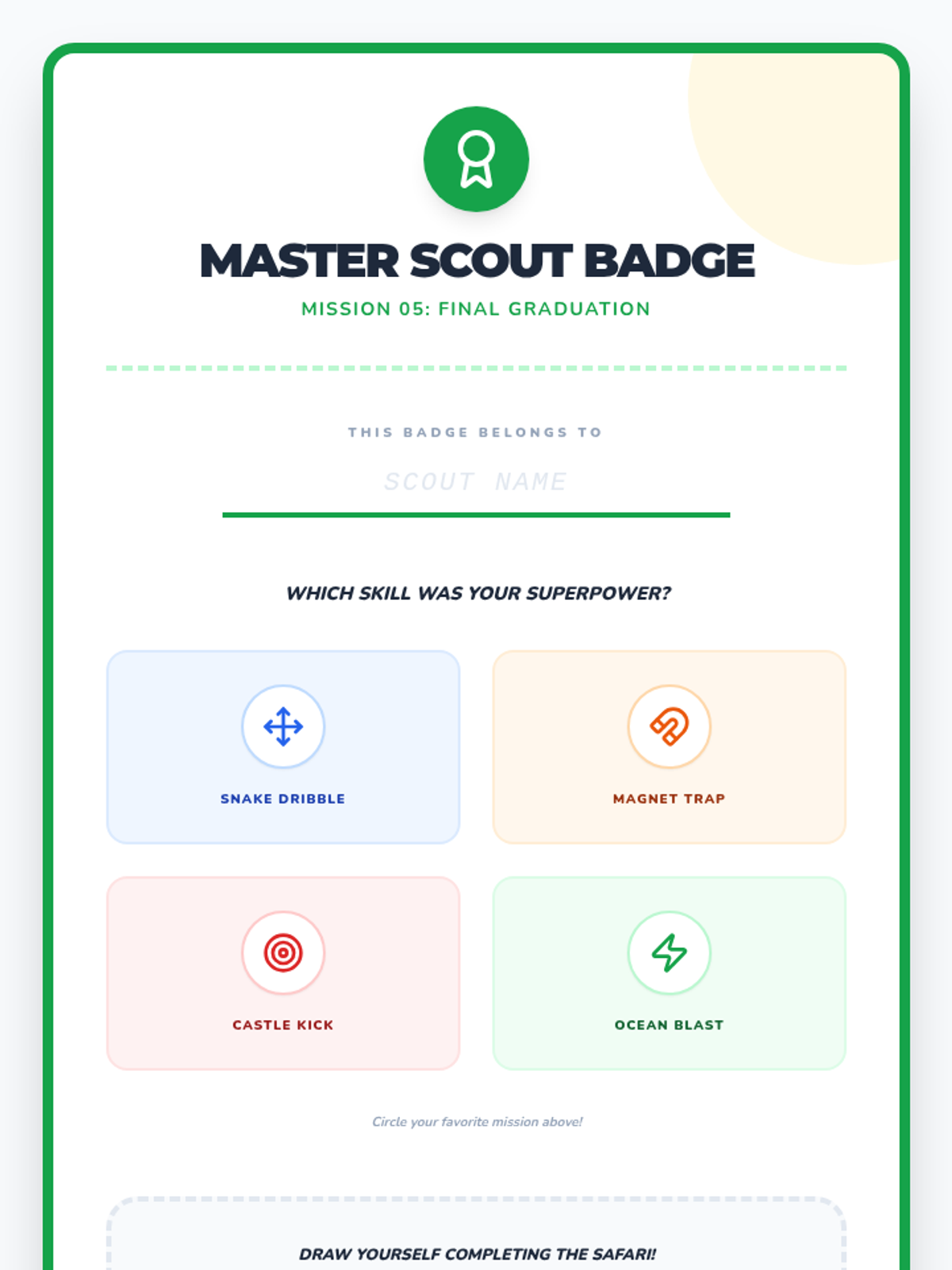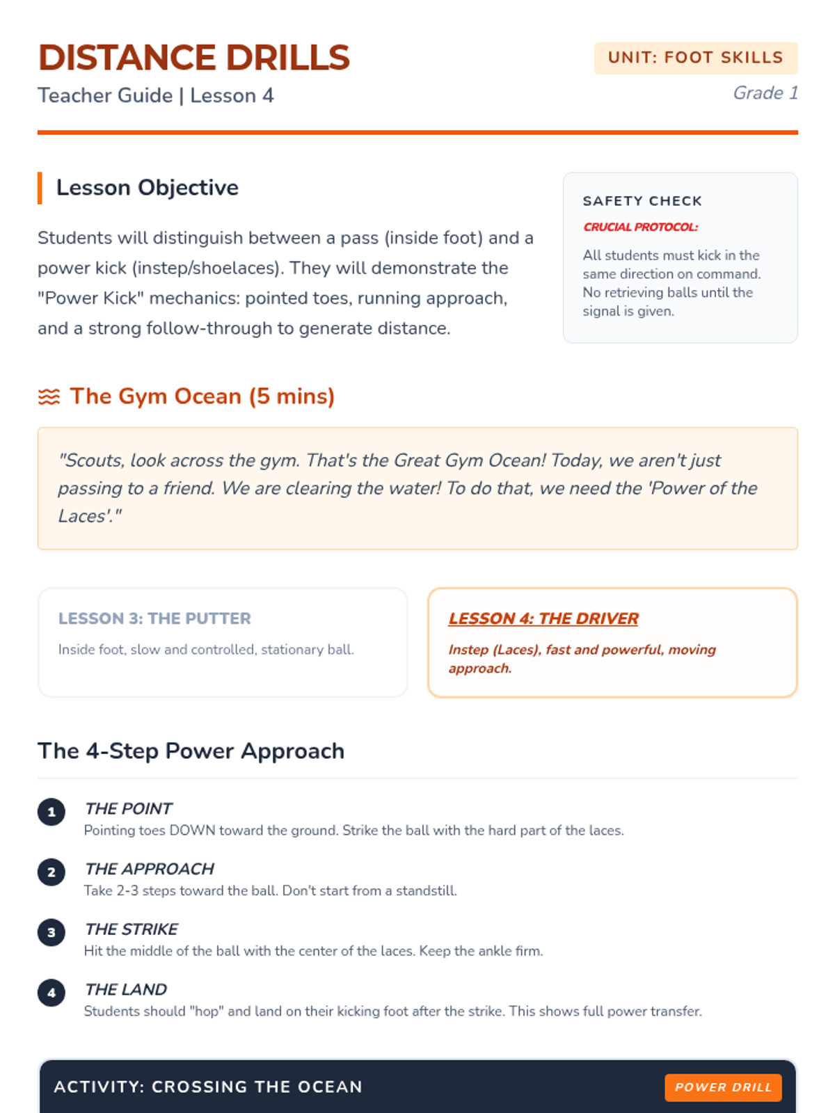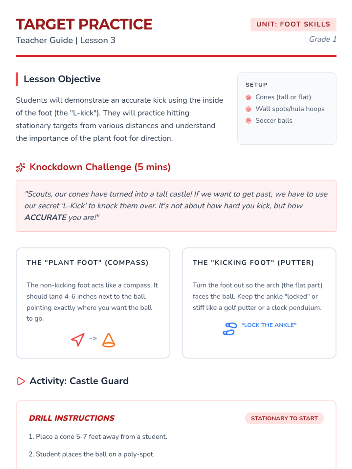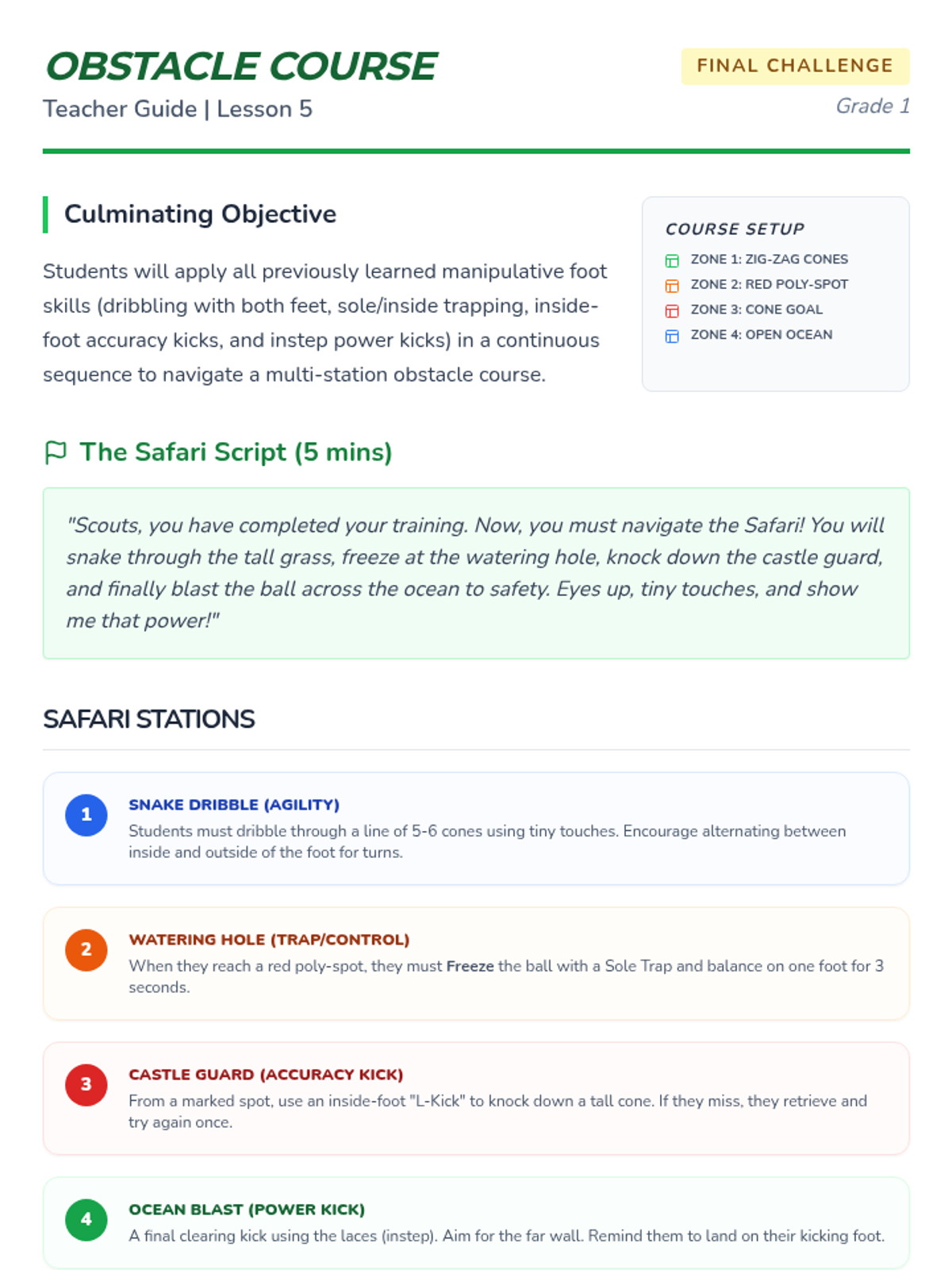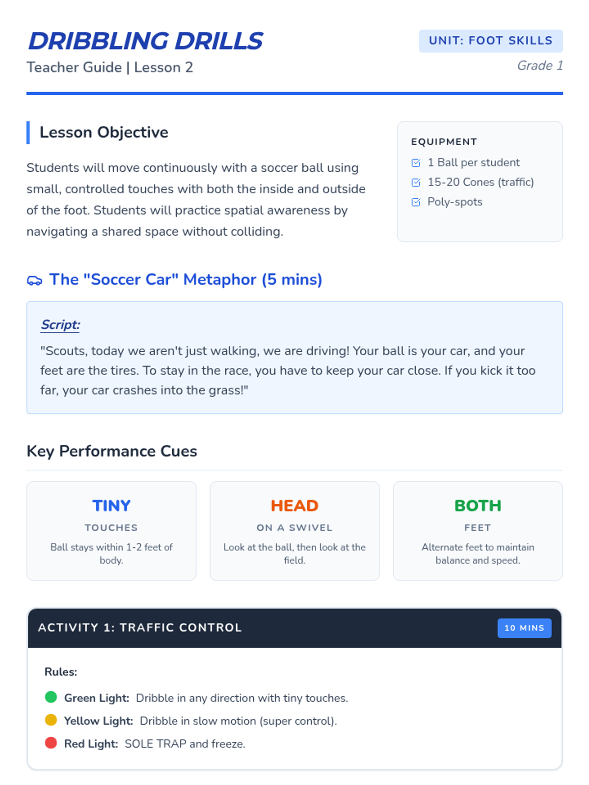 A 5-lesson sequence for 1st graders focusing on manipulative foot skills, including dribbling, trapping, and kicking, using a 'Soccer Scouts' theme.