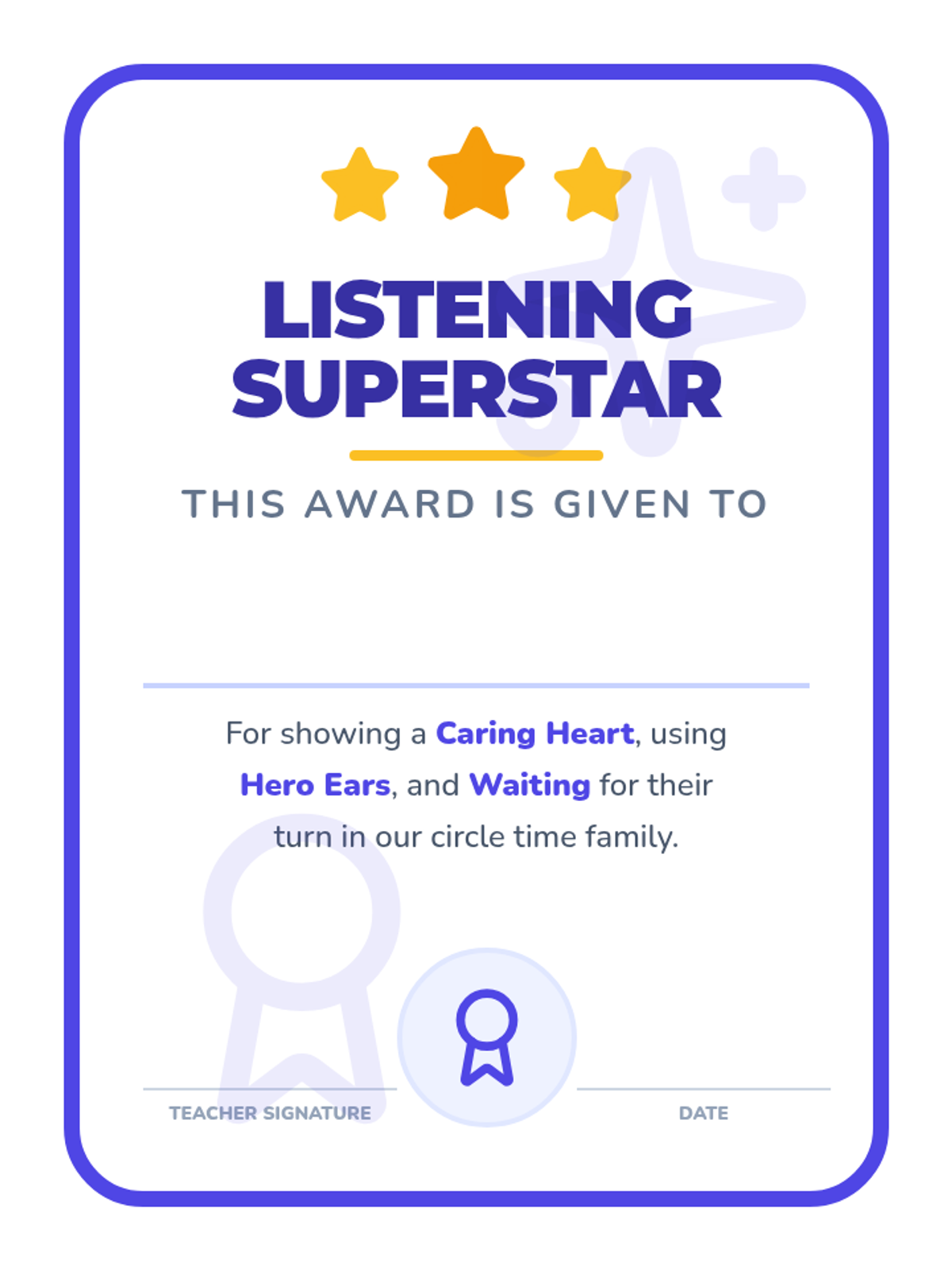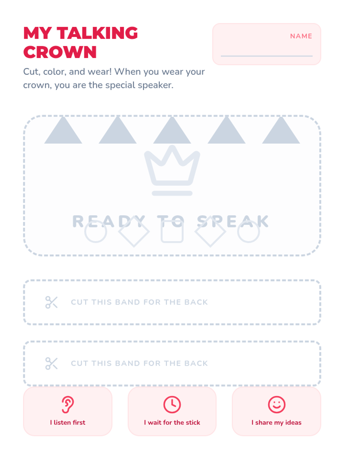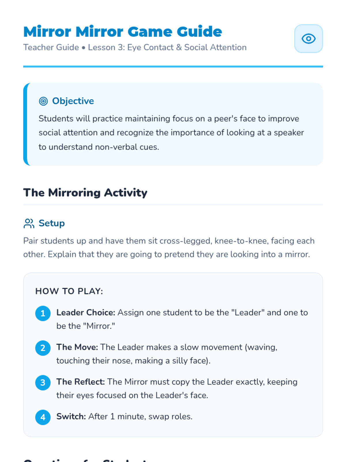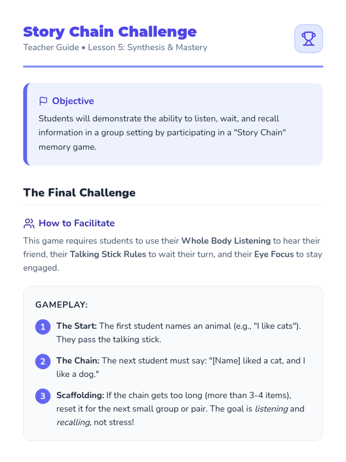 This sequence introduces Pre-K students to the core behaviors of active listening and turn-taking through visual aids, interactive games, and tactile tools like a talking stick. Students progress from individual self-regulation to collaborative group participation, building social-emotional competency.