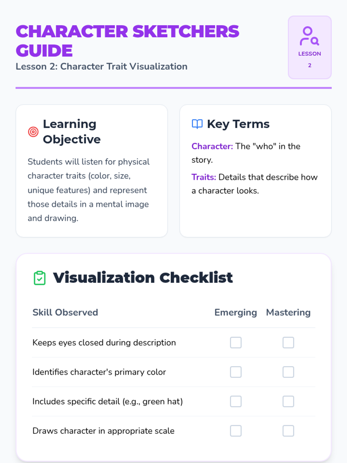 This sequence uses kinesthetic movement and role-play to help Kindergarten students develop visualization skills. By physically embodying actions, emotions, and sequences, students build a bridge between text and mental imagery.