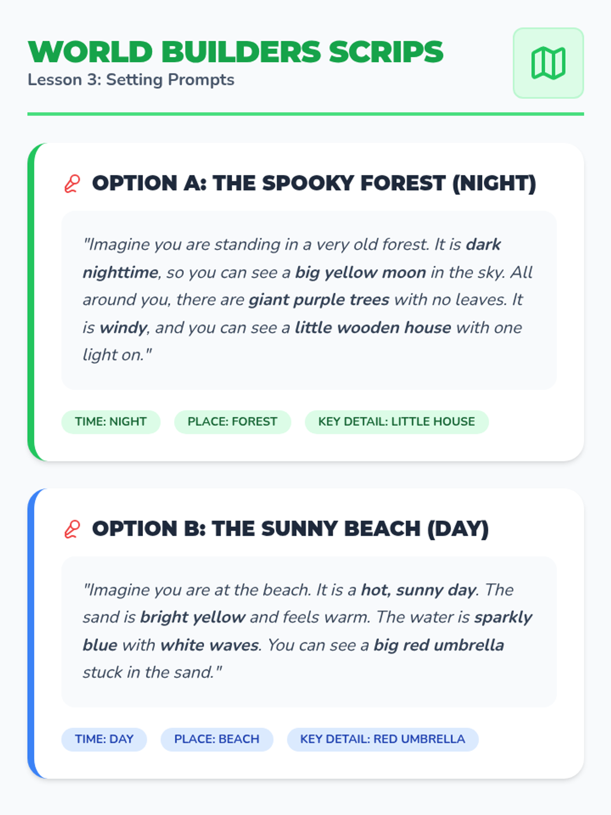 A Kindergarten sequence focused on building visualization skills through descriptive vocabulary. Students learn how adjectives like size, shape, and condition change the mental images they form while reading and listening.