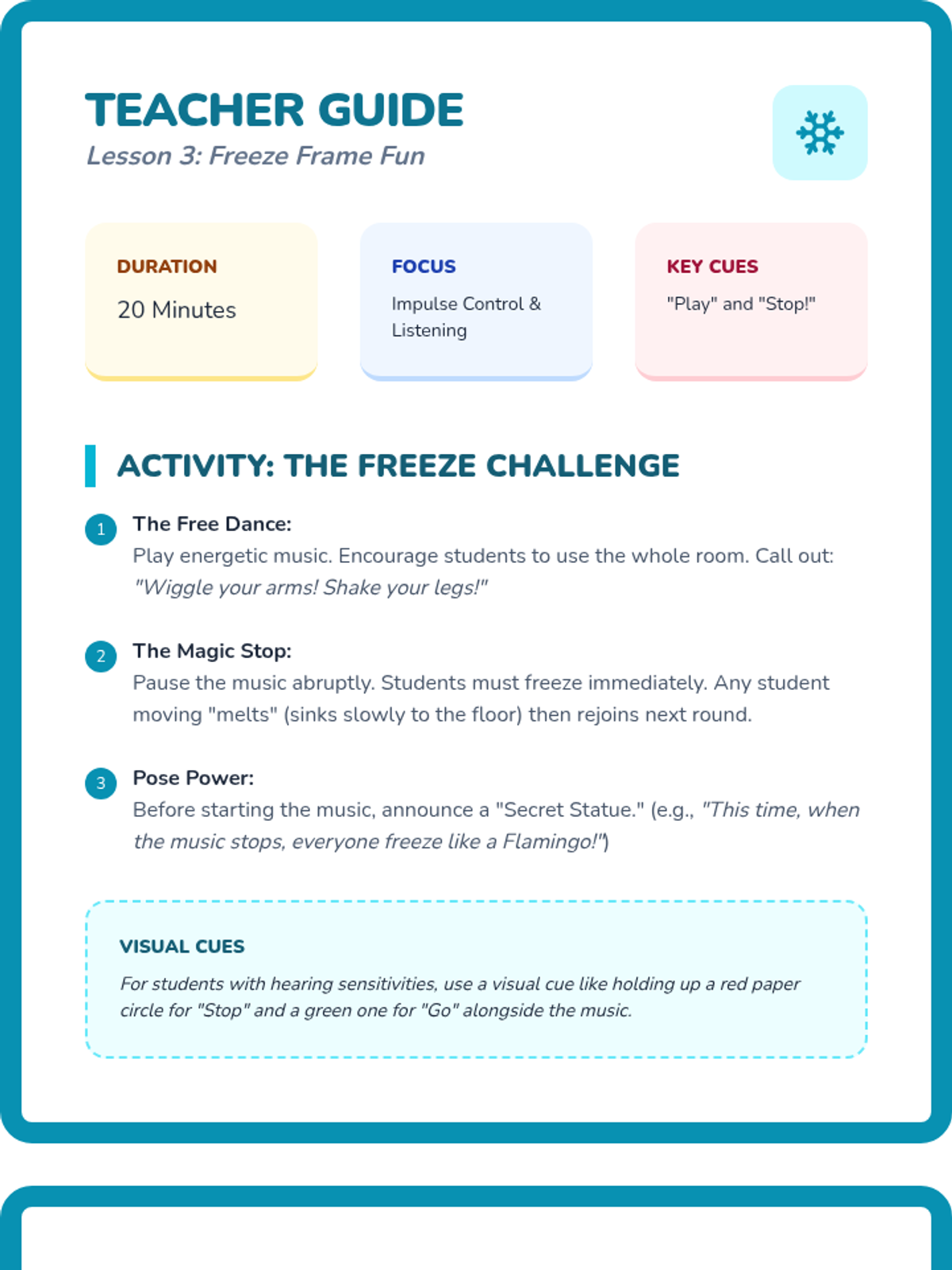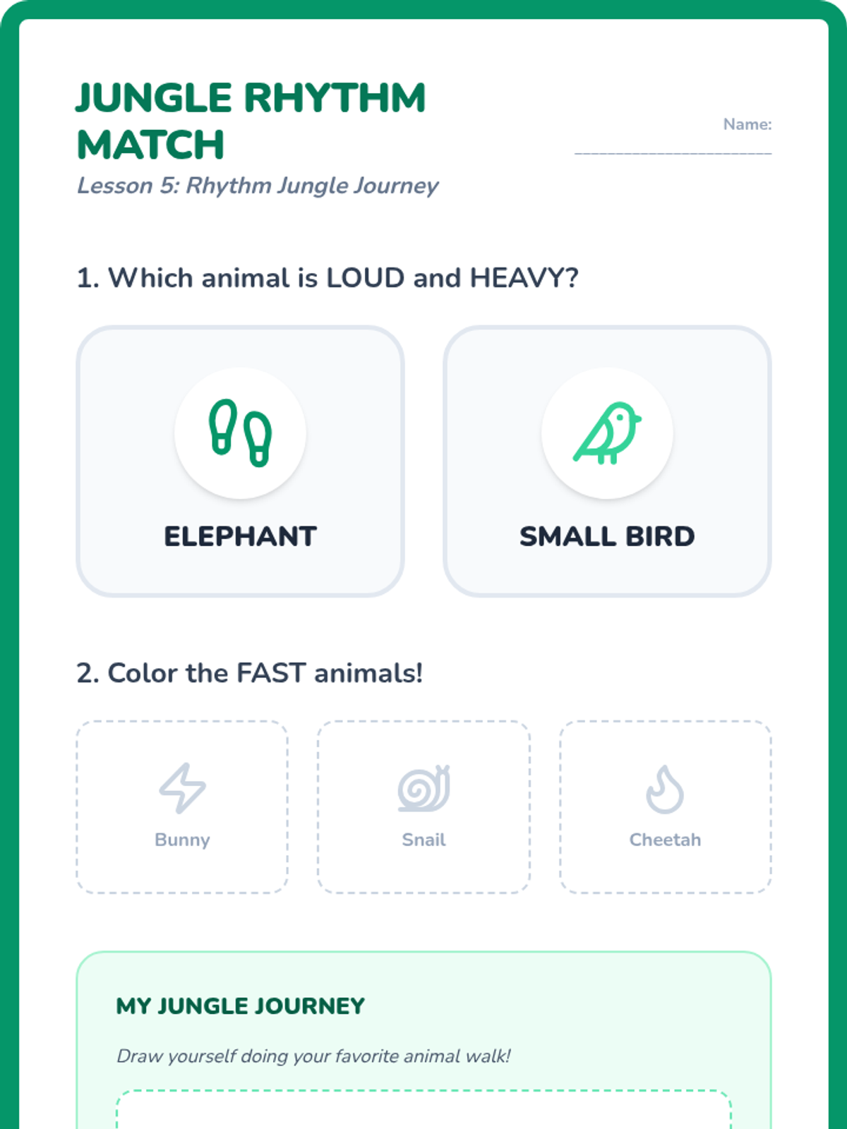 A physical education sequence for Pre-K students focusing on gross motor coordination through rhythm, tempo, and auditory cues. Students explore steady beats, speed variations, impulse control through freeze games, and force modulation using animal-themed activities.