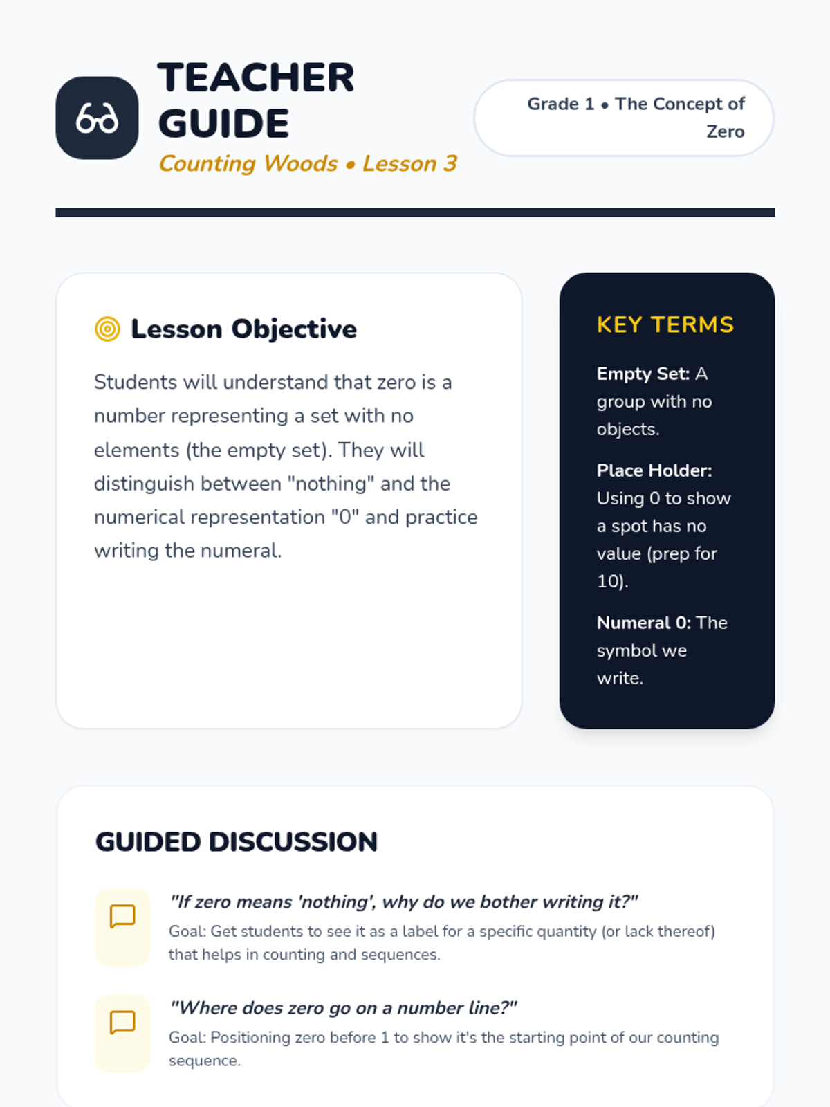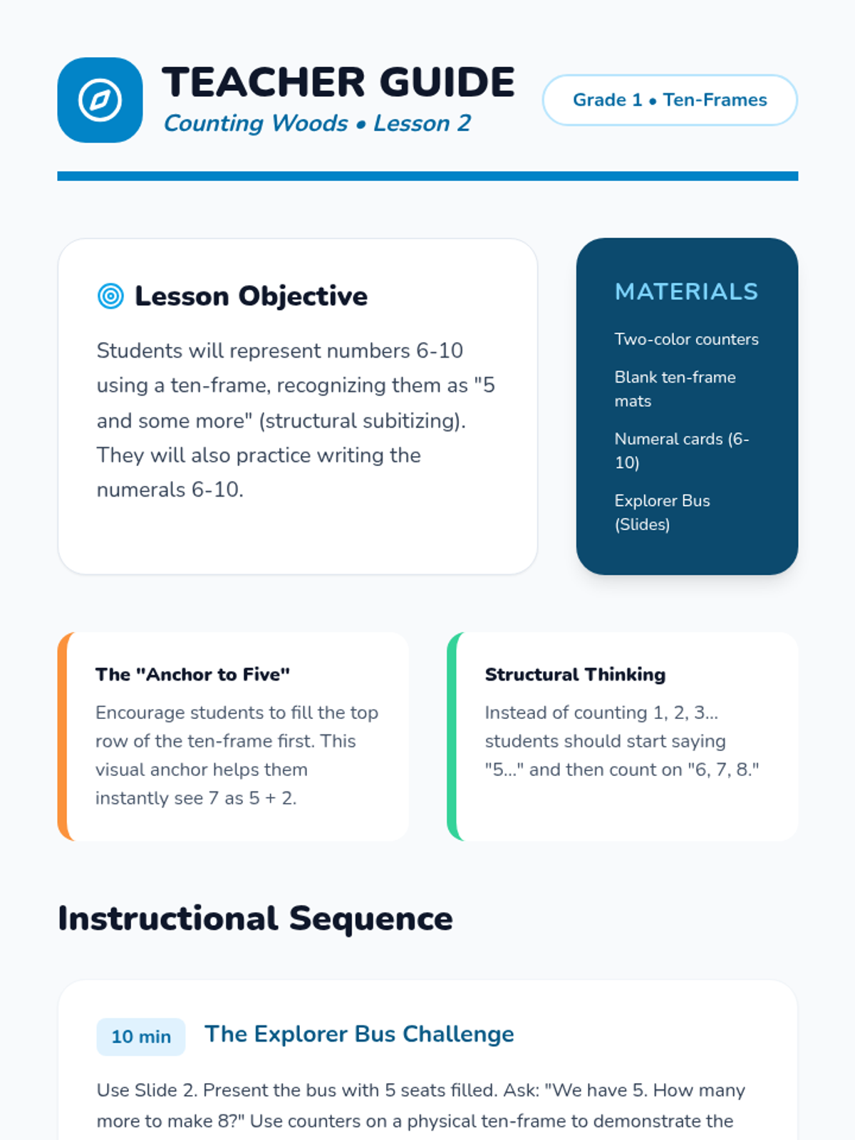 This foundational workshop sequence reinforces the critical connection between abstract numerals, spoken number words, and concrete quantities for numbers 0-10 using the 'Counting Woods' theme. Students progress from subitizing 1-5 to mastering ten-frames for 6-10, understanding zero, and finally ordering and comparing quantities in a culminating project.