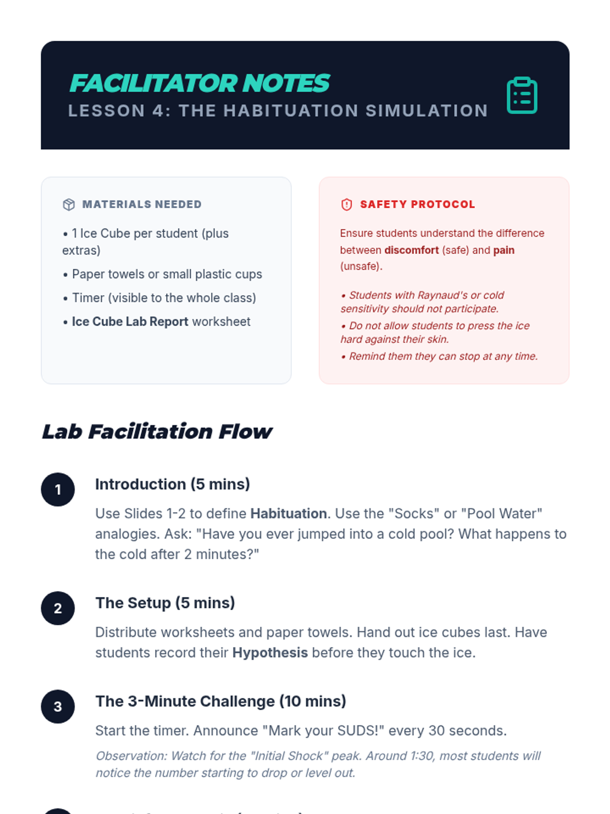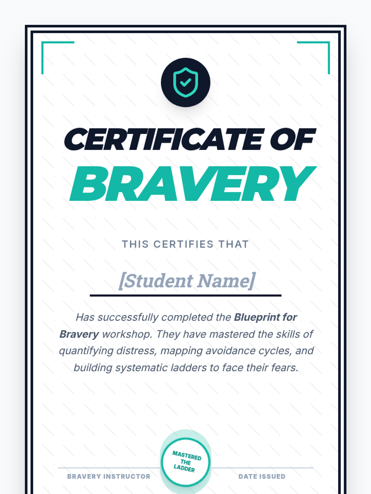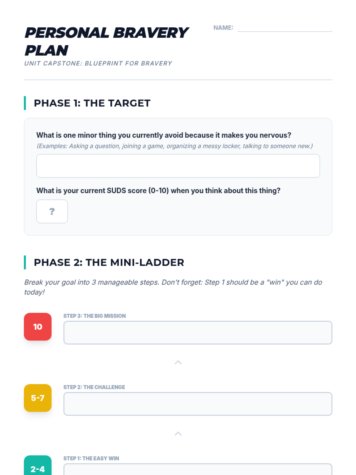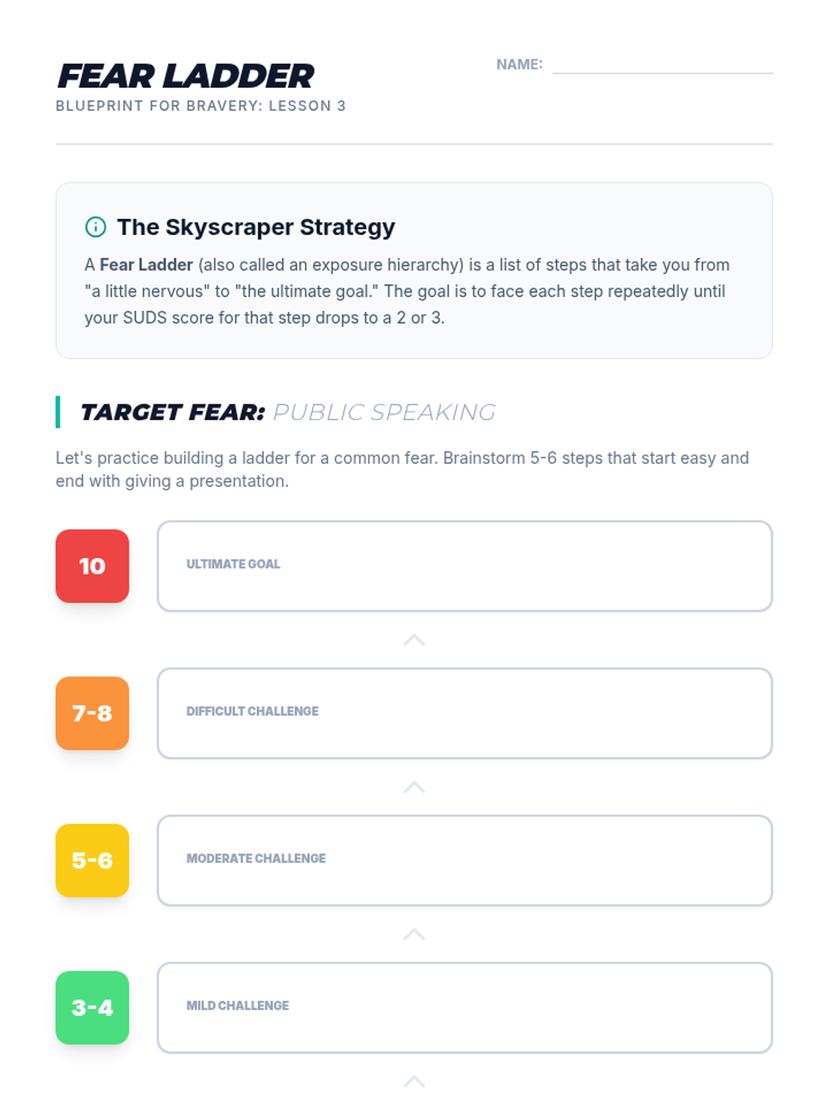 A 5-lesson unit for 7th graders that introduces the mechanics of exposure therapy. Students learn to identify avoidance cycles, measure distress using the SUDS scale, build fear ladders, and practice habituation through guided simulations.