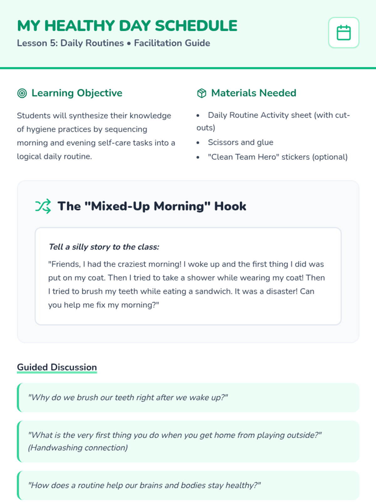 A comprehensive SEL-integrated hygiene curriculum for elementary scholars (K-4), focusing on self-awareness, social impact, and personal responsibility through the lens of a 'Glow Up'.