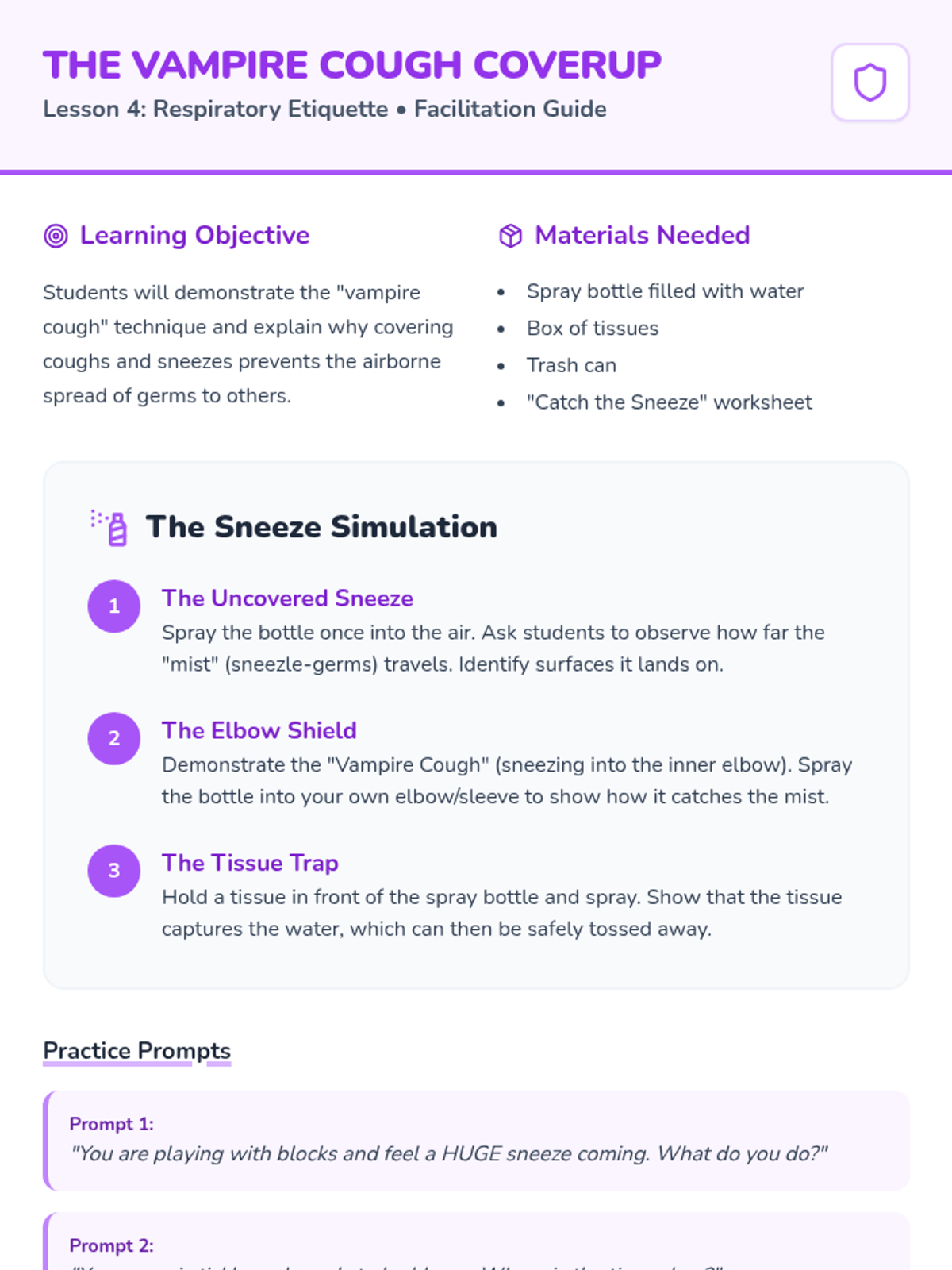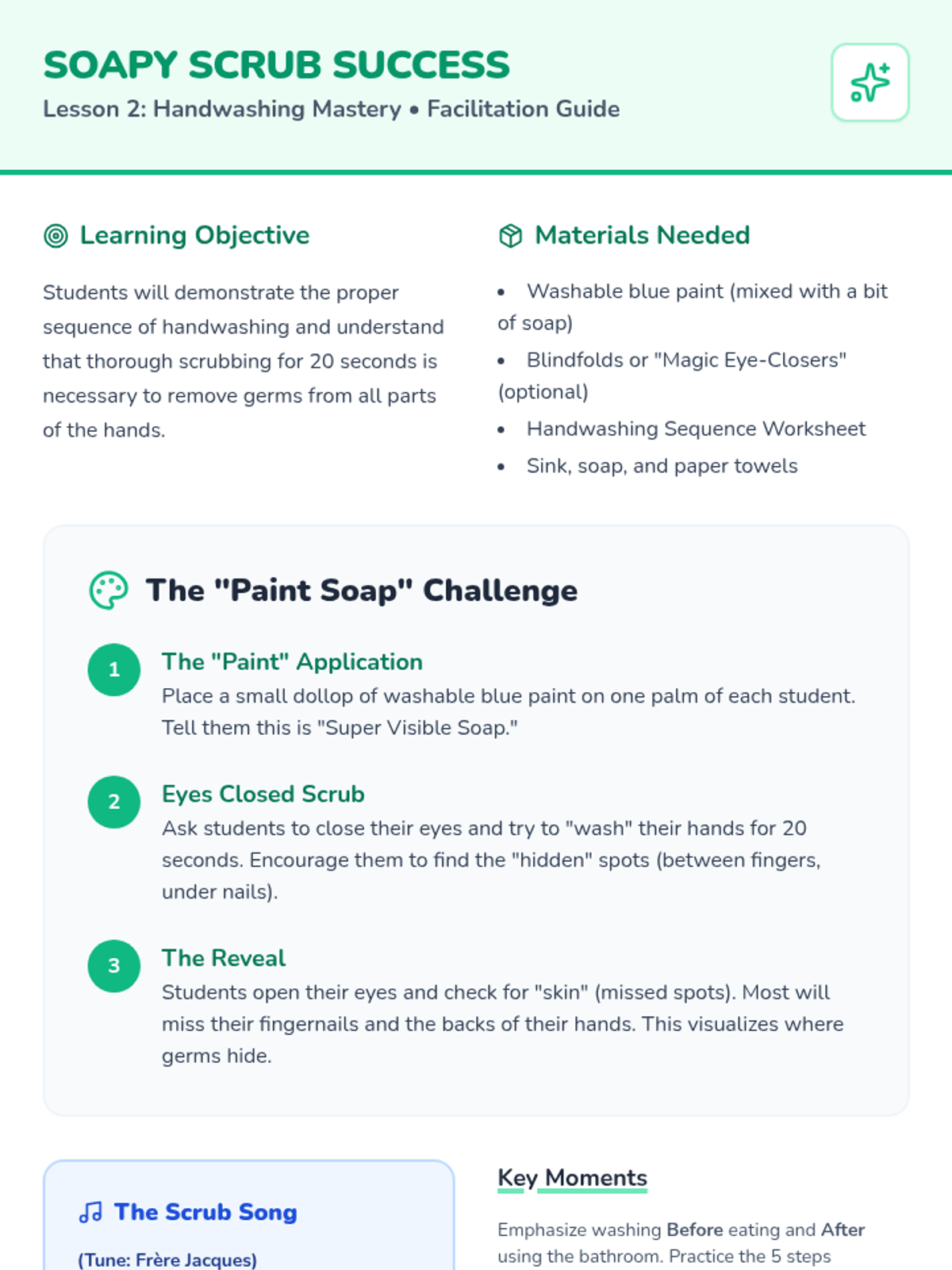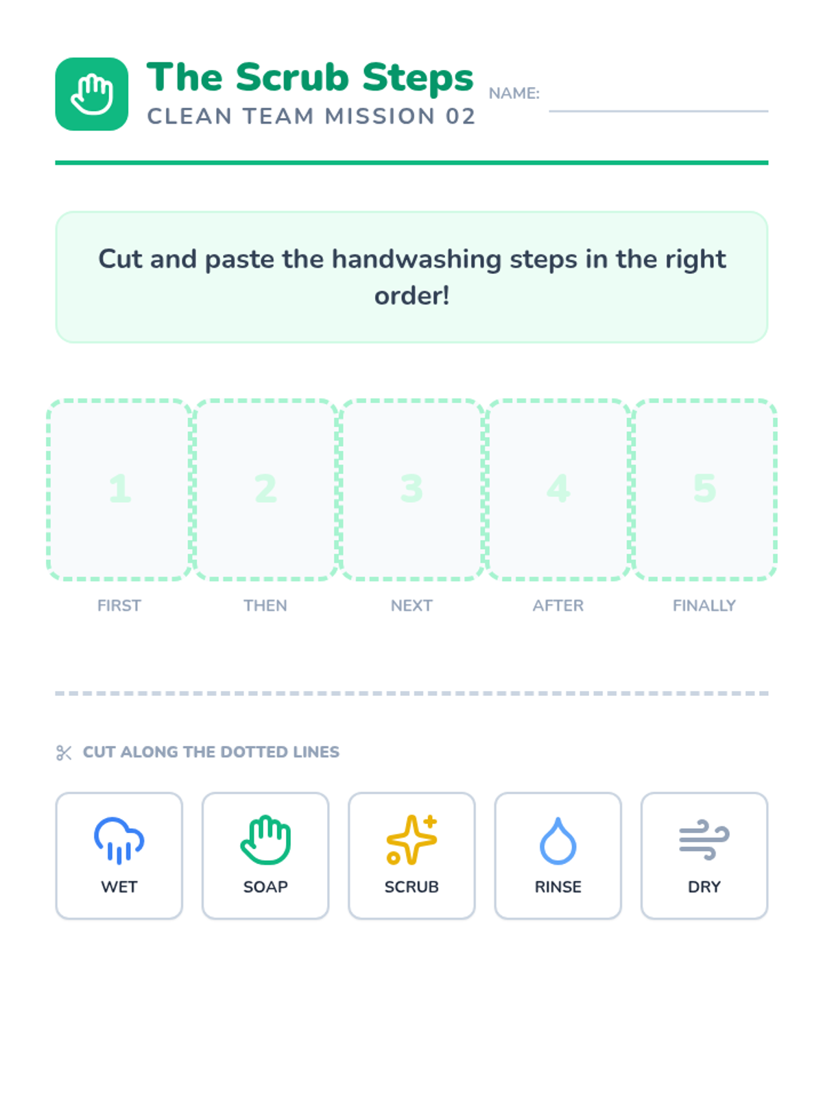 A Kindergarten sequence focused on personal hygiene, germ prevention, and daily self-care routines through hands-on simulations and skill-building activities.