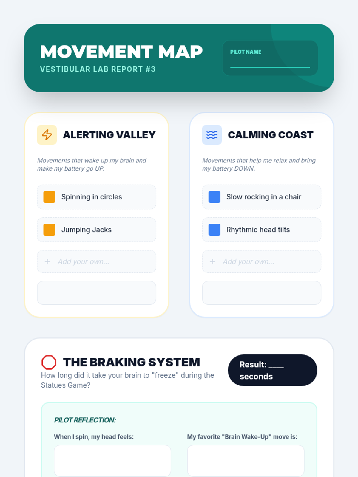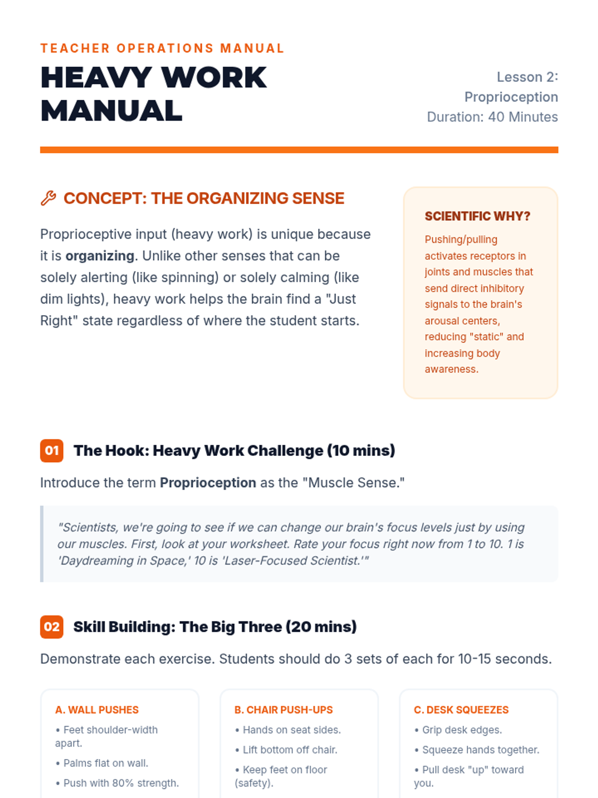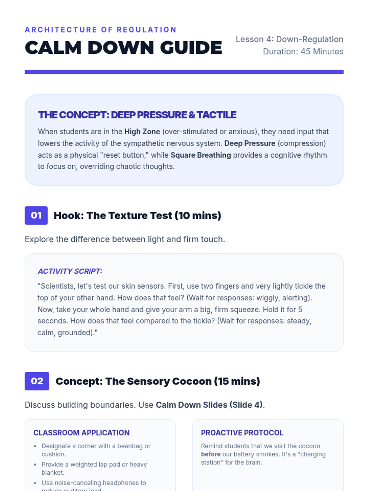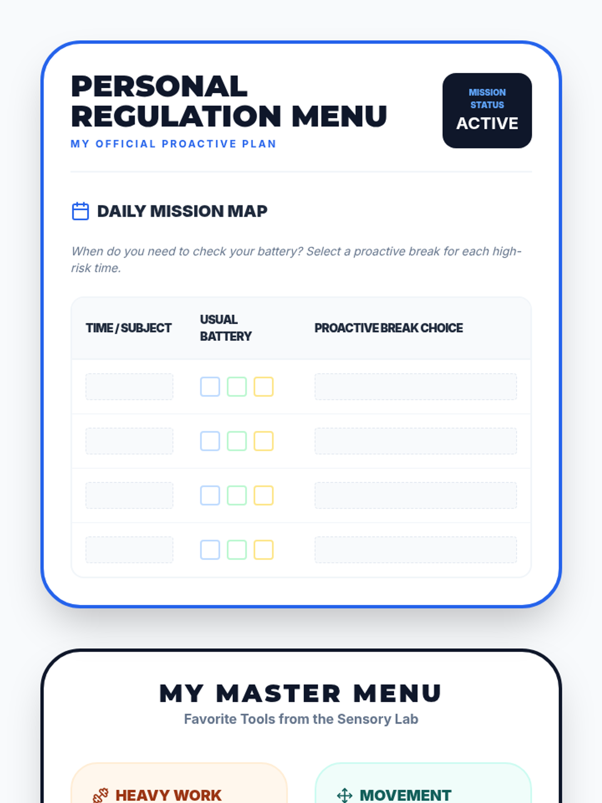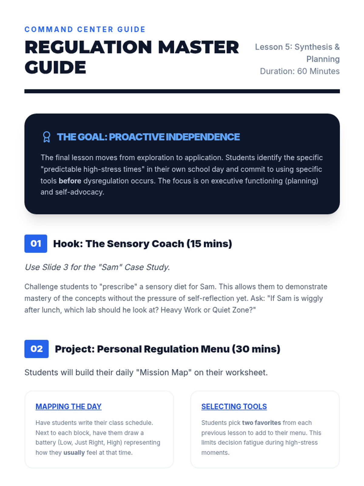 A comprehensive sequence for 5th-grade students to develop self-awareness of their internal sensory states and create a personalized toolkit of proactive regulation strategies. Students explore interoception, proprioceptive input, vestibular strategies, and calming routines to build a daily self-regulation plan.