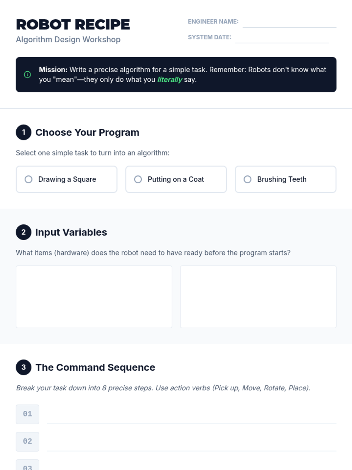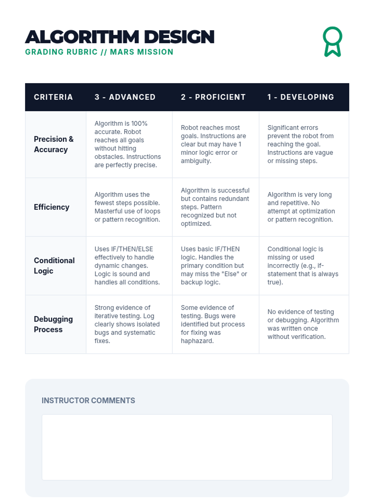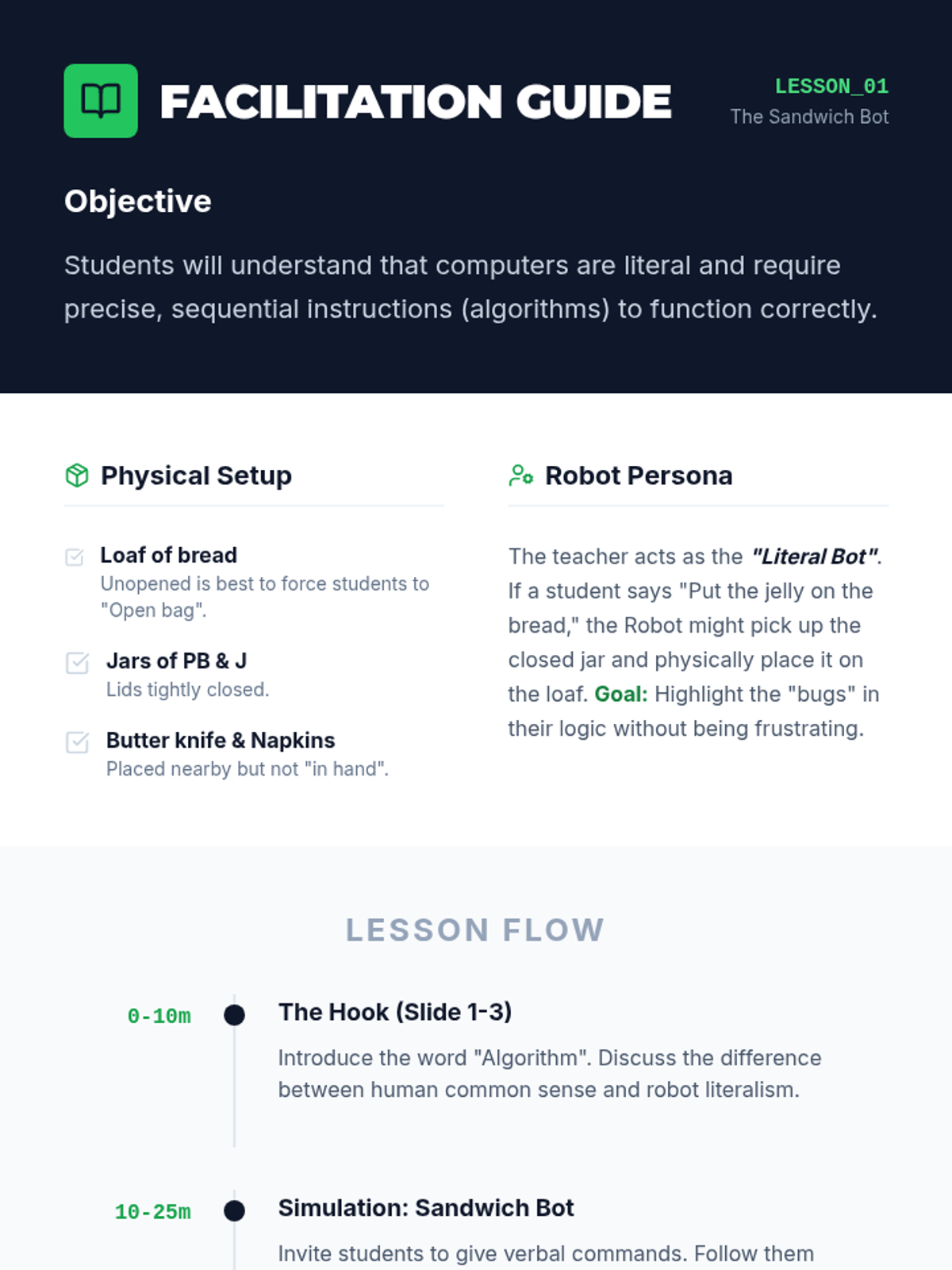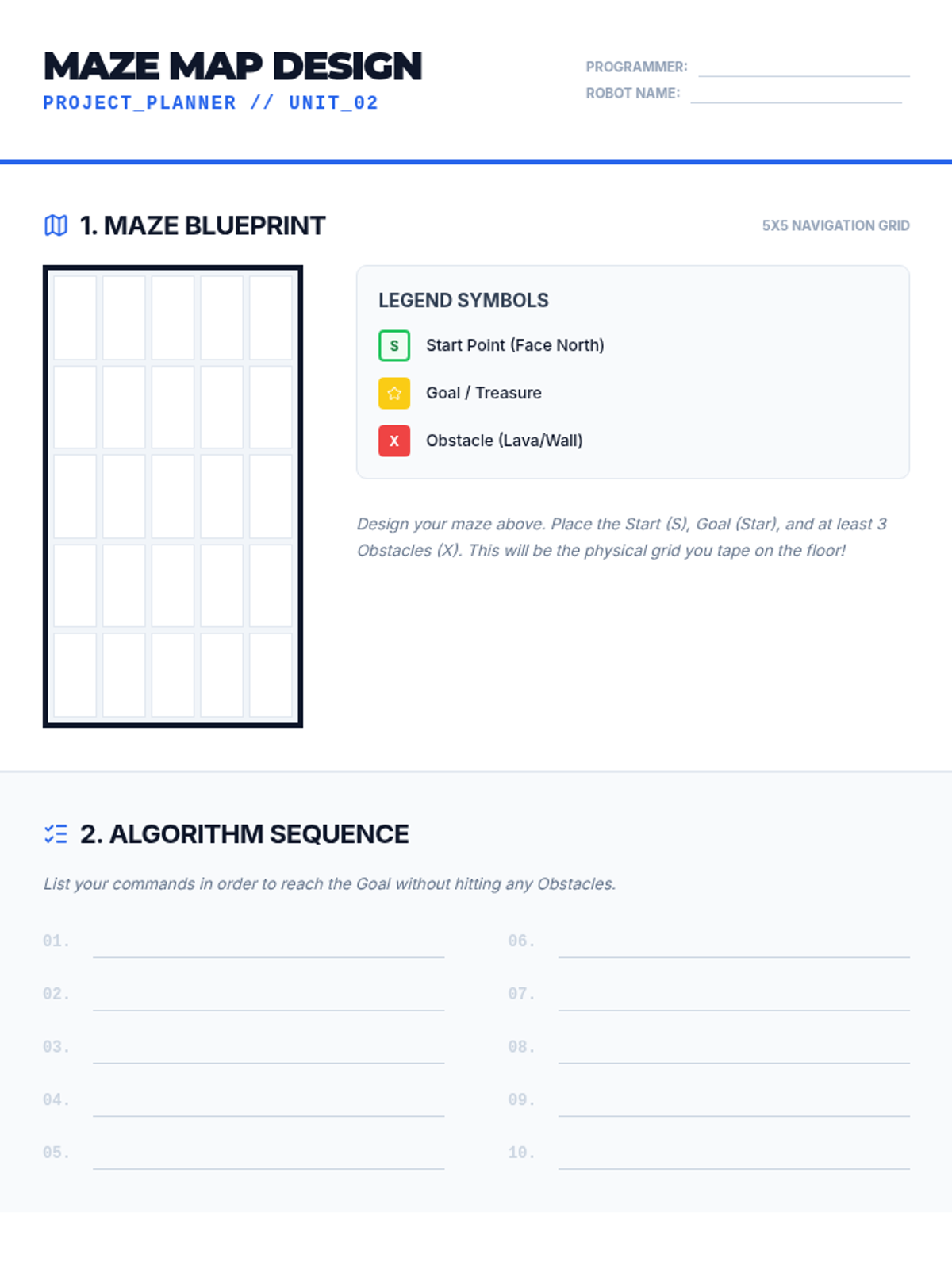 A 5th-grade sequence that introduces students to the foundational concepts of algorithms as precise, unambiguous sets of instructions through a game-based simulation approach. Students progress from basic sequencing to complex debugging and conditional logic, culminating in an iterative engineering challenge.