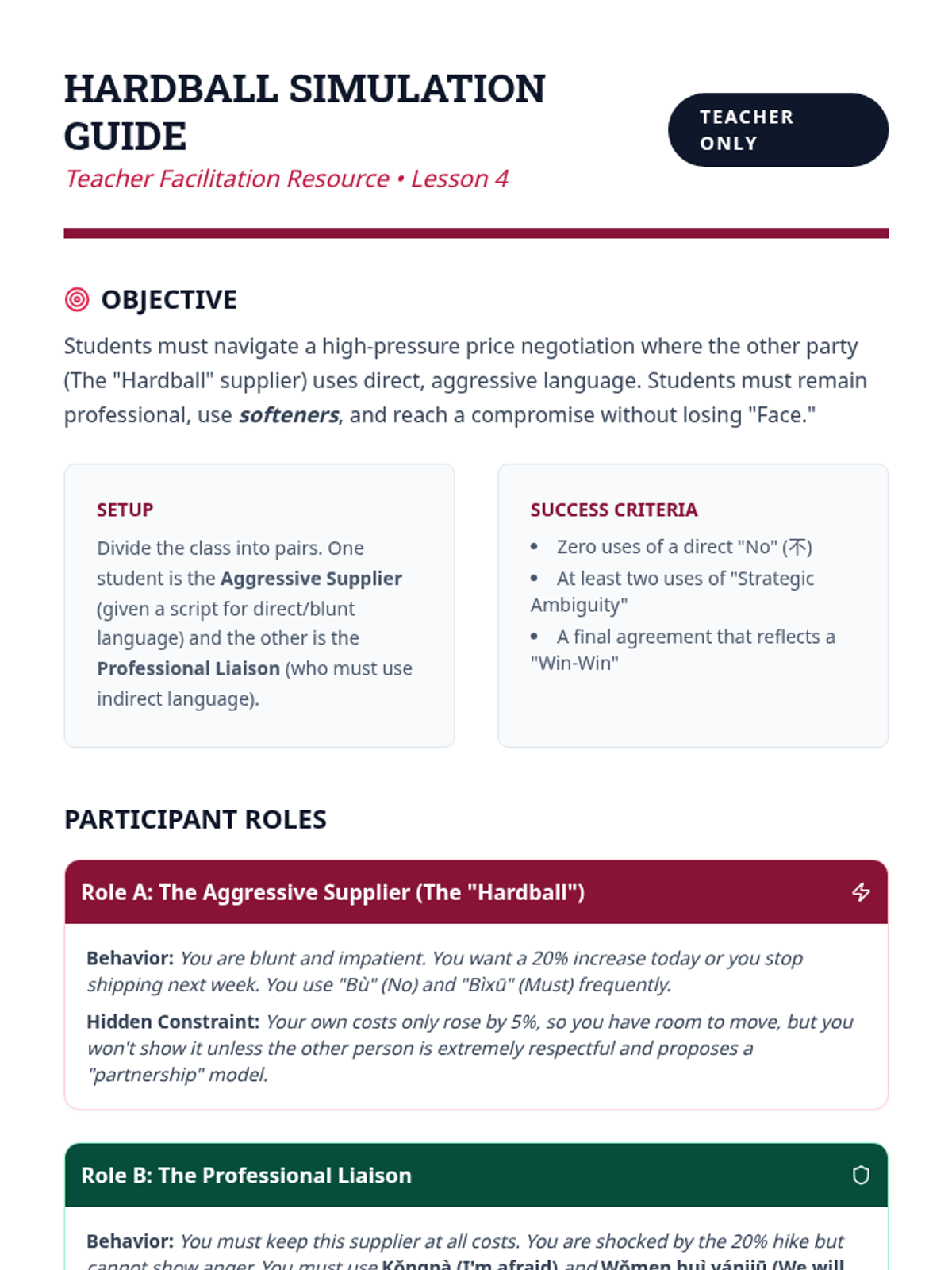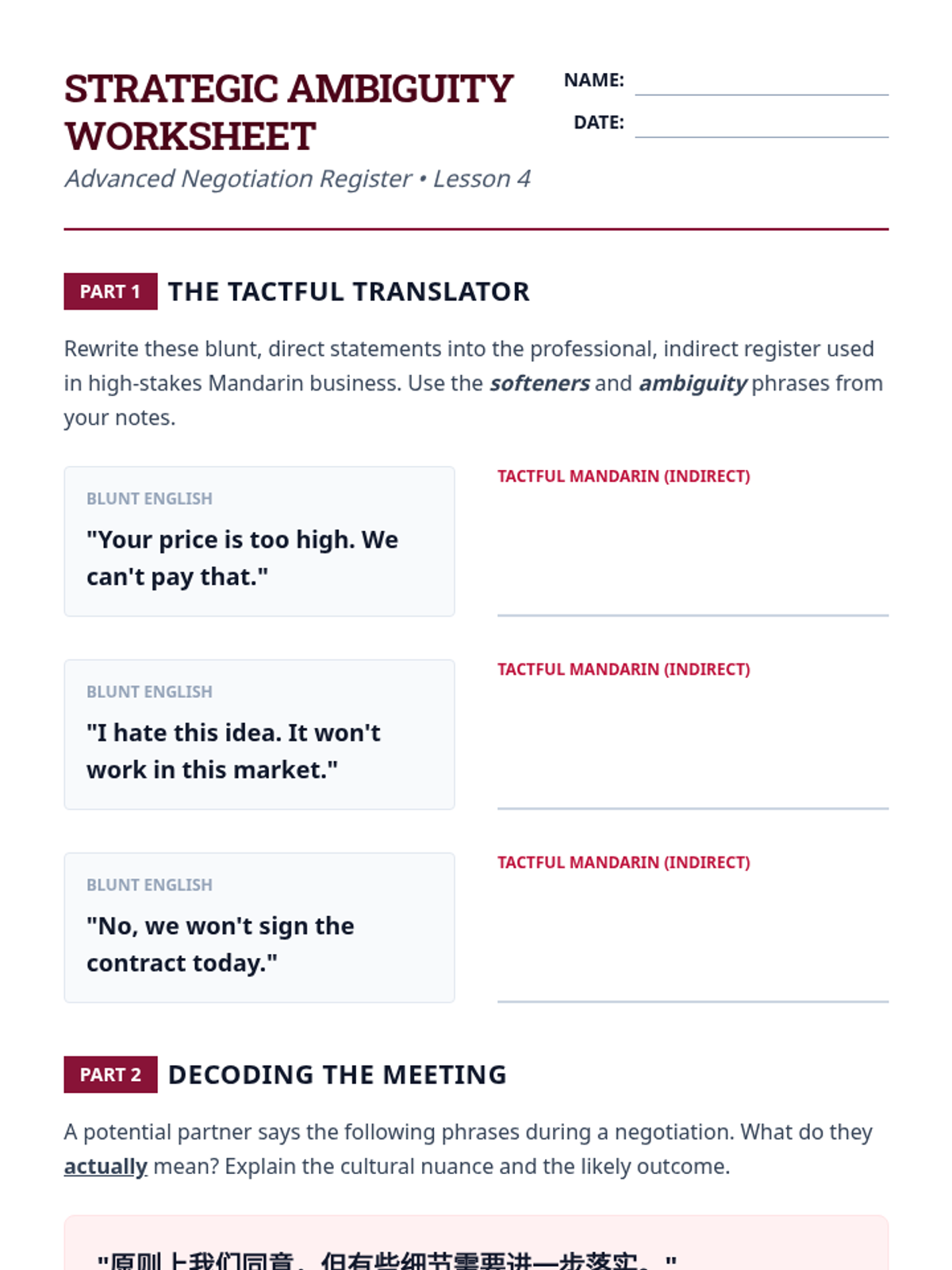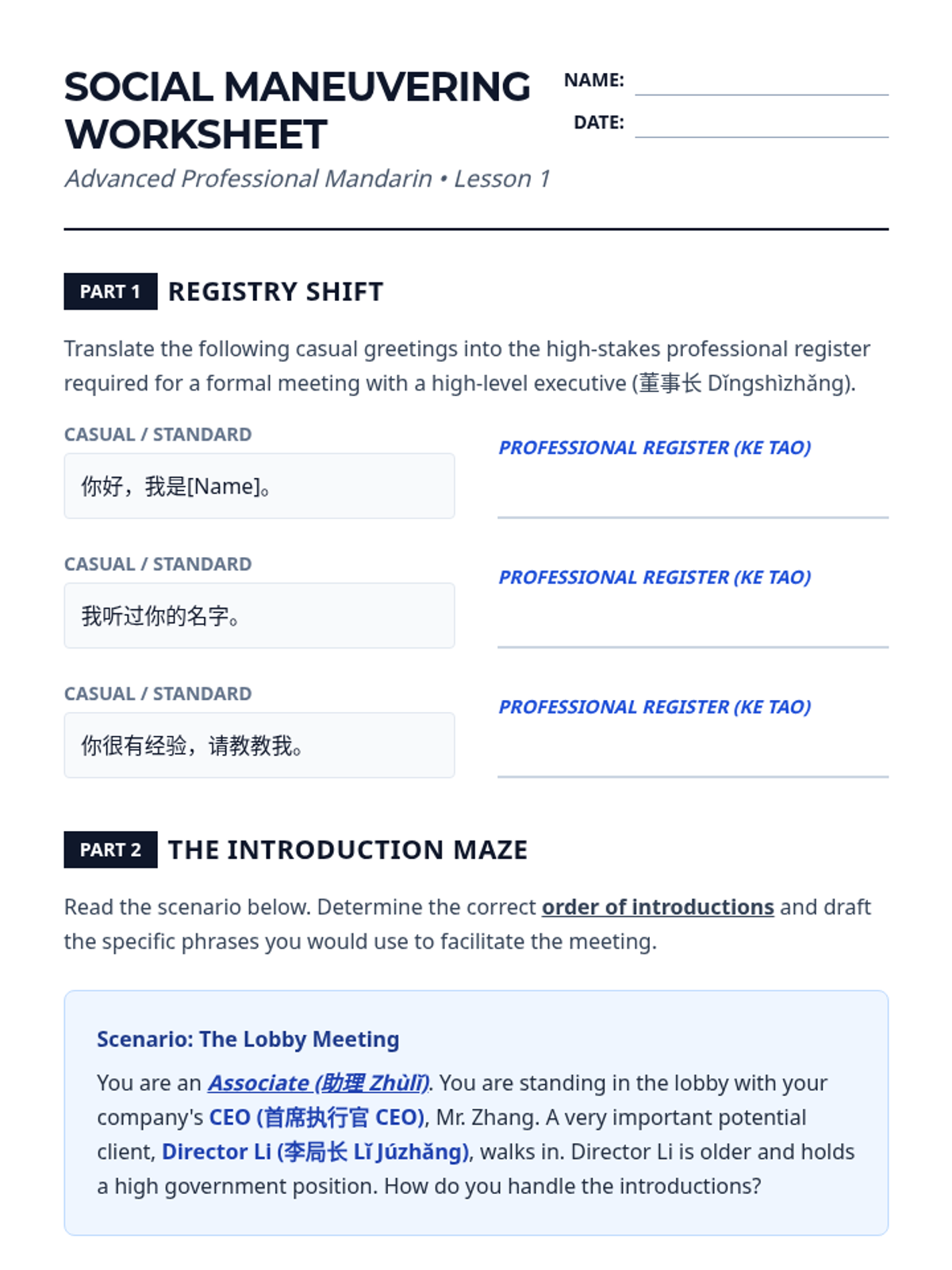 This advanced Mandarin Chinese sequence prepares 12th-grade students for professional environments by focusing on formal business etiquette, contract terminology, data presentation, and high-stakes negotiation strategies. Through simulations and authentic text analysis, students master the linguistic nuances of power dynamics and cultural expectations in global commerce.
