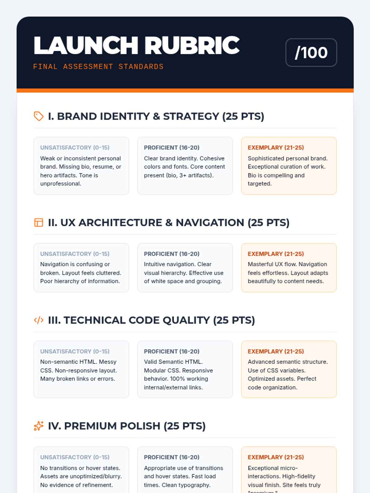 A comprehensive sequence for high school seniors to plan, design, and build a professional digital portfolio. Students move from brand strategy and content curation to high-fidelity coding and peer-led usability testing.