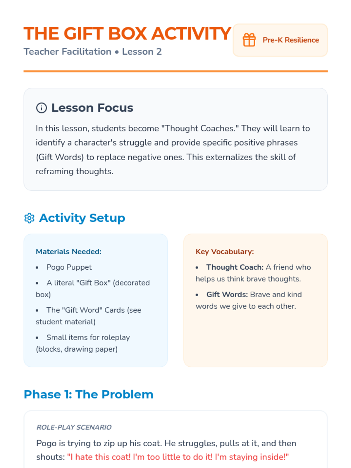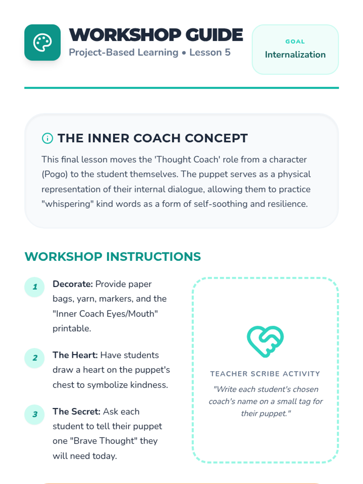 A puppetry and storytelling-based sequence for Pre-K students to learn positive self-talk. Students act as 'thought coaches' for characters before practicing self-coaching through role-play and creative arts.