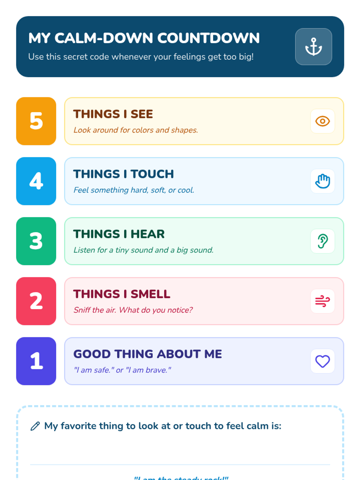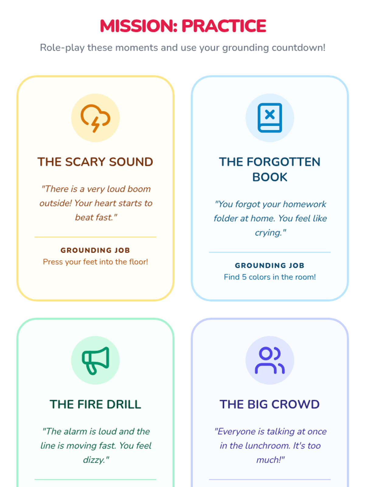 This sequence introduces 1st-grade students to sensory grounding techniques to manage overwhelming emotions. Students learn to use their five senses to reconnect with their environment and stay calm during stressful moments.