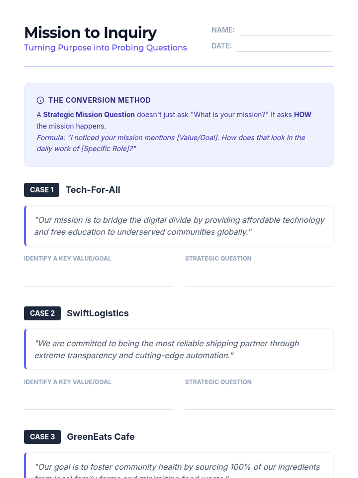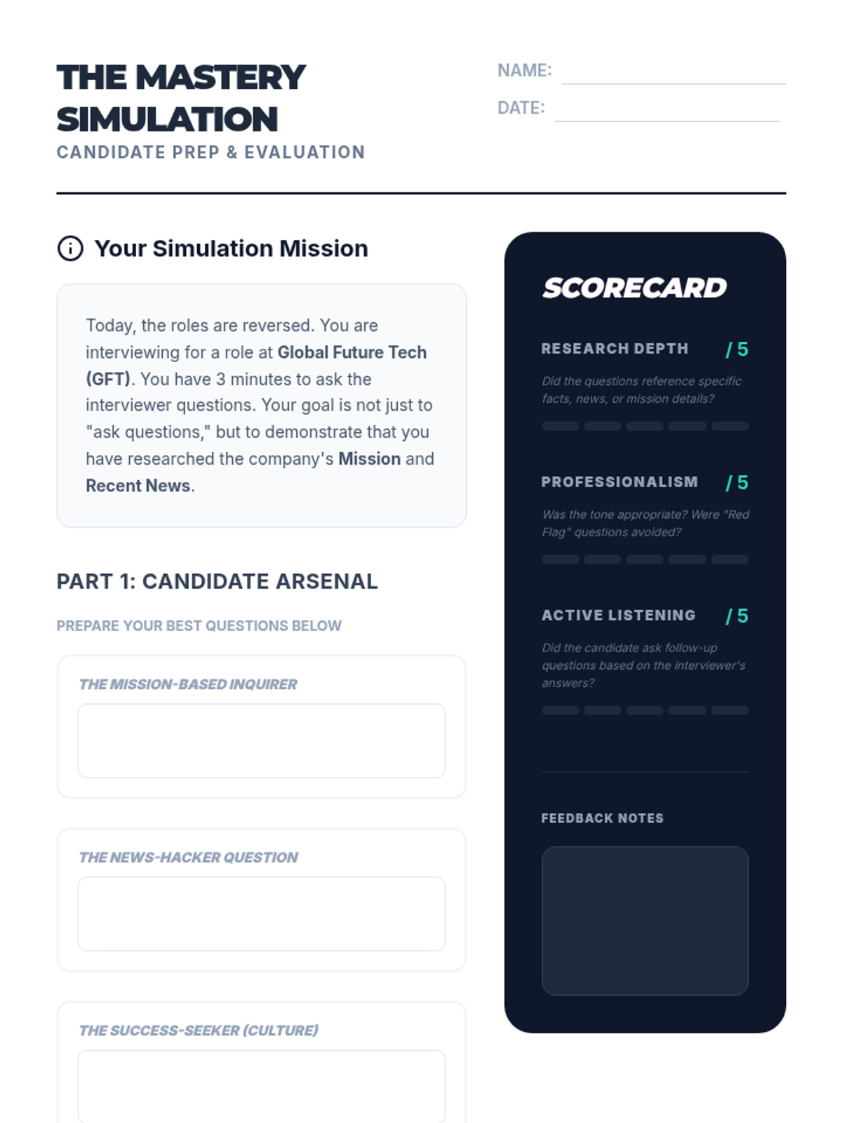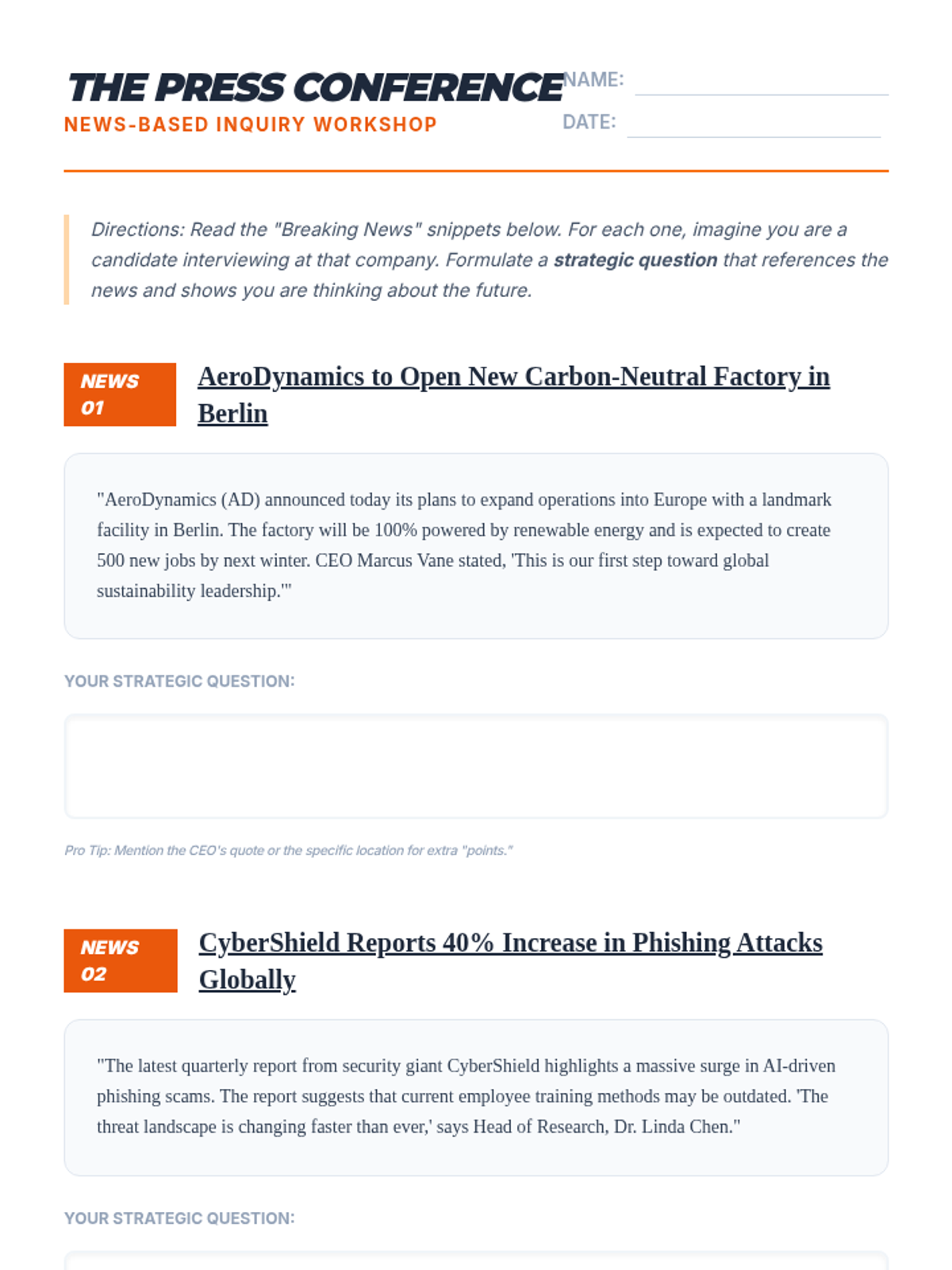 A sequence for 8th grade students to master the art of asking strategic interview questions. Students progress from basic inquiry to formulating high-level questions based on company research and news.