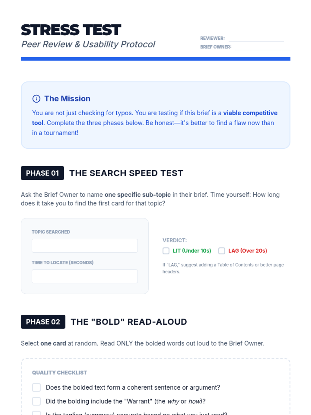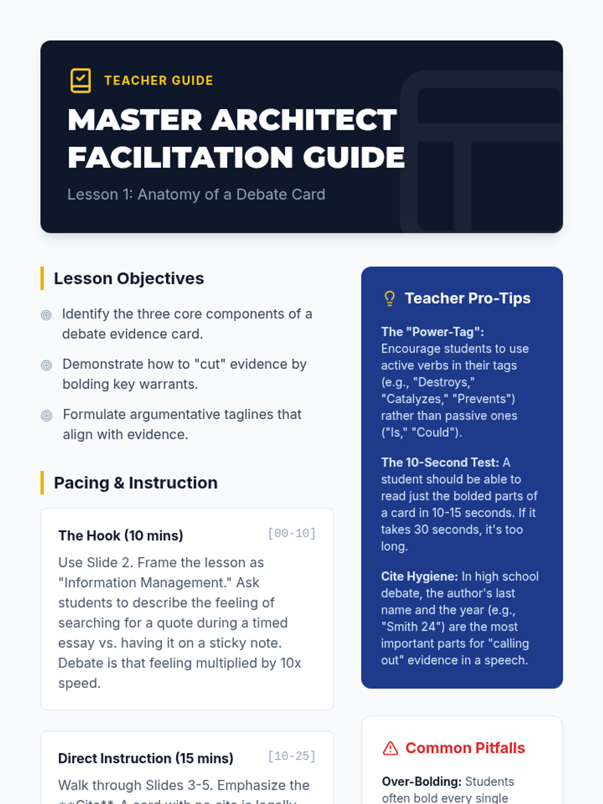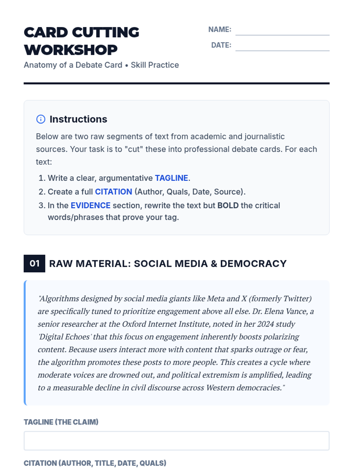 A project-based unit where 9th-grade students master the technical skills of debate research, from cutting individual evidence cards to assembling comprehensive competitive briefs. Students learn how to transform raw information into organized, strategically deployable arguments.