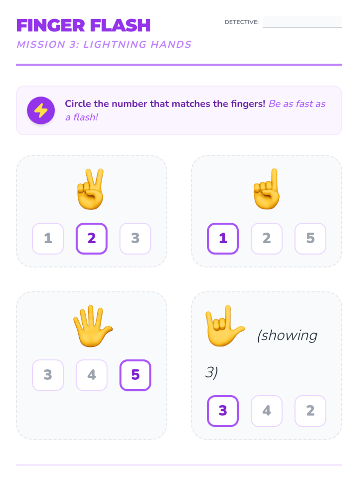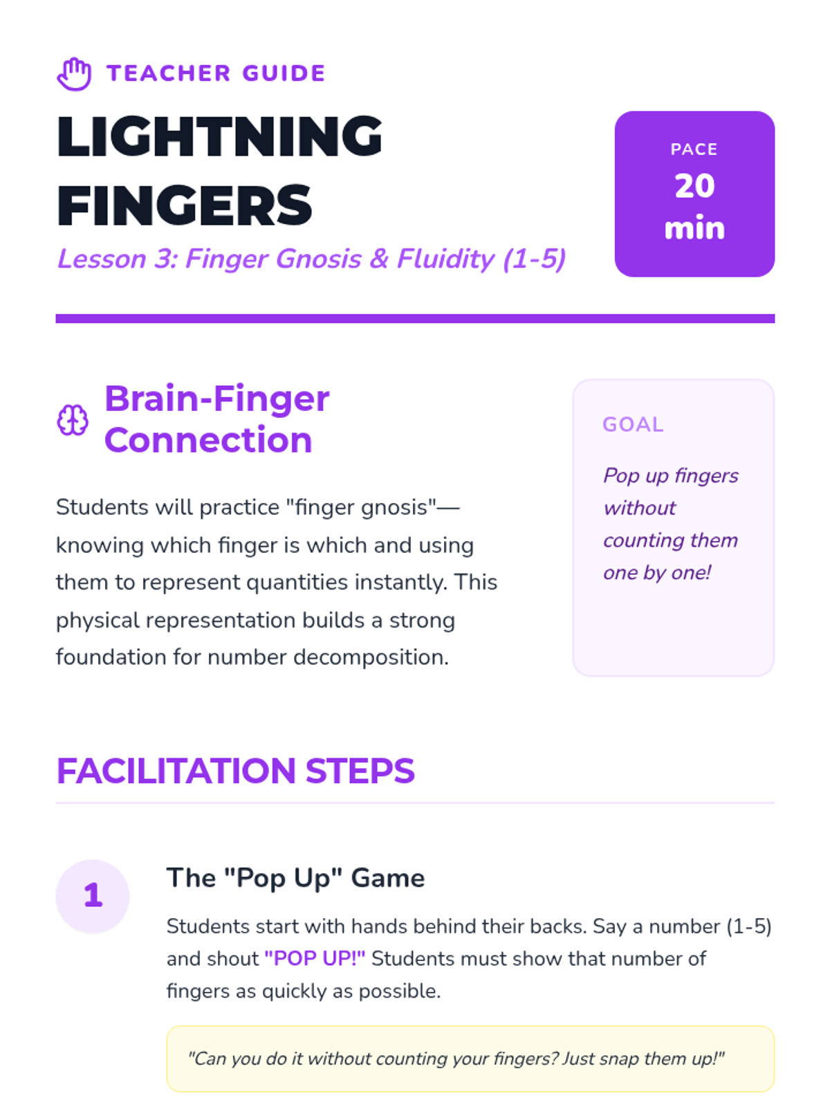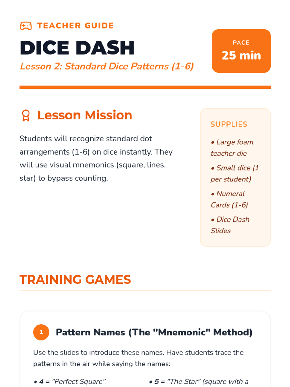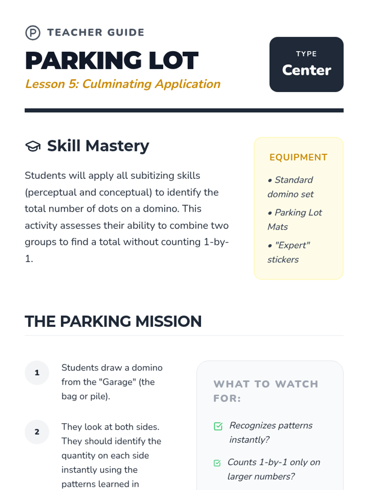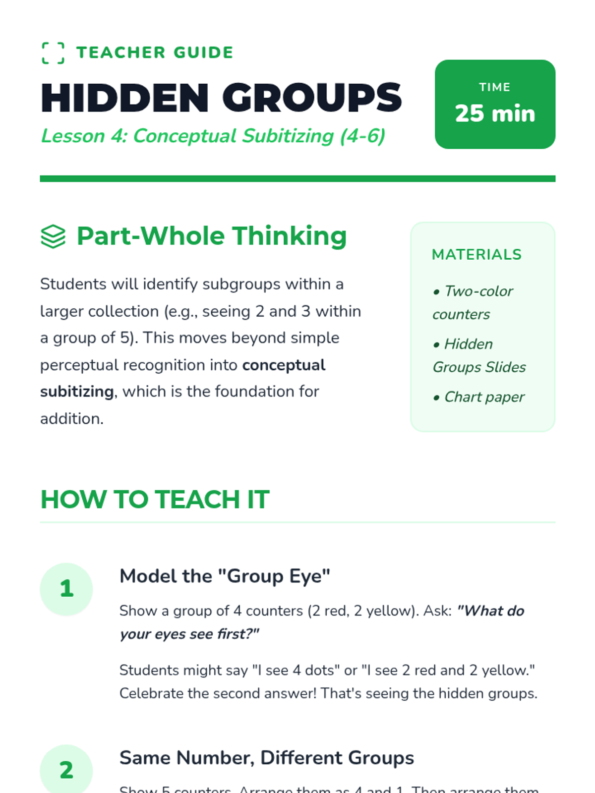 A Kindergarten sequence focused on subitizing—the ability to instantly recognize small quantities without counting. Students move from simple perceptual subitizing (1-3) to conceptual subitizing using dice, fingers, and group patterns.