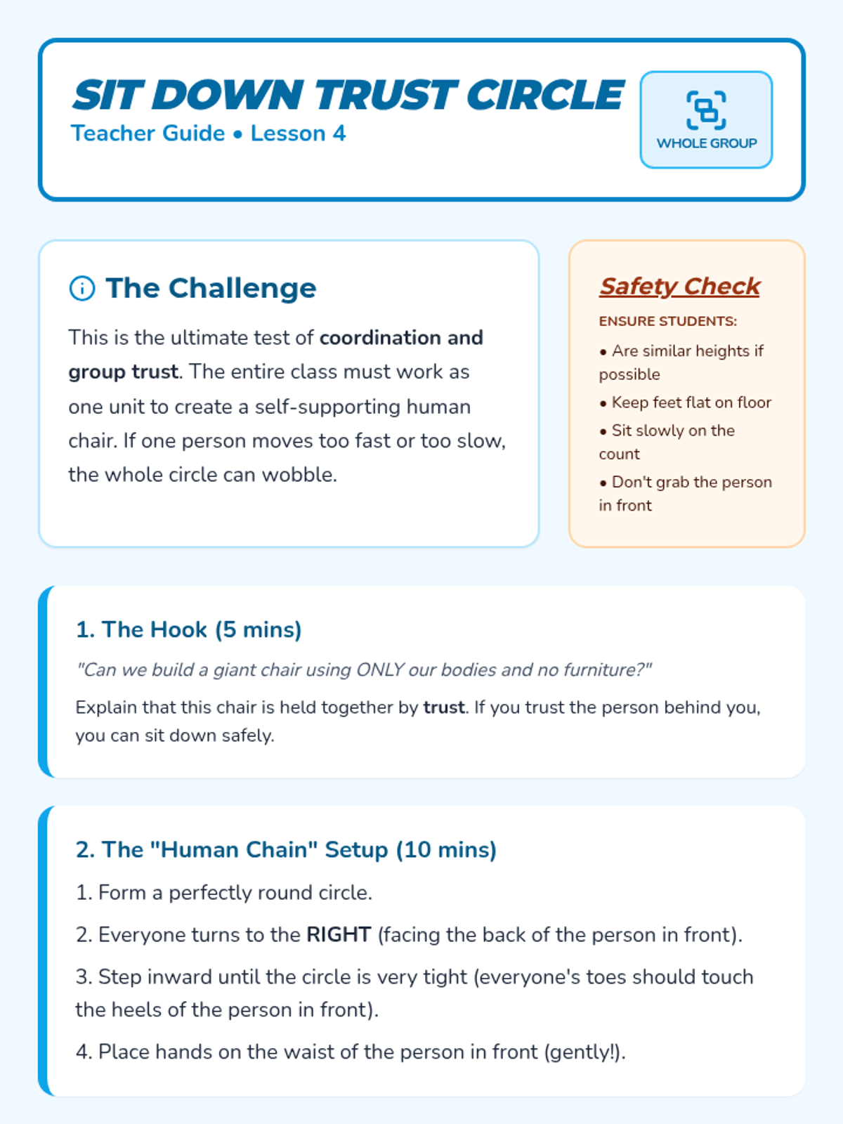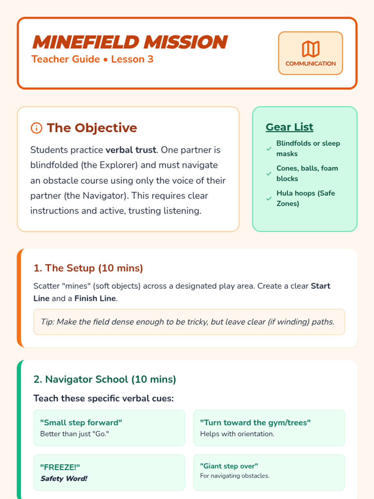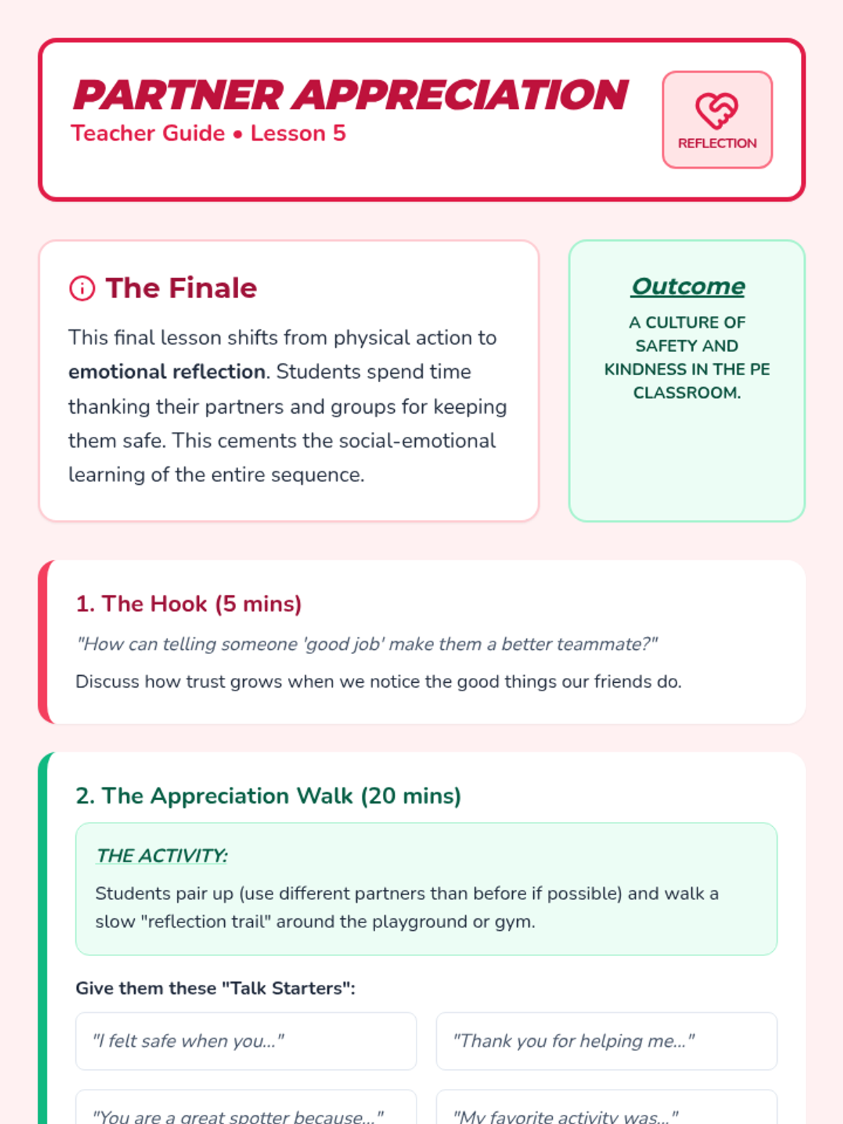 A 1st-grade physical education sequence focusing on trust, safety, and peer support through low-risk outdoor adventure activities. Students progress from learning individual safety responsibilities to group-wide trust exercises and reflective appreciation.