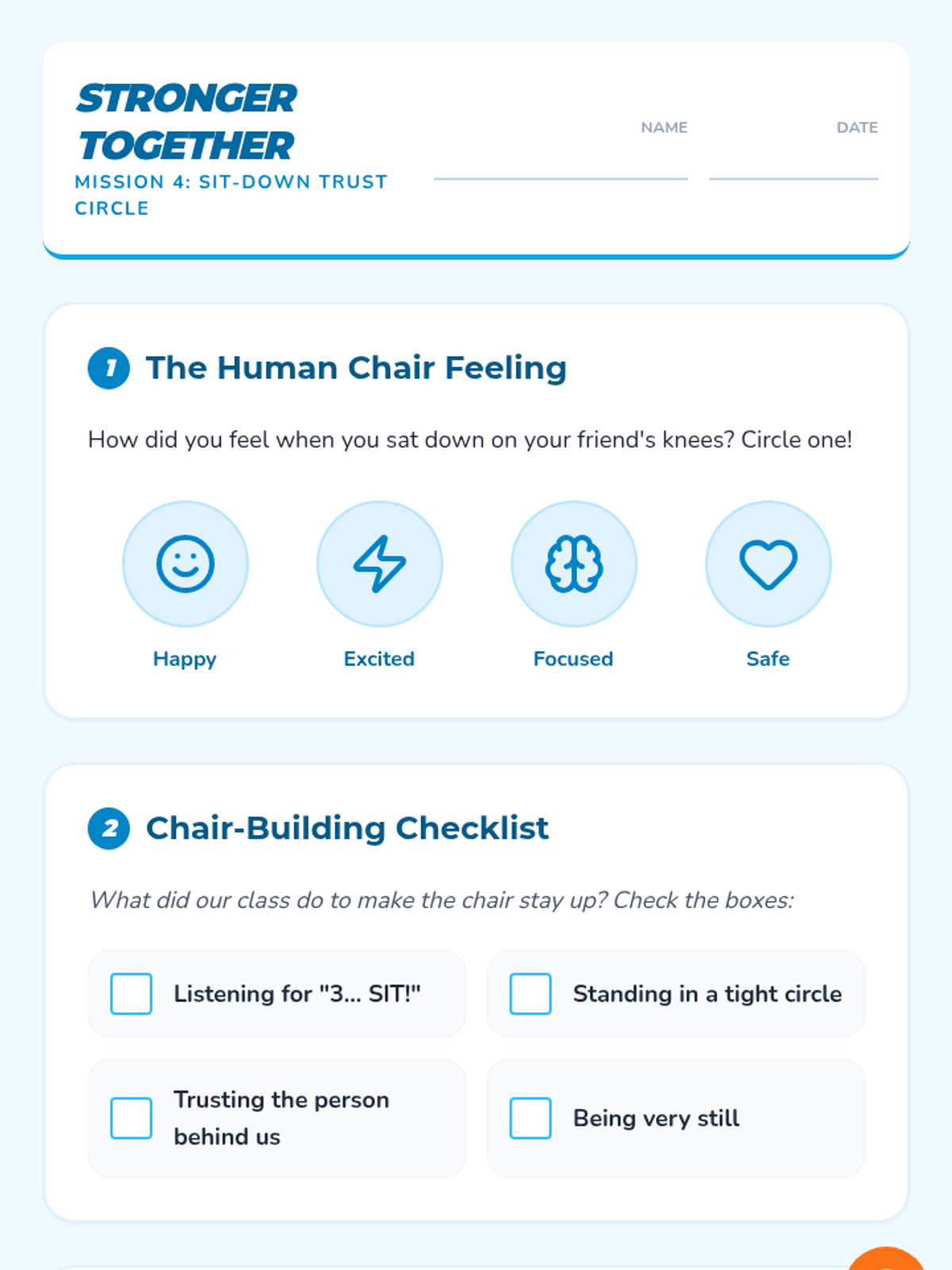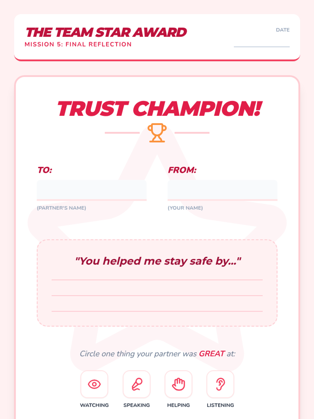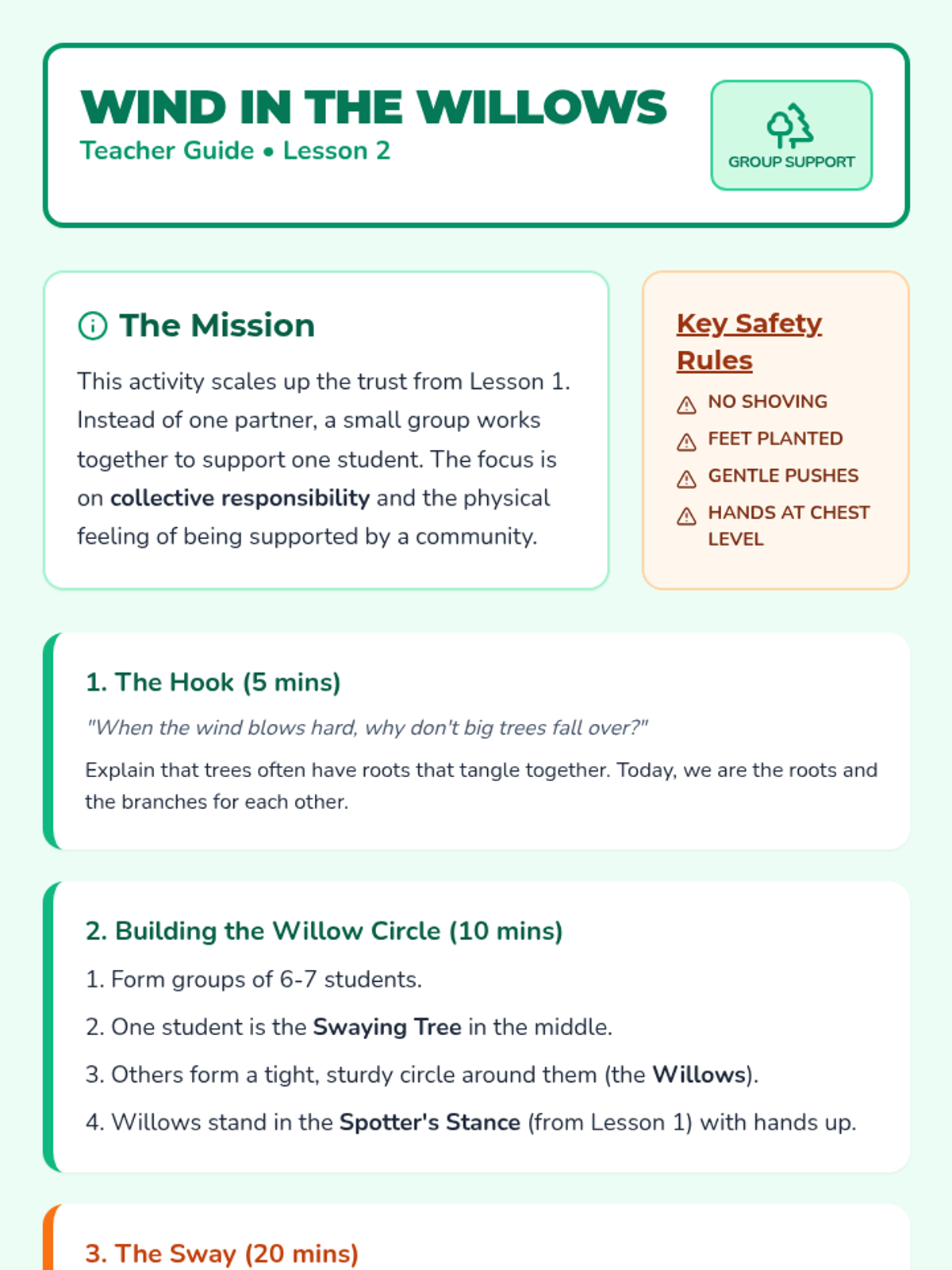 A 1st-grade physical education sequence focusing on trust, safety, and peer support through low-risk outdoor adventure activities. Students progress from learning individual safety responsibilities to group-wide trust exercises and reflective appreciation.