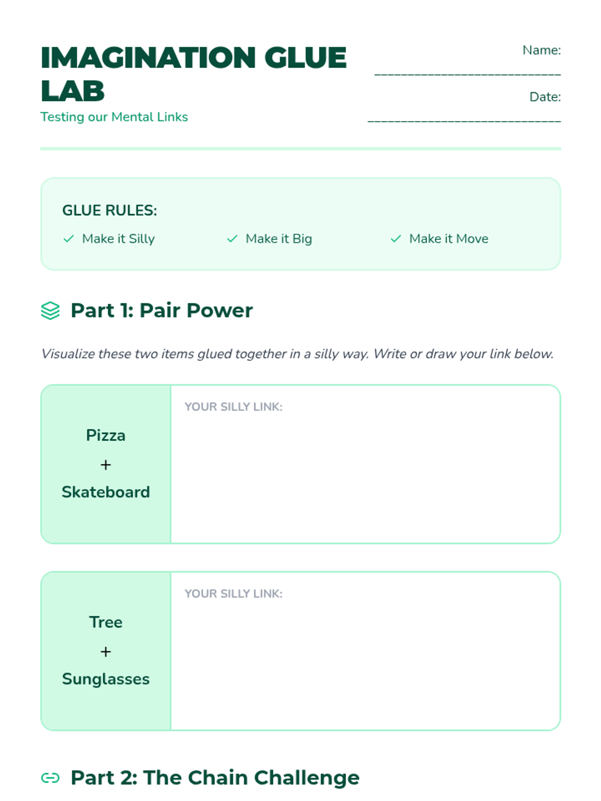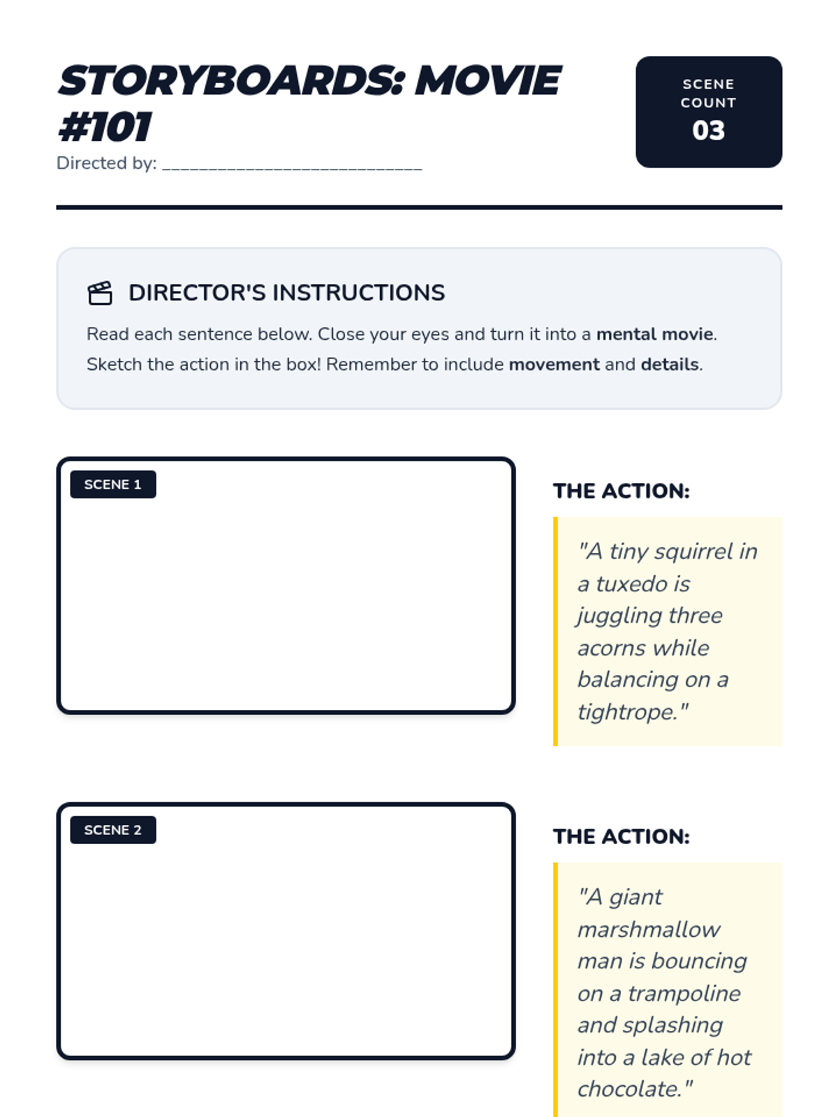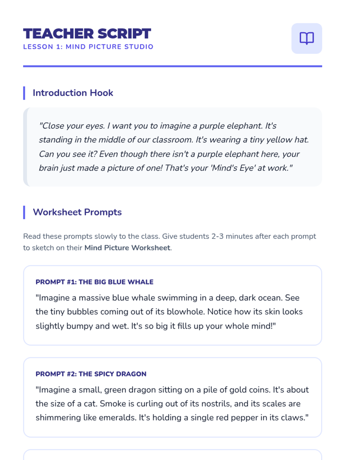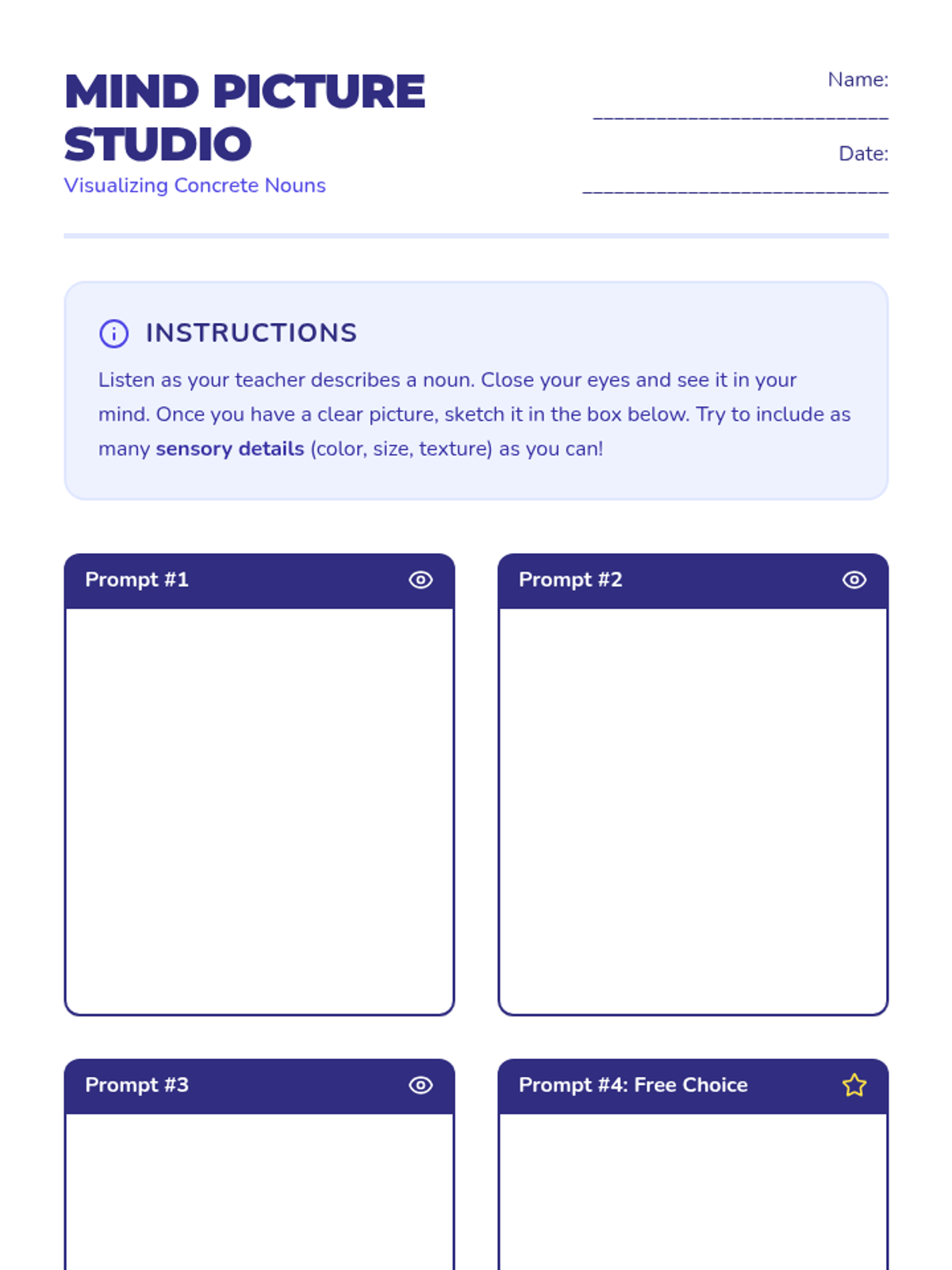 This sequence introduces 3rd-grade students to mental imagery and the 'Link Method' mnemonic device. Students progress from visualizing simple nouns to constructing complex 'mental movies' and applying these skills to retain informational text and lists of up to 10 items.