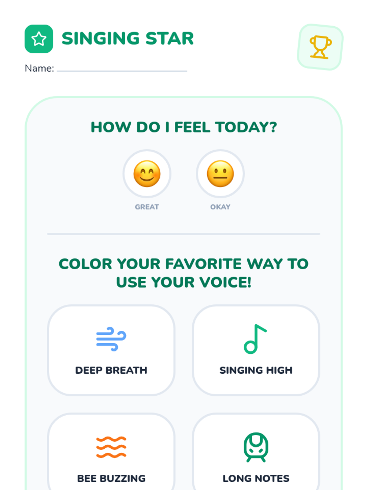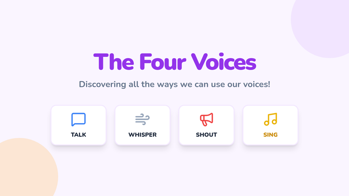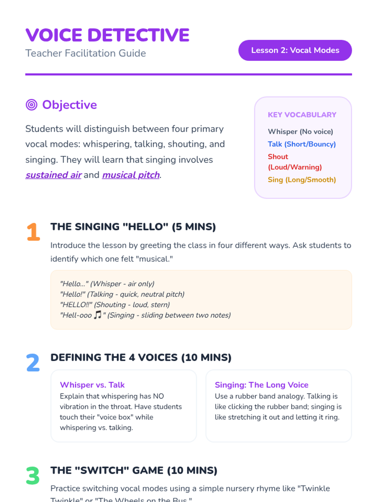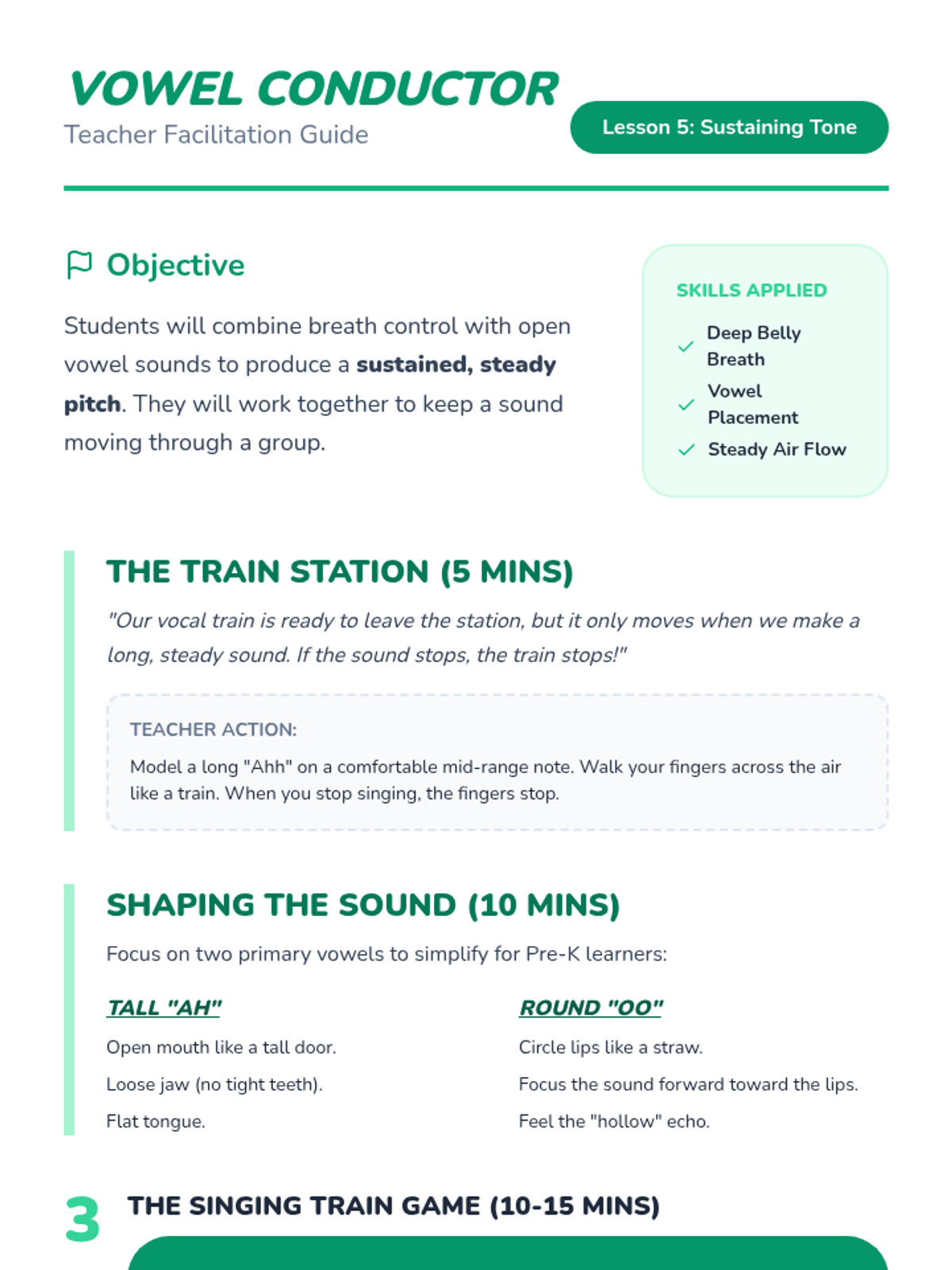 A foundational music sequence for Pre-K students to explore the physical mechanics of their voice through play, movement, and sensory awareness. Students learn about breath, pitch, timbre, and the difference between speaking and singing.