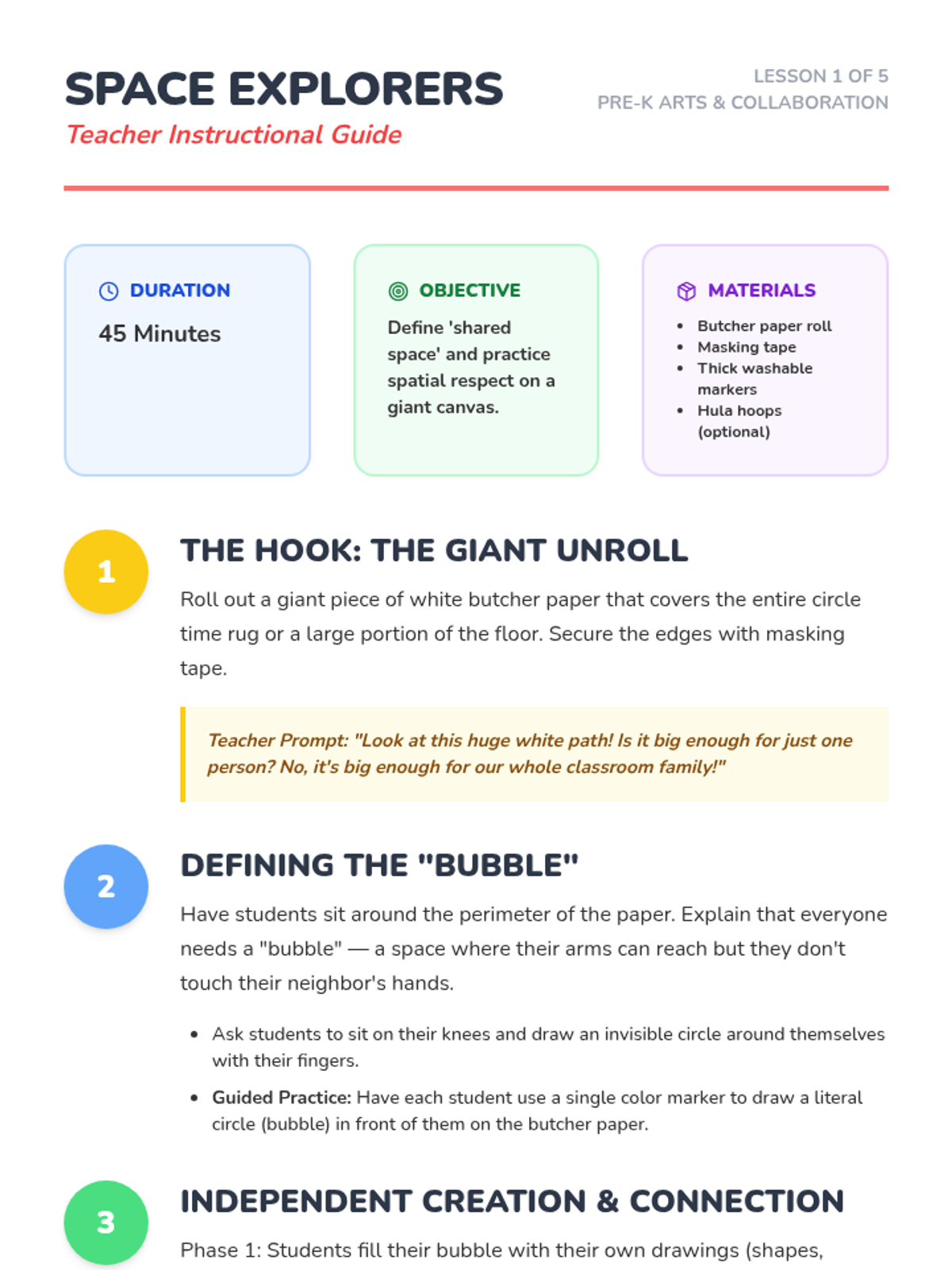 A Pre-K sequence focused on collaborative art-making, teaching students flexibility, shared ownership, and the joy of creating together. through 'pass-the-art' games and team projects.