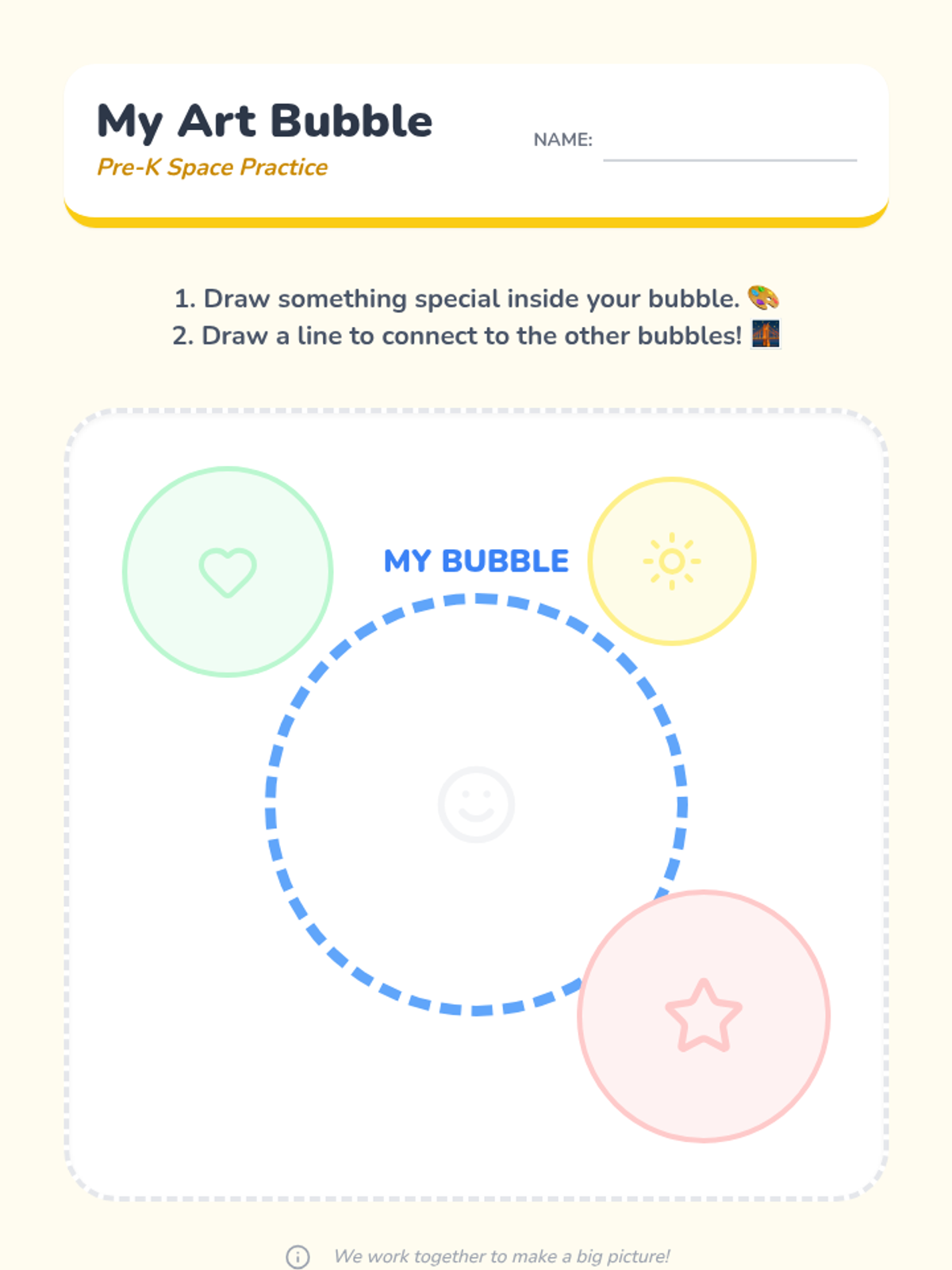 This Pre-K art sequence guides students through the cooperative process of creating a giant classroom mural. Students progress from individual 'drawing bubbles' to shared painting and collage, learning to communicate, share resources, and respect the artistic contributions of their peers.