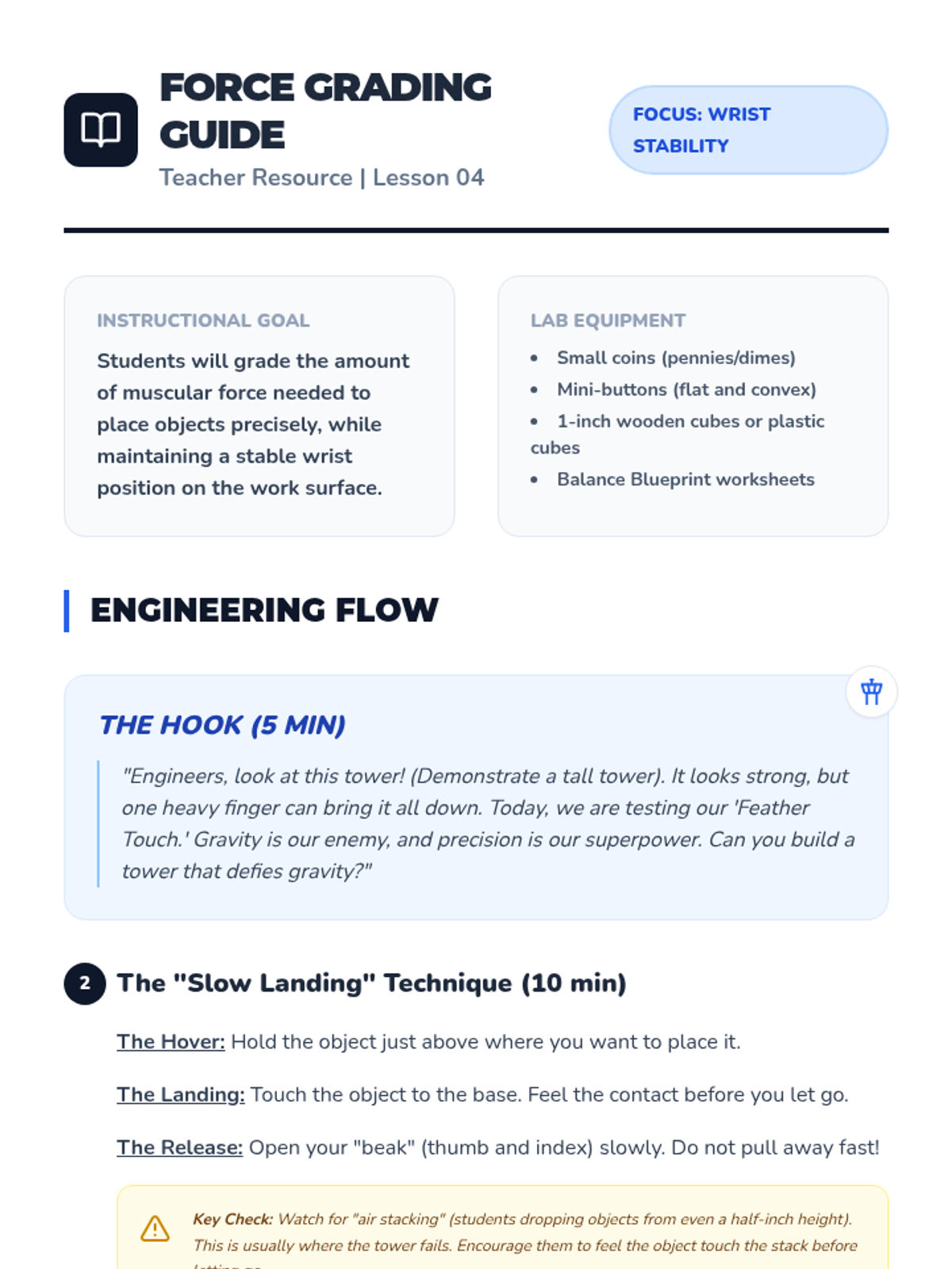 A dedicated training module focusing on executive function skills for K-2 students. Includes lessons on Focus (The Flashlight), Inhibition (The Stop Signal), Initiation (The Start Engine), Working Memory (The Recorder), Planning (The Mapmaker), Flexibility (The Play-Doh), and Emotional Control (The Volume Remote).