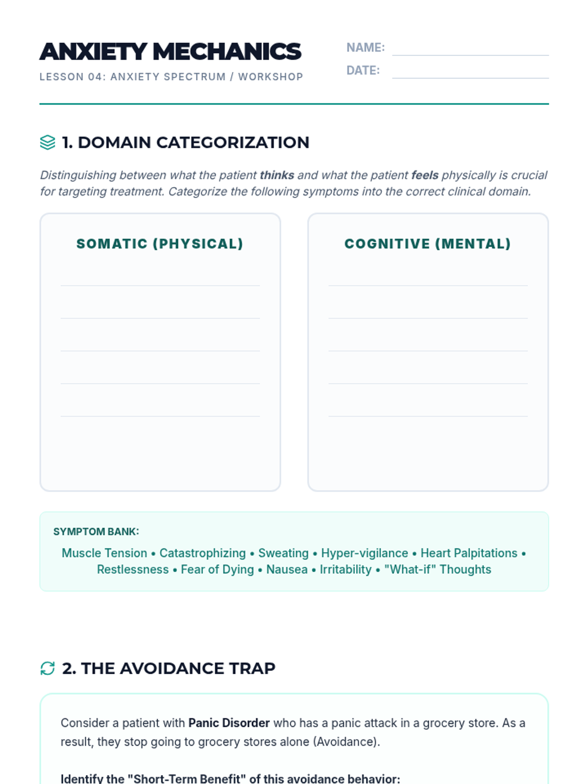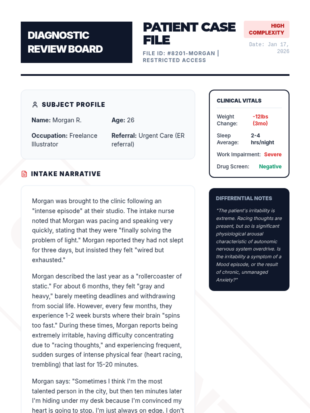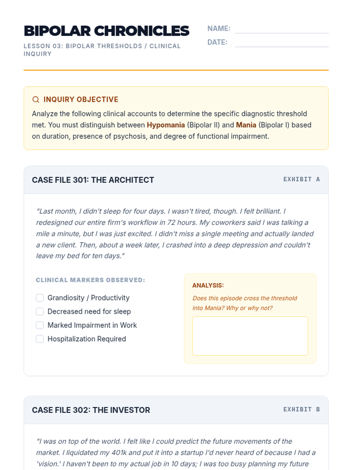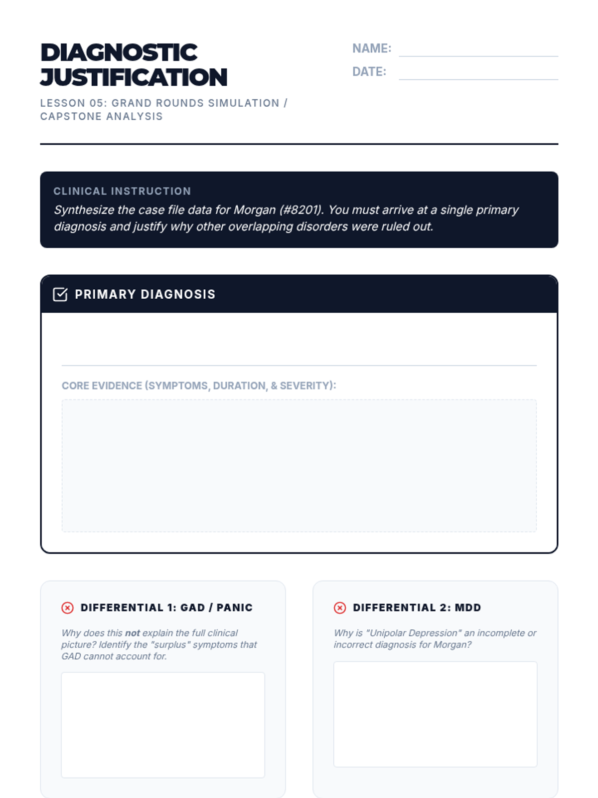 This undergraduate psychology sequence trains students in the nuanced clinical skill of differential diagnosis for anxiety and mood disorders. Students progress from basic DSM-5 navigation to complex case formulations, emphasizing the evaluation of symptom severity, duration, and functional impairment.