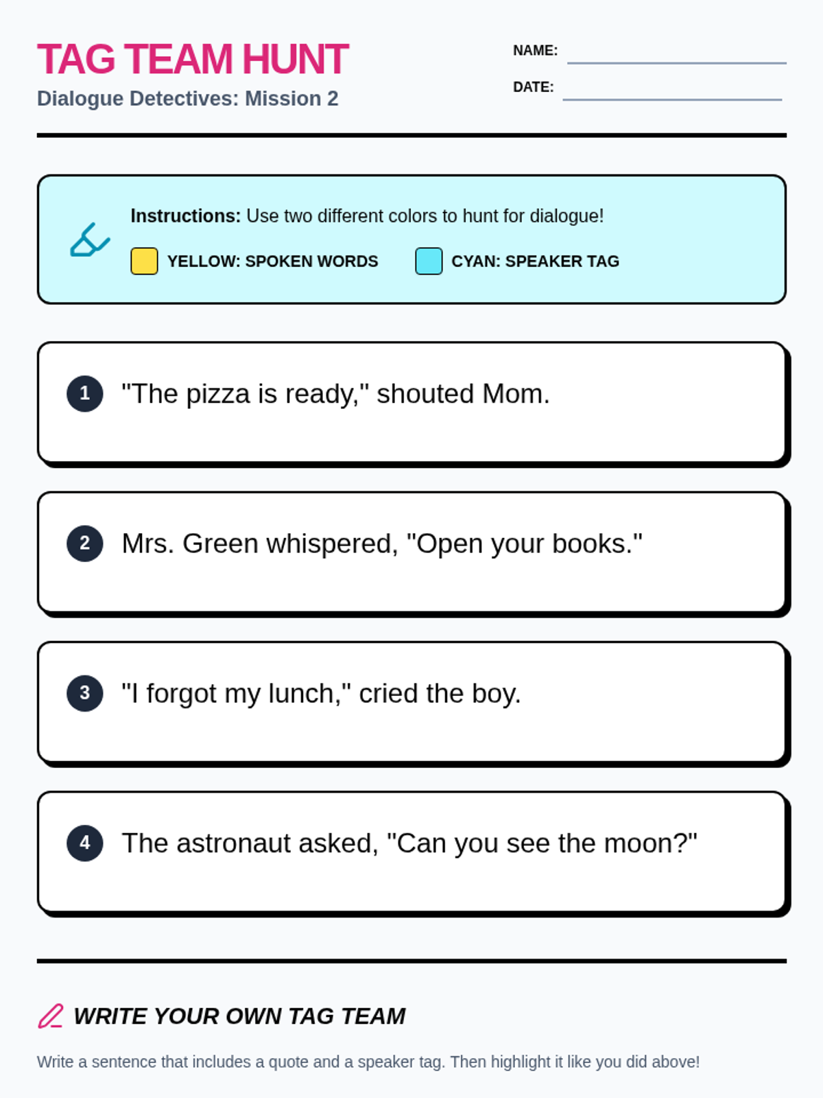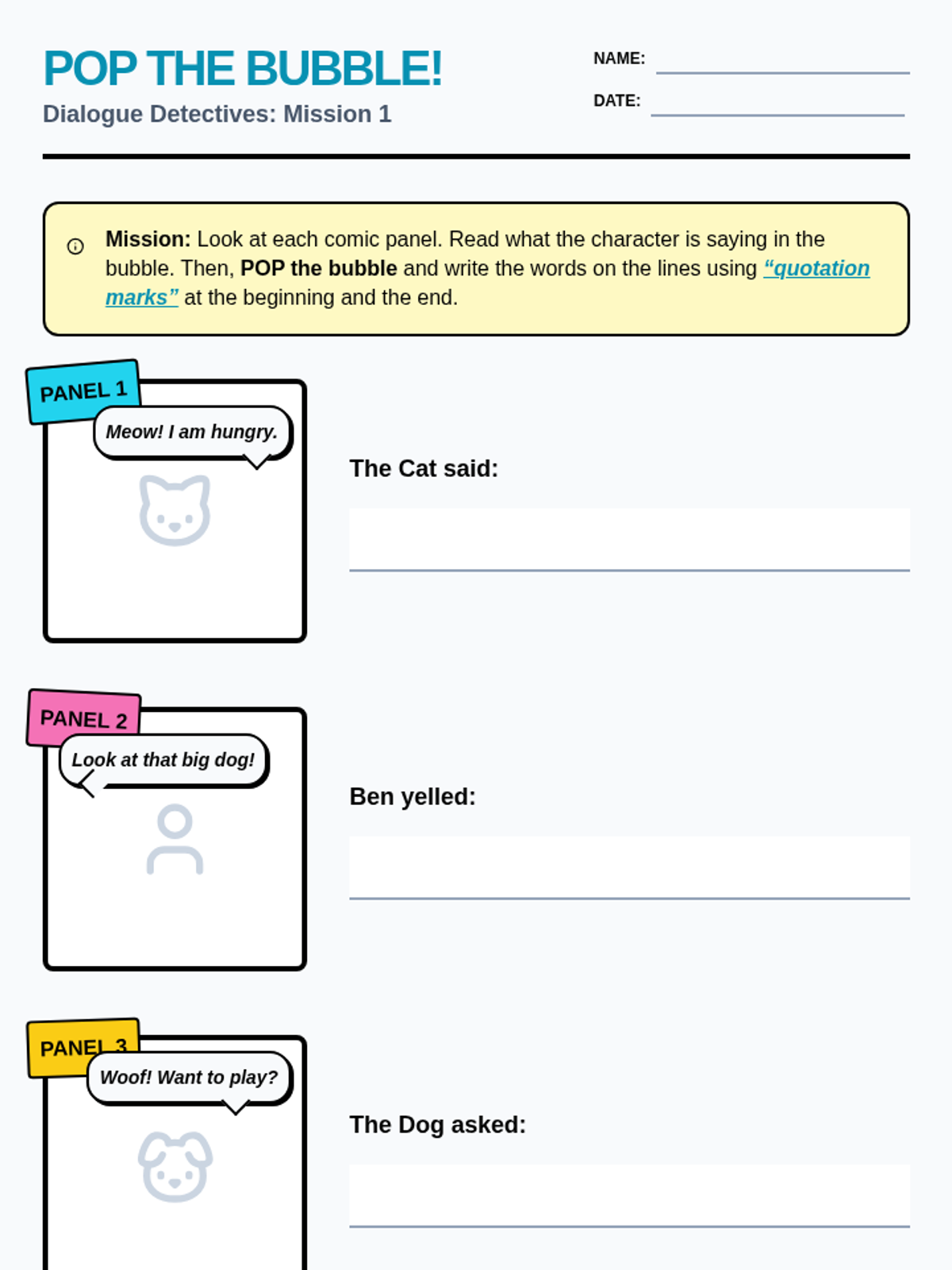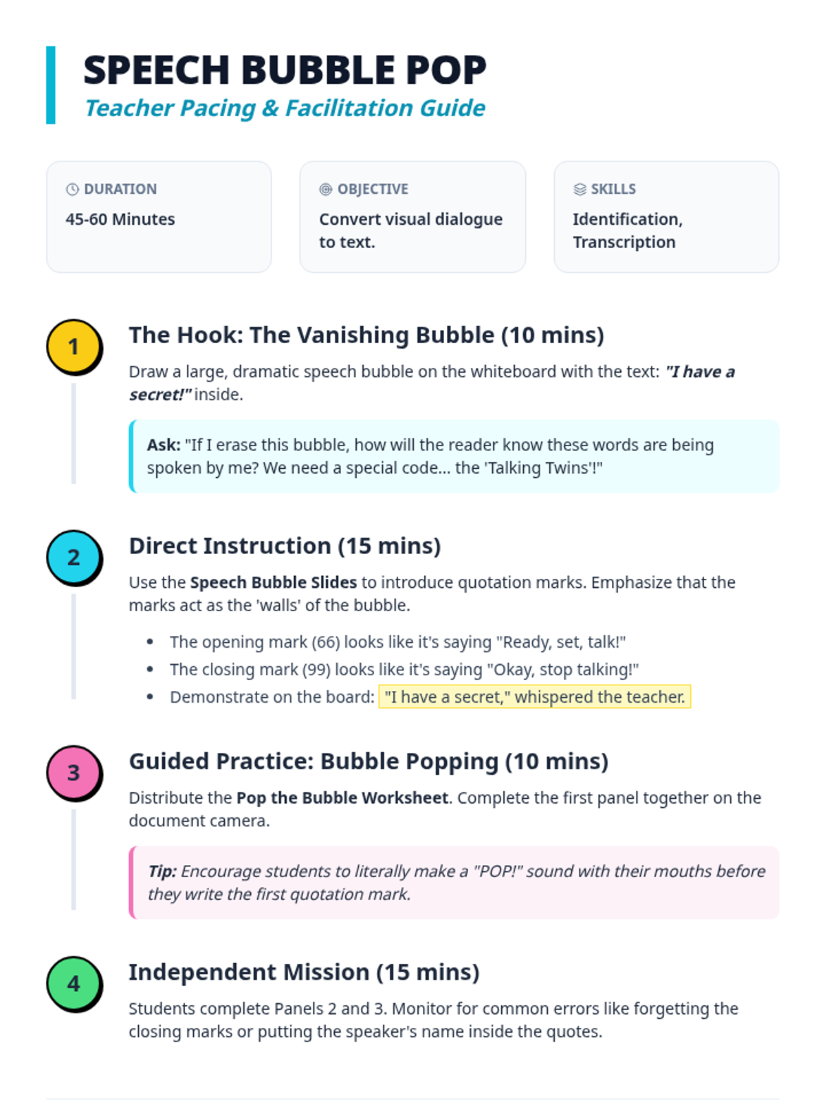 A 2nd-grade grammar sequence that transitions students from visual speech bubbles to written quotation marks, focusing on identifying direct speech, speaker tags, and correct punctuation placement.
